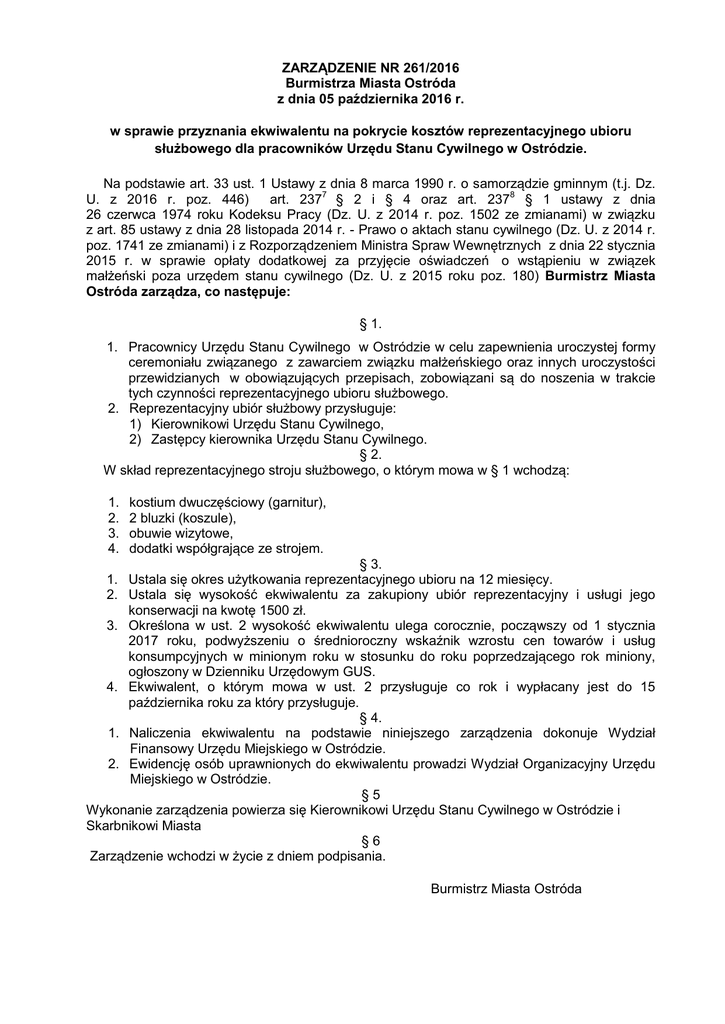 ZARZĄDZENIE NR 261/2016 Burmistrza Miasta Ostróda z dnia 05 października 2016 r. w sprawie przyznania ekwiwalentu na pokrycie kosztów reprezentacyjnego ubioru służbowego dla pracowników Urzędu Stanu Cywilnego w Ostródzie. Na podstawie art. 33 ust. 1 Ustawy z dnia 8 marca 1990 r. o samorządzie gminnym (t.j. Dz. U. z 2016 r. poz. 446) art. 2377 § 2 i § 4 oraz art. 2378 § 1 ustawy z dnia 26 czerwca 1974 roku Kodeksu Pracy (Dz. U. z 2014 r. poz. 1502 ze zmianami) w związku z art. 85 ustawy z dnia 28 listopada 2014 r. - Prawo o aktach stanu cywilnego (Dz. U. z 2014 r. poz. 1741 ze zmianami) i z Rozporządzeniem Ministra Spraw Wewnętrznych z dnia 22 stycznia 2015 r. w sprawie opłaty dodatkowej za przyjęcie oświadczeń o wstąpieniu w związek małżeński poza urzędem stanu cywilnego (Dz. U. z 2015 roku poz. 180) Burmistrz Miasta Ostróda zarządza, co następuje: § 1. 1. Pracownicy Urzędu Stanu Cywilnego w Ostródzie w celu zapewnienia uroczystej formy ceremoniału związanego z zawarciem związku małżeńskiego oraz innych uroczystości przewidzianych w obowiązujących przepisach, zobowiązani są do noszenia w trakcie tych czynności reprezentacyjnego ubioru służbowego. 2. Reprezentacyjny ubiór służbowy przysługuje: 1) Kierownikowi Urzędu Stanu Cywilnego, 2) Zastępcy kierownika Urzędu Stanu Cywilnego. § 2. W skład reprezentacyjnego stroju służbowego, o którym mowa w § 1 wchodzą: 1. 2. 3. 4. kostium dwuczęściowy (garnitur), 2 bluzki (koszule), obuwie wizytowe, dodatki współgrające ze strojem. § 3. 1. Ustala się okres użytkowania reprezentacyjnego ubioru na 12 miesięcy. 2. Ustala się wysokość ekwiwalentu za zakupiony ubiór reprezentacyjny i usługi jego konserwacji na kwotę 1500 zł. 3. Określona w ust. 2 wysokość ekwiwalentu ulega corocznie, począwszy od 1 stycznia 2017 roku, podwyższeniu o średnioroczny wskaźnik wzrostu cen towarów i usług konsumpcyjnych w minionym roku w stosunku do roku poprzedzającego rok miniony, ogłoszony w Dzienniku Urzędowym GUS. 4. Ekwiwalent, o którym mowa w ust. 2 przysługuje co rok i wypłacany jest do 15 października roku za który przysługuje. § 4. 1. Naliczenia ekwiwalentu na podstawie niniejszego zarządzenia dokonuje Wydział Finansowy Urzędu Miejskiego w Ostródzie. 2. Ewidencję osób uprawnionych do ekwiwalentu prowadzi Wydział Organizacyjny Urzędu Miejskiego w Ostródzie. §5 Wykonanie zarządzenia powierza się Kierownikowi Urzędu Stanu Cywilnego w Ostródzie i Skarbnikowi Miasta §6 Zarządzenie wchodzi w życie z dniem podpisania. Burmistrz Miasta Ostróda