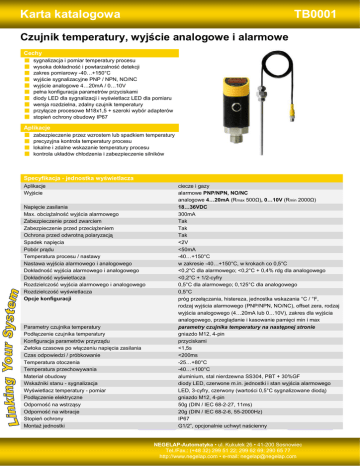 Karta katalogowa TB0001 Czujnik temperatury, wyj!cie analogowe i alarmowe Cechy sygnalizacja i pomiar temperatury procesu wysoka dok adno12 i powtarzalno12 detekcji zakres pomiarowy -40…+150°C wyj1cie sygnalizacyjne PNP / NPN, NO/NC wyj1cie analogowe 4…20mA / 0…10V pe na konfiguracja parametrów przyciskami diody LED dla sygnalizacji i wy1wietlacz LED dla pomiaru wersja rozdzielna, zdalny czujnik temperatury przy Acze procesowe M18x1,5 + szeroki wybór adapterów stopieD ochrony obudowy IP67 Aplikacje zabezpieczenie przez wzrostem lub spadkiem temperatury precyzyjna kontrola temperatury procesu lokalne i zdalne wskazanie temperatury procesu kontrola uk adów ch odzenia i zabezpieczenie silników Specyfikacja - jednostka wy!wietlacza Aplikacje Wyj1cie NapiIcie zasilania Max. obciAJalno12 wyj1cia alarmowego Zabezpieczenie przed zwarciem Zabezpieczenie przed przeciAJeniem Ochrona przed odwrotnA polaryzacjA Spadek napiIcia Pobór prAdu Temperatura procesu / nastawy Nastawa wyj1cia alarmowego i analogowego Dok adno12 wyj1cia alarmowego i analogowego Dok adno12 wy1wietlacza Rozdzielczo12 wyj1cia alarmowego i analogowego Rozdzielczo12 wy1wietlacza Opcje konfiguracji Parametry czujnika temperatury Pod Aczenie czujnika temperatury Konfiguracja parametrów przyrzAdu Zw oka czasowa po w Aczeniu napiIcia zasilania Czas odpowiedzi / próbkowanie Temperatura otoczenia Temperatura przechowywania Materia obudowy WskaPniki stanu - sygnalizacja Wy1wietlacz temperatury - pomiar Pod Aczenie elektryczne Odporno12 na wstrzAsy Odporno12 na wibracje StopieD ochrony MontaJ jednostki ciecze i gazy alarmowe PNP/NPN, NO/NC analogowe 4…20mA (Rmax 500H), 0…10V (Rmin 2000H) 18…36VDC 300mA Tak Tak Tak <2V <50mA -40…+150°C w zakresie -40…+150°C, w krokach co 0,5°C <0,2°C dla alarmowego; <0,2°C + 0,4% rdg dla analogowego <0,2°C + 1/2-cyfry 0,5°C dla alarmowego; 0,125°C dla analogowego 0,5°C próg prze Aczania, histereza, jednostka wskazania °C / °F, rodzaj wyj1cia alarmowego (PNP/NPN, NO/NC), offset zera, rodzaj wyj1cia analogowego (4…20mA lub 0…10V), zakres dla wyj1cia analogowego, przeglAdanie i kasowanie pamiIci min i max parametry czujnika temperatury na nast pnej stronie gniazdo M12, 4-pin przyciskami <1,5s <200ms -25…+80°C -40…+100°C aluminium, stal nierdzewna SS304, PBT + 30%GF diody LED, czerwone m.in. jednostki i stan wyj1cia alarmowego LED, 3-cyfry, czerwony (warto1ci 0,5°C sygnalizowane diodA) gniazdo M12, 4-pin 50g (DIN / IEC 68-2-27, 11ms) 20g (DIN / IEC 68-2-6, 55-2000Hz) IP67 G1/2”, opcjonalnie uchwyt na1cienny NEGELAP-Automatyka • ul. Kuku ek 26 • 41-200 Sosnowiec Tel./Fax.: (+48 32) 299 51 22; 299 62 69; 290 65 77 http://www.negelap.com • e-mail: [email protected] Karta katalogowa TB0001 Specyfikacja - czujnik temperatury Aplikacje Element pomiarowy Pobór prAdu Temperatura procesu Dok adno12 pomiaru Materia czujnika opcjonalnie Ci1nienie procesu Materia izolacji przewodu opcjonalnie D ugo12 przewodu czujnika D ugo12 zanurzenia opcjonalnie Trednica czujnika opcjonalnie Przy Acze procesowe opcjonalnie Temperatura otoczenia Temperatura przechowywania Pod Aczenie elektryczne czujnika Odporno12 na wstrzAsy Odporno12 na wibracje StopieD ochrony ciecze i gazy Pt1000 <1mA -40…+150°C 0,1°C stal nierdzewna SS304L stal nierdzewna SS316L lub inny materia max. 300bar FEP PVC, PUR, teflon lub inny materia 2m, 5m lub 10m 45mm, 160m, 260mm, 360mm d ugo12 zanurzenia wg wymagaD uJytkownika fi. 9mm 1rednica czujnika wg wymagaD uJytkownika G1/2”, gwint zewnItrzny przy Acze procesowe wg wymagaD uJytkownika -40…+150°C -40…+150°C wtyczka M12, 4-pin 50g (DIN / IEC 68-2-27, 11ms) 20g (DIN / IEC 68-2-6, 55-2000Hz) IP67 Wymiary (mm) / Widok wy!wietlacza Opis elementów wy wietlacza: 1 - dioda LED, wskazanie w jednostkach °C 2 - dioda LED, wskazanie w jednostkach °F 3 - stan wyj1cia PNP, 1wieci gdy wyj1cie aktywne 4 - stan wyj1cia NPN, 1wieci gdy wyj1cie aktywne 5 - wy1wietlacz LED mierzonej temperatury 6 - dioda LED, do wskazania doda2 0,5°C 7 - przycisk, nastawa warto1ci parametru 8 - przycisk, wybór parametru i potwierdzenie Uwagi do czujnika temperatury: L1 – d ugo12 przewodu pod Aczeniowego L2 – d ugo12 zanurzenia czujnika Schemat pod34czenia elektrycznego Kolory przewodów: 1 - BN: brAzowy 2 - WH: bia y 3 - BU: niebieski 4 - BK: czarny Gniazdo M12, 4-pin: NEGELAP-Automatyka • ul. Kuku ek 26 • 41-200 Sosnowiec Tel./Fax.: (+48 32) 299 51 22; 299 62 69; 290 65 77 http://www.negelap.com • e-mail: [email protected] Karta katalogowa TB0001 AKCESORIA – przewody i wtyczki pod34czeniowe dla czujników temperatury Przewód z wtyczk prost Przewód z wtyczk k tow Wtyczka rozbieralna prosta Wtyczka rozbieralna k towa C…I4C12 C…L4C12 US0013 US0014 Uwagi: Dost pne przewody o d ugo ci 2m, 5m, 10m lub 25m. Sposób zamawiania TB0001 Jednostka wy1wietlacza, czujnik rozdzielny, wyj!cie PNP/NPN, NO/NC + 4…20mA / 0…10V TD0000 Czujnik temperatury, przy Acze procesowe G1/2”, d ugo12 zanurzenia 45mm, d ugo12 przewodu 2m TD0001 Czujnik temperatury, przy Acze procesowe G1/2”, d ugo12 zanurzenia 160mm, d ugo12 przewodu 2m TD0002 Czujnik temperatury, przy Acze procesowe G1/2”, d ugo12 zanurzenia 260mm, d ugo12 przewodu 2m TD0003 Czujnik temperatury, przy Acze procesowe G1/2”, d ugo12 zanurzenia 360mm, d ugo12 przewodu 2m TD0100 Czujnik temperatury, przy Acze procesowe G1/2”, d ugo12 zanurzenia 45mm, d ugo12 przewodu 5m TD0101 Czujnik temperatury, przy Acze procesowe G1/2”, d ugo12 zanurzenia 160mm, d ugo12 przewodu 5m TD0102 Czujnik temperatury, przy Acze procesowe G1/2”, d ugo12 zanurzenia 260mm, d ugo12 przewodu 5m TD0103 Czujnik temperatury, przy Acze procesowe G1/2”, d ugo12 zanurzenia 360mm, d ugo12 przewodu 5m TD0200 Czujnik temperatury, przy Acze procesowe G1/2”, d ugo12 zanurzenia 45mm, d ugo12 przewodu 10m TD0201 Czujnik temperatury, przy Acze procesowe G1/2”, d ugo12 zanurzenia 160mm, d ugo12 przewodu 10m TD0202 Czujnik temperatury, przy Acze