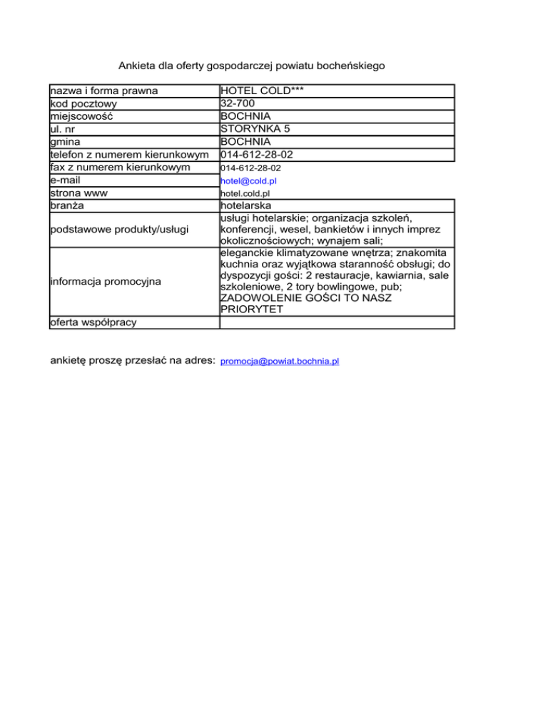 Ankieta dla oferty gospodarczej powiatu bocheńskiego nazwa i forma prawna kod pocztowy miejscowość ul. nr gmina telefon z numerem kierunkowym fax z numerem kierunkowym e-mail strona www branża podstawowe produkty/usługi informacja promocyjna HOTEL COLD*** 32-700 BOCHNIA STORYNKA 5 BOCHNIA 014-612-28-02 014-612-28-02 [email protected] hotel.cold.pl hotelarska usługi hotelarskie; organizacja szkoleń, konferencji, wesel, bankietów i innych imprez okolicznościowych; wynajem sali; eleganckie klimatyzowane wnętrza; znakomita kuchnia oraz wyjątkowa staranność obsługi; do dyspozycji gości: 2 restauracje, kawiarnia, sale szkoleniowe, 2 tory bowlingowe, pub; ZADOWOLENIE GOŚCI TO NASZ PRIORYTET oferta współpracy ankietę proszę przesłać na adres: [email protected] Ankieta dla oferty gospodarczej powiatu oświęcimskiego nazwa i forma prawna kod pocztowy miejscowość ul. nr gmina telefon z numerem kierunkowym fax z numerem kierunkowym e-mail strona www branża podstawowe produkty/usługi informacja promocyjna oferta współpracy ankietę proszę przesłać na adres: "Fenix" PPHU Spółka Cywilna 32-650 Kęty Bulwarowa 8 Kęty (033)854-33-51 (033)854-33-52 [email protected] www.fenix.pl budowlana, transportowa materiały budowlne, usługi budowlne, transport materiałów budowlanych Firma oferuje szeroki asortyment materiałów budowlanych, świadczy usługi budowy domów "pod klucz" oraz wykonuje drobne i kompleksowe remonty budynków. Upusty dla stałych klientów. Posiadam 200 m wolnej powierzchni magazynowej. Poszukuję dostawców stolarki budowlanej. Zatrudnię 10 murarzy do pracy sezonowej [email protected]