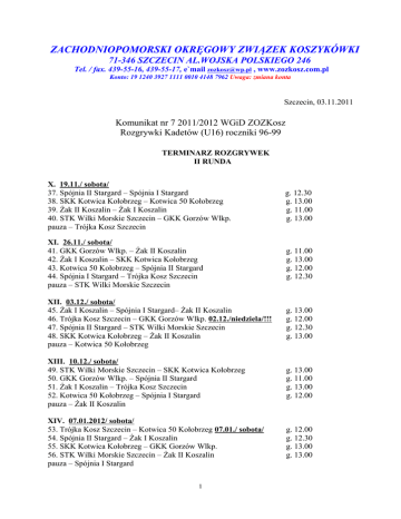 ZACHODNIOPOMORSKI OKRĘGOWY ZWIĄZEK KOSZYKÓWKI 71-346 SZCZECIN AL.WOJSKA POLSKIEGO 246 Tel. / fax. 439-55-16, 439-55-17, e`mail [email protected] , www.zozkosz.com.pl Konto: 19 1240 3927 1111 0010 4148 7962 Uwaga: zmiana konta Szczecin, 03.11.2011 Komunikat nr 7 2011/2012 WGiD ZOZKosz Rozgrywki Kadetów (U16) roczniki 96-99 TERMINARZ ROZGRYWEK II RUNDA X. 19.11./ sobota/ 37. Spójnia II Stargard – Spójnia I Stargard 38. SKK Kotwica Kołobrzeg – Kotwica 50 Kołobrzeg 39. Żak II Koszalin – Żak I Koszalin 40. STK Wilki Morskie Szczecin – GKK Gorzów Wlkp. pauza – Trójka Kosz Szczecin g. 12.30 g. 13.00 g. 11.00 g. 13.00 XI. 26.11./ sobota/ 41. GKK Gorzów Wlkp. – Żak II Koszalin 42. Żak I Koszalin – SKK Kotwica Kołobrzeg 43. Kotwica 50 Kołobrzeg – Spójnia II Stargard 44. Spójnia I Stargard – Trójka Kosz Szczecin pauza – STK Wilki Morskie Szczecin g. 11.00 g. 13.00 g. 12.00 g. 12.30 XII. 03.12./ sobota/ 45. Żak I Koszalin – Spójnia I Stargard– Żak II Koszalin 46. Trójka Kosz Szczecin – GKK Gorzów Wlkp. 02.12./niedziela/!!! 47. Spójnia II Stargard – STK Wilki Morskie Szczecin 48. SKK Kotwica Kołobrzeg – Żak II Koszalin pauza – Kotwica 50 Kołobrzeg g. 13.00 g. 12.00 g. 12.30 g. 13.00 XIII. 10.12./ sobota/ 49. STK Wilki Morskie Szczecin – SKK Kotwica Kołobrzeg 50. GKK Gorzów Wlkp. – Spójnia II Stargard 51. Żak I Koszalin – Trójka Kosz Szczecin 52. Kotwica 50 Kołobrzeg – Spójnia I Stargard pauza – Żak II Koszalin g. 13.00 g. 11.00 g. 13.00 g. 12.00 XIV. 07.01.2012/ sobota/ 53. Trójka Kosz Szczecin – Kotwica 50 Kołobrzeg 07.01./ sobota/ 54. Spójnia II Stargard – Żak I Koszalin 55. SKK Kotwica Kołobrzeg – GKK Gorzów Wlkp. 56. STK Wilki Morskie Szczecin – Żak II Koszalin pauza – Spójnia I Stargard g. 12.00 g. 12.30 g. 13.00 g. 13.00 1 XV. 04.02.2012/ sobota/ 57. Żak II Koszalin – Spójnia II Stargard 58. STK Wilki Morskie Szczecin – Trójka Kosz Szczecin 59. GKK Gorzów Wlkp. – Spójnia I Stargard 60. Żak I Koszalin – Kotwica 50 Kołobrzeg pauza – SKK Kotwica Kołobrzeg g. 11.00 g. 13.00 g. 11.00 g. 13.00 XVI. 11.02.2012/ sobota/ 61. Kotwica 50 Kołobrzeg – GKK Gorzów Wlkp. g. 12.00 62. Spójnia I Stargard – STK Wilki Morskie Szczecin 12.02./niedziela/!!! g. 11.00 63. Trójka Kosz Szczecin – Żak II Koszalin g. 12.00 64. Spójnia II Stargard – SKK Kotwica Kołobrzeg g. 12.30 pauza – Żak I Koszalin XVII. 18.02.2012/ sobota/ 65. Żak I Koszalin – STK Wilki Morskie Szczecin 66. Kotwica 50 Kołobrzeg – Żak II Koszalin 67. Spójnia I Stargard – SKK Kotwica Kołobrzeg 68. Trójka Kosz Szczecin – Spójnia II Stargard 19.02./niedziela/!!! pauza – GKK Gorzów Wlkp. g. 13.00 g. 12.00 g. 12.30 g. 12.00 XVIII. 03.03.2012/ sobota/ 69. SKK Kotwica Kołobrzeg – Trójka Kosz Szczecin 70. Żak II Koszalin – Spójnia I Stargard 71. STK Wilki Morskie Szczecin – Kotwica 50 Kołobrzeg 72. GKK Gorzów Wlkp. – Żak I Koszalin pauza – Spójnia II Stargard g. 13.00 g. 11.00 g. 13.00 g. 11.00 Terminy rozgrywek z Wielkopolską 16-18.03. i 30.03 - 01.04.2012 Terminy na szczeblu centralnym: Półfinały 20 - 22.04.2012 Finał 19 - 27.05.2012 W terminarzu I rundy w VIII kolejce mecz STK Wilki Morskie Szczecin – Żak I Koszalin jest 08.10./wtorek/!!!, ma być 08.11./wtorek/!!!. WICEPREZES ZOZKosz Przewodniczący WGiD / - / Jerzy Buczkowski Otrzymują: • Kluby • PZKosz • WZKosz Poznań • Kolegium Sędziów ZOZKosz 2