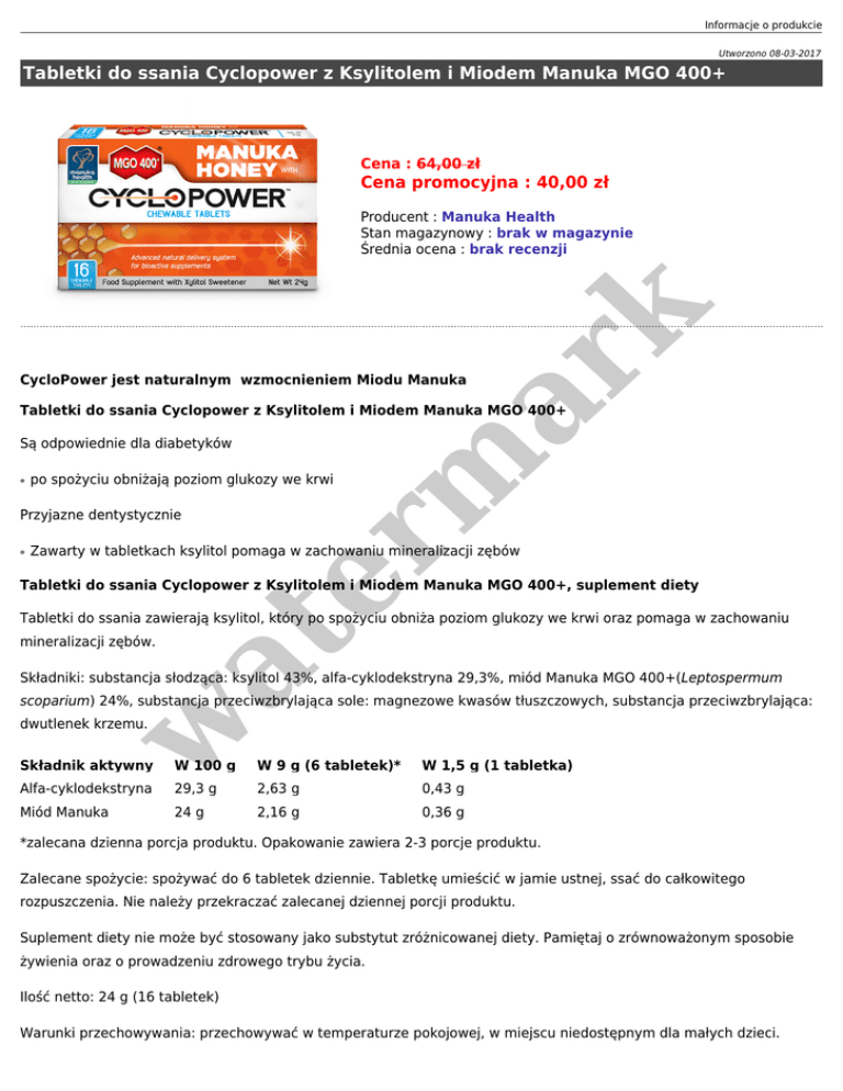 Informacje o produkcie Utworzono 08-03-2017 Tabletki do ssania Cyclopower z Ksylitolem i Miodem Manuka MGO 400+ Cena : 64,00 zł Cena promocyjna : 40,00 zł er m ar k Producent : Manuka Health Stan magazynowy : brak w magazynie Średnia ocena : brak recenzji CycloPower jest naturalnym wzmocnieniem Miodu Manuka Tabletki do ssania Cyclopower z Ksylitolem i Miodem Manuka MGO 400+ Są odpowiednie dla diabetyków ● po spożyciu obniżają poziom glukozy we krwi Przyjazne dentystycznie ● Zawarty w tabletkach ksylitol pomaga w zachowaniu mineralizacji zębów Tabletki do ssania Cyclopower z Ksylitolem i Miodem Manuka MGO 400+, suplement diety at Tabletki do ssania zawierają ksylitol, który po spożyciu obniża poziom glukozy we krwi oraz pomaga w zachowaniu mineralizacji zębów. Składniki: substancja słodząca: ksylitol 43%, alfa-cyklodekstryna 29,3%, miód Manuka MGO 400+(Leptospermum scoparium) 24%, substancja przeciwzbrylająca sole: magnezowe kwasów tłuszczowych, substancja przeciwzbrylająca: w dwutlenek krzemu. Składnik aktywny W 100 g W 9 g (6 tabletek)* W 1,5 g (1 tabletka) Alfa-cyklodekstryna 29,3 g 2,63 g 0,43 g Miód Manuka 24 g 2,16 g 0,36 g *zalecana dzienna porcja produktu. Opakowanie zawiera 2-3 porcje produktu. Zalecane spożycie: spożywać do 6 tabletek dziennie. Tabletkę umieścić w jamie ustnej, ssać do całkowitego rozpuszczenia. Nie należy przekraczać zalecanej dziennej porcji produktu. Suplement diety nie może być stosowany jako substytut zróżnicowanej diety. Pamiętaj o zrównoważonym sposobie żywienia oraz o prowadzeniu zdrowego trybu życia. Ilość netto: 24 g (16 tabletek) Warunki przechowywania: przechowywać w temperaturze pokojowej, w miejscu niedostępnym dla małych dzieci. Dystrybutor: Propharma sp. z o.o. ul. Kierbedzia 4, 00-728 Warszawa w at er m ar k Producent: Manuka Health 34 Hannigan Drive, Saint Johns Auckland 1072, Nowa Zelandia