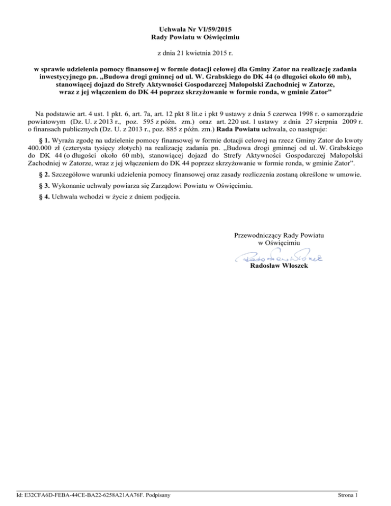 Uchwała Nr VI/59/2015 Rady Powiatu w Oświęcimiu z dnia 21 kwietnia 2015 r. w sprawie udzielenia pomocy finansowej w formie dotacji celowej dla Gminy Zator na realizację zadania inwestycyjnego pn. „Budowa drogi gminnej od ul. W. Grabskiego do DK 44 (o długości około 60 mb), stanowiącej dojazd do Strefy Aktywności Gospodarczej Małopolski Zachodniej w Zatorze, wraz z jej włączeniem do DK 44 poprzez skrzyżowanie w formie ronda, w gminie Zator” Na podstawie art. 4 ust. 1 pkt. 6, art. 7a, art. 12 pkt 8 lit.e i pkt 9 ustawy z dnia 5 czerwca 1998 r. o samorządzie powiatowym (Dz. U. z 2013 r., poz. 595 z późn. zm.) oraz art. 220 ust. 1 ustawy z dnia 27 sierpnia 2009 r. o finansach publicznych (Dz. U. z 2013 r., poz. 885 z późn. zm.) Rada Powiatu uchwala, co następuje: § 1. Wyraża zgodę na udzielenie pomocy finansowej w formie dotacji celowej na rzecz Gminy Zator do kwoty 400.000 zł (czterysta tysięcy złotych) na realizację zadania pn. „Budowa drogi gminnej od ul. W. Grabskiego do DK 44 (o długości około 60 mb), stanowiącej dojazd do Strefy Aktywności Gospodarczej Małopolski Zachodniej w Zatorze, wraz z jej włączeniem do DK 44 poprzez skrzyżowanie w formie ronda, w gminie Zator”. § 2. Szczegółowe warunki udzielenia pomocy finansowej oraz zasady rozliczenia zostaną określone w umowie. § 3. Wykonanie uchwały powiarza się Zarządowi Powiatu w Oświęcimiu. § 4. Uchwała wchodzi w życie z dniem podjęcia. Przewodniczący Rady Powiatu w Oświęcimiu Radosław Włoszek Id: E32CFA6D-FEBA-44CE-BA22-6258A21AA76F. Podpisany Strona 1 Uzasadnienie Burmistrz Zatora zwrócił się do Starosty Oświęcimskiego z wnioskiem o dofinansowanie zadania pn. „Budowa drogi gminnej od ul. W. Grabskiego do DK 44 (o długości około 60 mb), stanowiącej dojazd do Strefy Aktywności Gospodarczej Małopolski Zachodniej w Zatorze, wraz z jej włączeniem do DK 44 poprzez skrzyżowanie w formie ronda, w gminie Zator”. Zakres ww. zadania obejmuje budowę drogi oraz ronda w ciągu drogi krajowej nr DK 44. Realizacja zadania umożliwi poprawę komunikacji przy Strefie Aktywności Gospodarczej Małopolski Zachodniej w Zatorze oraz Parku Rozrywki „Energylandia” oraz rozwój Strefy Aktywności Gospodarczej. Id: E32CFA6D-FEBA-44CE-BA22-6258A21AA76F. Podpisany Strona 1
