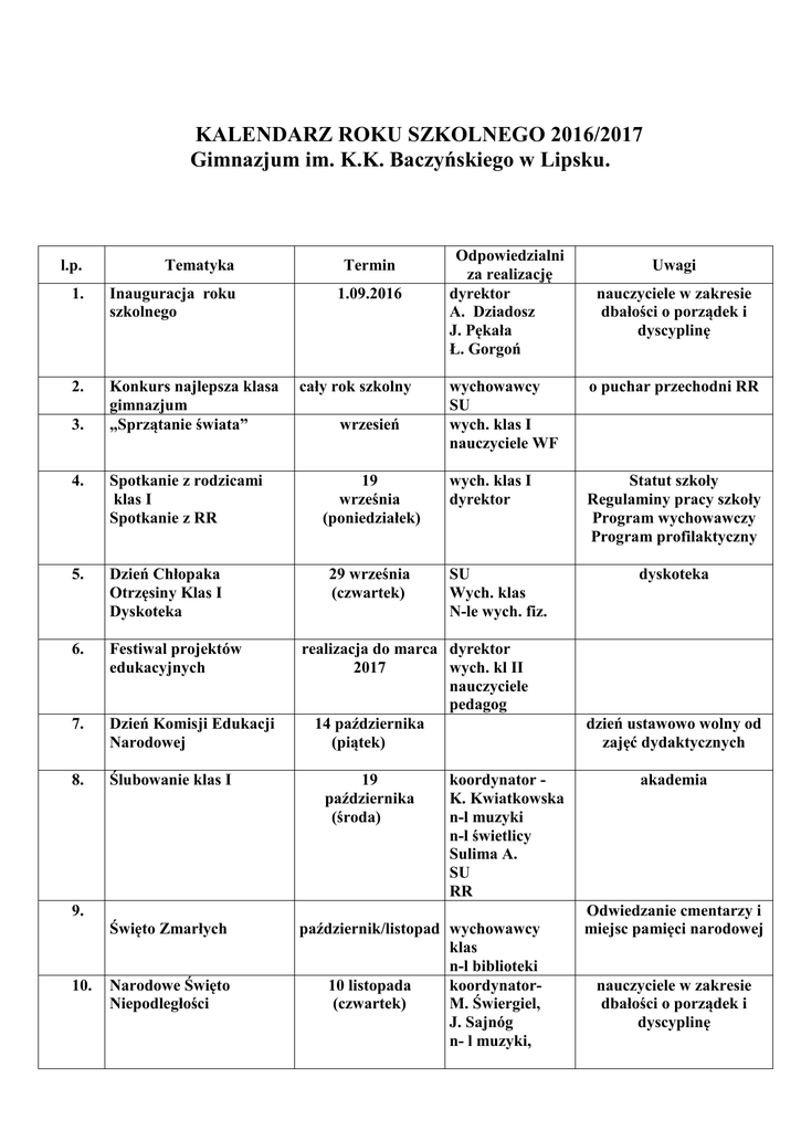 KALENDARZ ROKU SZKOLNEGO 2016/2017 Gimnazjum im. K.K. Baczyńskiego w Lipsku. l.p. Tematyka 1. Inauguracja roku szkolnego 2. Konkurs najlepsza klasa gimnazjum „Sprzątanie świata” 3. 4. Spotkanie z rodzicami klas I Spotkanie z RR 5. Dzień Chłopaka Otrzęsiny Klas I Dyskoteka 6. Festiwal projektów edukacyjnych 7. Dzień Komisji Edukacji Narodowej 8. Ślubowanie klas I Termin 1.09.2016 cały rok szkolny wrzesień 19 września (poniedziałek) 29 września (czwartek) Odpowiedzialni za realizację dyrektor A. Dziadosz J. Pękała Ł. Gorgoń o puchar przechodni RR wych. klas I dyrektor Statut szkoły Regulaminy pracy szkoły Program wychowawczy Program profilaktyczny SU Wych. klas N-le wych. fiz. koordynator K. Kwiatkowska n-l muzyki n-l świetlicy Sulima A. SU RR 9. Święto Zmarłych 10. Narodowe Święto Niepodległości nauczyciele w zakresie dbałości o porządek i dyscyplinę wychowawcy SU wych. klas I nauczyciele WF realizacja do marca dyrektor 2017 wych. kl II nauczyciele pedagog 14 października (piątek) 19 października (środa) Uwagi październik/listopad wychowawcy klas n-l biblioteki 10 listopada koordynator(czwartek) M. Świergiel, J. Sajnóg n- l muzyki, dyskoteka dzień ustawowo wolny od zajęć dydaktycznych akademia Odwiedzanie cmentarzy i miejsc pamięci narodowej nauczyciele w zakresie dbałości o porządek i dyscyplinę 11. Zebranie z rodzicami 12. Andrzejki. 13. Poinformowanie uczniów i ich rodziców(prawnych opiekunów) o przewidywanych ocenach klasyfikacyjnych na półrocze Wystawienie ocen przez nauczycieli. 14. Jasełka Spotkanie opłatkoweuczniowie z wychowawcami 22 listopada (wtorek) 30 listopada (środa) do 20 grudnia 2016r. do 19 grudnia 2016r. 22 grudnia (czwartek) nauczyciele koordynator: A. Żuchowska, A. Kozek SU nauczyciele A. Sulima n-l muzyki n-l świetlicy 15. Wigilia dla pracowników szkoły Spotkanie opłatkowe 16. Zimowa przerwa świąteczna 17. Termin wystawiania ocen śródrocznych Poinformowanie rodziców o cenach 22 grudnia (czwartek) komisja socjalna J. Grabska T. Grzeszczyk Ł. Gorgoń W. Marchewka 23.12-31.12.2016 Do 12.01.2017 nauczyciele wychowawcy do 16.01.2017 18. Próbny egzamin gimnazjalny Termin ogólnopolski 19. Klasyfikacyjne Posiedzenie Rady Pedagogicznej 20 stycznia (piątek) 20. Zabawy Karnawałowe choinka i walentynki 21. Zebrania z rodzicami 9 luty (czwartek) 24 styczeń (wtorek) Dyrektor Sz. Barański W. Fiutek M. Fiutek U. Brzeżnicka A. Żuchowska I. Miaz dyrektor szkoły RR SU wychowawcy wychowawcy Informacja o bieżących postępach w nauce dyskoteka nauczyciele w zakresie dbałości o porządek i dyscyplinę 22. Ferie zimowe 13-26 luty 23. Dzień Patrona Szkoły Marzec 2017 24. Powiatowy konkurs ortograficzny ,,Mistrz ortografii” 25. Konkurs „Mądra Głowa” 26. Rekolekcje Wielkopostne 27. Dzień Kobiet i Mężczyzn 28. Kiermasz świąteczny 9 kwietnia (niedziela) 29. Pierwszy Dzień Wiosny Konkurs savoir vivre 21 marca (wtorek) 30. Spotkanie wielkanocne pracowników szkoły 12 kwietnia (środa) 31. Wiosenna przerwa świąteczna 13-18 kwietnia 32. Egzamin gimnazjalny 19-21 kwietnia 33. Zebranie z rodzicami 27 kwietnia (czwartek) wychowawcy klas nauczyciele 34. Rocznica Uchwalenia Konstytucji 3-go Maja i 27 kwietnia (czwartek) koordynator L. Dziwisz, Luty-kwiecień luty-maj koordynatorW. Fiutek, M. Fiutek A. Dziadosz M. Michałek n-le świetlicy nauczyciele w zakresie dbałości o porządek i dyscyplinę koordynatorJ. Grabska, n-le języka polskiego RR koordynatorSz Barański A. Sulima 8 marca SU koordynator J. Sajnóg, wolontariat, n- l plastyki, n-l techniki koordynator J. Pękała, M. Pawelec wychowawcy klas nauczyciele w zakresie dbałości o porządek i dyscyplinę W. Marchewka k. socjalna, W. Fiutek M. Fiutek L. Dziwisz dyrektor szkoły nauczyciele nauczyciele w zakresie dbałości o porządek i Święto Flagi M.Malec n-l muzyki n-l świetlicy 35. Dzień Języków Obcychkonkursy n- le języków obcych 36. Targi szkół 8 maja (poniedziałek) koorynator A. Łepecka, wych. klas III 37. Poinformowanie uczniów i rodziców (prawnych opiekunów) o przewidywanych ocenach niedostatecznych Wystawienie ocen przez nauczycieli Bierzmowanie do 19 maja (piątek) wychowawcy nauczyciele 39. Dzień Dziecka wycieczka 1 czerwca (czwartek) 40. Giełda podręczników używanych czerwiec 41. Poinformowanie uczniów i rodziców (prawnych opiekunów) o przewidywanych ocenach końcoworocznych do 5 czerwca (poniedziałek) wychowawcy nauczyciele 42. Termin wystawiania ocen końcoworocznych do 12 czerwca (poniedziałek) wychowawcy nauczyciele 43. Noc profilaktyki czerwiec 44. Bal gimnazjalny 13 czerwca (wtorek) 45. Klasyfikacyjne i plenarne posiedzenie rady pedagogicznej 46. Uroczyste pożegnanie absolwentów. Uroczyste zakończenie roku szkolnego 38. dyscyplinę do 18 maja maj 19 czerwca (poniedziałek) 23 czerwca koordynator A. Sulima dyrektor n- le RR n-le biblioteki wychowawcy klas Łepecka A. Dziadosz A koordynator A. Jabłońska, wychowawcy klas III E. Gołda RR dyrektor wychowawcy nauczyciele koordynator O.Majewska, A.Dziadosz wychowawcy klas Wręczenie nagród i świadectw absolwentom. Wręczenie świadectw klas pierwszych i drugich n-le świetlicy RR Przez cały rok szkolny na wniosek rodziców, opiekunów prawnych lub nauczycieli, wychowawcy organizują indywidualne spotkania i konsultacje zainteresowanych osób. Dni wolne w roku szkolnym 2016/2017 31.10.2016 poniedziałek 2.05. 2017 wtorek 4.05. 2017 czwartek 5.05. 2017 piątek 16.06. 2017 piątek egzaminy 19-21.04 2017