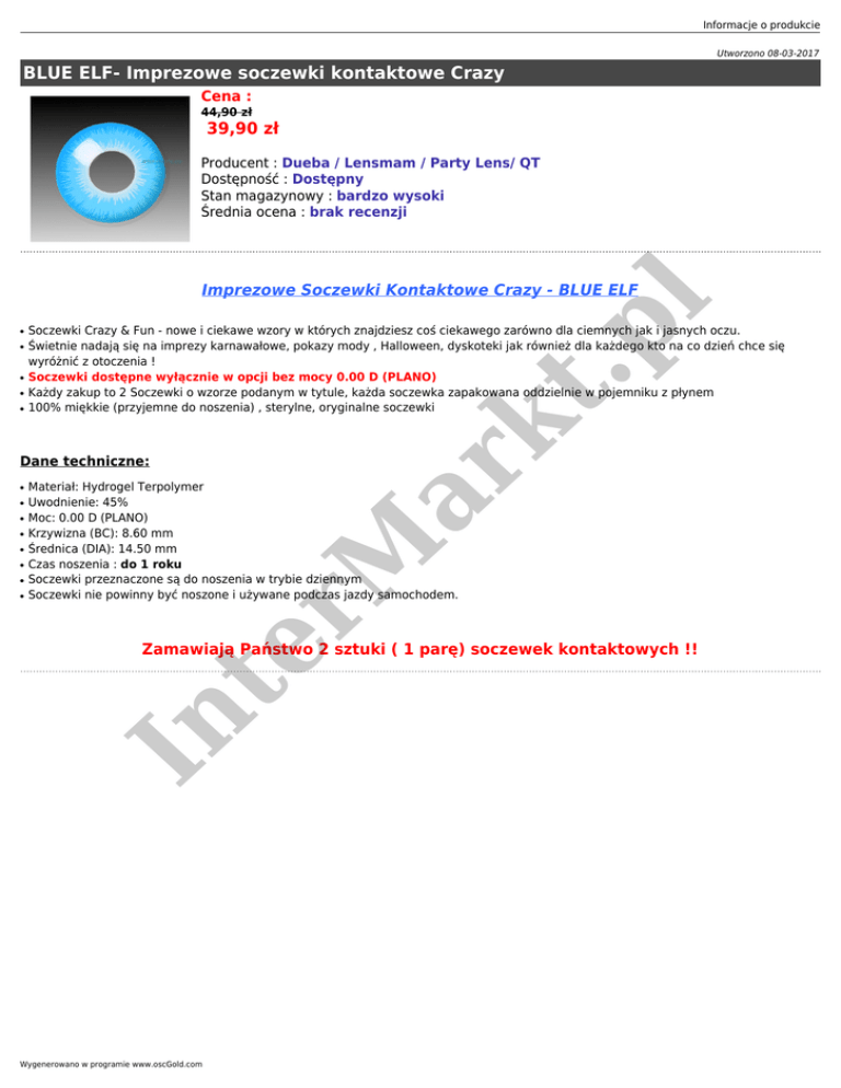 Informacje o produkcie Utworzono 08-03-2017 BLUE ELF- Imprezowe soczewki kontaktowe Crazy Cena : 44,90 zł 39,90 zł Producent : Dueba / Lensmam / Party Lens/ QT Dostępność : Dostępny Stan magazynowy : bardzo wysoki Średnia ocena : brak recenzji ● ● ● ● Soczewki Crazy & Fun - nowe i ciekawe wzory w których znajdziesz coś ciekawego zarówno dla ciemnych jak i jasnych oczu. Świetnie nadają się na imprezy karnawałowe, pokazy mody , Halloween, dyskoteki jak również dla każdego kto na co dzień chce się wyróżnić z otoczenia ! Soczewki dostępne wyłącznie w opcji bez mocy 0.00 D (PLANO) Każdy zakup to 2 Soczewki o wzorze podanym w tytule, każda soczewka zapakowana oddzielnie w pojemniku z płynem 100% miękkie (przyjemne do noszenia) , sterylne, oryginalne soczewki ar kt ● .p l Imprezowe Soczewki Kontaktowe Crazy - BLUE ELF Dane techniczne: ● ● ● ● ● ● te r ● Materiał: Hydrogel Terpolymer Uwodnienie: 45% Moc: 0.00 D (PLANO) Krzywizna (BC): 8.60 mm Średnica (DIA): 14.50 mm Czas noszenia : do 1 roku Soczewki przeznaczone są do noszenia w trybie dziennym Soczewki nie powinny być noszone i używane podczas jazdy samochodem. M ● In Zamawiają Państwo 2 sztuki ( 1 parę) soczewek kontaktowych !! Wygenerowano w programie www.oscGold.com