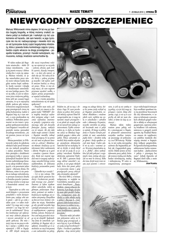 NASZE TEMATY 7 - 20 MAJA 2010 | STRONA 5 NIEWYGODNY ODSZCZEPIENIEC Mariusz Wiktorowski mimo dopiero 34 lat ma już bardzo bogatą biografię, w której możemy znaleźć zarówno pobyt za kratkami jak i narkotyki czy też uzależnienie od hazardu. Jak sam twierdzi, w jego życiorysie nie ma nic nadzwyczajnego i niewiele różni się on od życiorysów dużej części bogatyńskiej młodzieży, która z powodu braku konkretnego zajęcia i pracy, bardzo często wkracza na drogę przestępstwa – pospolite kradzieże, przemyt i handel narkotykami, wymuszenia, rozboje, kradzieże samochodów itp. W takim małym jak Bogatynia miasteczku - około 20 tysięcy mieszkańców, - znają się prawie wszyscy i dobrze wiedzą kto i czym się zajmuje. Mariusz twierdzi, że jadąc samochodem przez miasto może wskazać każdy dom gdzie można kupić narkotyki, każdy warsztat i dziuplę ze skradzionymi samochodami oraz każdego pasera. Dziwi się tylko, że jest to tolerowane przez miejscową policję, która jeśli już czasami kogoś zatrzyma, to są to najczęściej płotki, podczas gdy miejscowi bossowie zorganizowanych grup przestępczych cieszą się pełną bezkarnością. Ludzie w Bogatyni boją się o tym mówić, o czym przekonałem się osobiście. Próbowałem porozmawiać na ten temat z przygodnie spotkanymi mieszkańcami Bogatyni i wszystkie odpowiedzi można sprowadzić do jednego stwierdzenia: ,,nic nie powiem, jeszcze mi życie miłe”… Można powiedzieć, że Wiktorowski należy do pokolenia młodych ludzi przed którymi nie ma żadnych perspektyw i żadnej przyszłości. Nawet duże pieniądze z działalności przestępczej trafią w paszcze jednorękich bandytów lub do bossów narkotykowego biznesu na zakup środków odurzających, a im pozostanie jedno zajęcie – zbieranie złomu. Do Mariusza, mimo iż nie posiada on żadnego wykształcenia, w pewnym momencie dotarła ta brutalna prawda i postanowił wziąć swój los w swoje ręce i diametralnie zmienić swoje życie. - Popatrzyłem na siebie oraz moich kolegów i z przerażeniem pomyślałem o moim dziesięcioletnim synu, zadając sobie wiele pytań: – jaki los go czeka z takim ojcem i w takim środowisku? Czy mogę mieć u niego autorytet i czy mogę być wzorem do naśladowania? Zacząłem kombinować jak wykorzystać swoje zdolności plastyczne i wreszcie uniezależnić się od opieki społecznej. Dla mnie i mojej żony nie ma pracy w okolicy i żyjemy z zasiłków otrzymywanych z OPS w Bogatyni. 600 złotych miesięcznie, dla naszej trzyosobowej rodziny, ma wystarczyć na wszystko – jedzenie, ubranie, opał, środki czystości, dojazdy, transport, itp. – za dużo aby umrzeć, za mało aby żyć. Nie należę do ludzi którzy z pokorą przyjmują wszystko i tak nędzne zasiłki uważam bardziej za obrazę niż pomoc. Wiem, że inni dostają więcej, ale nam najpierw przyznano wysokość zasiłku, a dopiero później przeprowadzono wywiad środowiskowy. - A co z twoim pomysłem uniezależnienia się od opieki społecznej ? - Pomysłów mam wiele, jednym z nich jest otwarcie w Bogatyni studia ”NIBYART”, które mogłoby świadczyć najbardziej nietypowe usługi i realizować najbardziej zwariowane pomysły z pogranicza artystycznego, takie jak chociażby fantazyjne fryzury, makijaże czy też tatuaże. Ale aby takie studio mogło zaistnieć i działać z Bogatyni musiałby zniknąć świat przestępczy, bo na pewno nie stać mnie na płacenie haraczów za „ochronę”, likwidowanie włamań i kradzieży czy też tolerowanie kolesi narkomanów i dilerów. Wziąłem się w garść – zerwałem z ćpaniem i hazardem. Kiedy moi znajomi wpędzili mnie w tarapaty, wykorzystując samochód którego jestem użytkownikiem, do dokonania kradzieży, postanowiłem pomóc policji. - Zabawiłeś się w szeryfa ? - Coś w tym rodzaju. Policja ujęła dwóch sprawców kradzieży i bezskutecznie poszukiwała trzeciego oraz „fantów”. Ponieważ ja byłem użytkownikiem samochodu, stałem się głównym, podejrzanym. Oczywiście, ponieważ nie miałem z kradzieżą nic wspólnego, nie zostałem zatrzymany. Domyśliłem się kim jest trzeci złodziej i złożyłem mu wizytę. Namówiłem go aby sprzedał wszystkie łupy i pomógł zatrzymanym w areszcie współsprawcom – papierosy, herbata, jedzenie. Ponieważ dobrze znał moją przeszłość niczego się nie domyślił. Spakowaliśmy fanty do samochodu i pojechaliśmy do Bogatyni aby je upłynnić. Zostawiłem go w samochodzie na stacji benzynowej a sam zadzwoniłem na policję. Podałem im, jak na tacy, i złodzieja i łupy. W czasie przesłuchania na policji, które prowadził młodszy aspirant Paweł M. zasugerowałem mu, że mogę im wystawić innych przestępców i to nie płotek ale samych szefów ale nie wyraził tym żadnego zainteresowania. Szybko zorientowałem się, że chyba nie bardzo mu zależy na likwidacji bogatyńskich gangów i dałem sobie spokój. Policja zatrzymała samochód, który miałem odzyskać po sprawdzeniu dokumentów. Samochód był mi niezbędny, bo tak się złożyło, że wtedy służył mi nie tyle do jazdy, ile za sypialnię i mieszkanie. Wysłałem młodszemu aspirantowi Pawłowi M. SMS z pytaniem kiedy mogę odebrać samochód i napisałem, że jest grupa młodych ludzi, która chce pomóc policji w oczyszczeniu miasta z grup przestępczych i proszę zobaczyć jaką otrzymałem odpowiedź! Oto treść SMS-a, w którym wulgaryzmy, ze względu na Czytelników, musiałem pozostawić domyślnymi: „ Powiedziałem – muszę zobaczyć dokumenty. A po drugie, nie pisz do mnie jakiś pierdół i bzdur. Ch.. (wulgaryzm) mnie obchodzi co sobie młodzi myślą o policji i dlaczego k…(wulgaryzm) dałeś komuś mój nr ? Raz jeszcze to zrobisz to wy… (wulgaryzm) na mieście, że jesteś konfidentem i sprzedajesz psom.” - Wyraźnie widać jak niektórym policjantom zależy na likwidacji grup przestępczych, a może boją się, że po ich lik