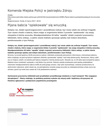Komenda Miejska Policji w Jastrzębiu Zdroju Źródło: http://www.jastrzebie.slaska.policja.gov.pl/k10/informacje/wiadomosci/32881,Pijana-babcia-quotopiekowalaquot-sie-wnuczka. html Wygenerowano: Środa, 8 marca 2017, 18:53 Pijana babcia "opiekowała" się wnuczką Kolejny raz, dzięki spostrzegawczości i prawidłowej reakcji, być może udało się uniknąć tragedii. Tym razem chodzi o babcię, która mając w organizmie blisko 3 promile "opiekowała" się swoją niespełna 4-letnią wnuczką. Nieodpowiedzialna 45-latka "wpadła" dzięki czujności pracownicy biblioteki, która widząc, w jakim stanie kobieta sprawuje opiekę nad małym dzieckiem, poinformowała o tym Policję. Kolejny raz, dzięki spostrzegawczości i prawidłowej reakcji, być może udało się uniknąć tragedii. Tym razem chodzi o babcię, która mając w organizmie blisko 3 promile "opiekowała" się swoją niespełna 4-letnią wnuczką. Nieodpowiedzialna 45-latka "wpadła" dzięki czujności pracownicy biblioteki, która widząc, w jakim stanie kobieta sprawuje opiekę nad małym dzieckiem, poinformowała o tym Policję. Wczoraj, tuż przed godziną 18:00 pracownica jednej z bibliotek przekazała policjantom informację o nietrzeźwej kobiecie, która znajdując się pod wyraźnym wpływem alkoholu sprawowała "opiekę" nad małą dziewczynką. Mundurowi, którzy udali się na miejsce ustalili, że kobieta jest babcią niespełna 4-letniej dziewczynki. Okazało się, że 45-latka była kompletnie pijana. Badanie stanu trzeźwości wykazało u niej blisko trzy promile. Dziecko zostało przekazane pod opiekę pradziadkowi, natomiast nieodpowiedzialna babcia trafiła do policyjnego aresztu. Gdy tylko wytrzeźwieje, zostanie przesłuchana na okoliczności zdarzenia. Jeżeli okaże się, że jastrzębianka naraziła swoją wnuczkę na niebezpieczeństwo utraty życia lub zdrowia, grozić jej może kara nawet do 5 lat pozbawienia wolności. Zachowanie pracownicy biblioteki jest przykładem prawidłowego działania w myśl kampanii "Nie reagujeszakceptujesz!". Mamy nadzieję, że podobną postawą wykaże się więcej osób i będziemy otrzymywać od Państwa zgłoszenia o podejrzeniu popełnienia przestępstw. Ocena: 0/5 (0) Tweetnij