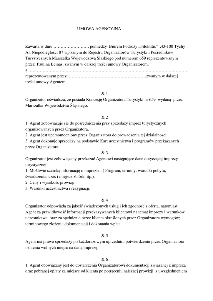 UMOWA AGENCYJNA Zawarta w dniu ……………………. pomiędzy Biurem Podróży „Filoktitis” ,43100 Tychy Al. Niepodległości 87 wpisanym do Rejestru Organizatorów Turystyki i Pośredników Turystycznych Marszałka Województwa Śląskiego pod numerem 659 reprezentowanym przez Paulina Beinas, zwanym w dalszej treści umowy Organizatorem, a ………………………………………………………………………………………………… reprezentowanym przez: ………………………………………………zwanym w dalszej treści umowy Agentem. & 1 Organizator oświadcza, że posiada Koncesję Organizatora Turystyki nr 659 wydaną przez Marszałka Województwa Śląskiego. & 2 1. Agent zobowiązuje się do pośredniczenia przy sprzedaży imprez turystycznych organizowanych przez Organizatora. 2. Agent jest upełnomocniony przez Organizatora do prowadzenia tej działalności. 3. Agent dokonuje sprzedaży na podstawie Kart uczestnictwa i programów przekazanych przez Organizatora. & 3 Organizator jest zobowiązany przekazać Agentowi następujące dane dotyczącej imprezy turystycznej: 1. Możliwie szeroką informację o imprezie : ( Program, terminy, warunki pobytu, świadczenia, czas i miejsce zbiórki itp.). 2. Ceny i wysokość prowizji. 3. Warunki uczestnictwa i rezygnacji. & 4 Organizator odpowiada za jakość świadczonych usług i ich zgodność z ofertą, natomiast Agent za prawidłowość informacji przekazywanych klientowi na temat imprezy i warunków uczestnictwa oraz za spełnienie przez klienta określonych przez Organizatora wymogów; terminowego złożenia dokumentacji i dokonania wpłat. & 5 Agent ma prawo sprzedaży po każdorazowym uprzednim potwierdzeniu przez Organizatora istnienia wolnych miejsc na daną imprezę. & 6 1. Agent obowiązany jest do dostarczenia Organizatorowi dokumentacji związanej z imprezą oraz pobranej opłaty za miejsce od klienta po potrąceniu należnej prowizji z uwzględnieniem & 10.1 i 10.2 w terminie do 7 dni od przyjęcia wpłaty. Jeżeli sprzedaż jest dokonana w terminie krótszym niż 10 dni przed rozpoczęciem imprezy , wpłaty należy dokonać do 3 dni. Wpłat należy dokonywać osobiście lub przelewem: ING BANK ŚLĄSKI O/ TYCHY NR 76 1050 1399 1000 0022 8869 8778 W przypadku odbioru od Agenta gotówki przez Organizatora, powiadomi on Agenta o tym fakcie najpóźniej w przeddzień odbioru gotówki. Organizator może zażądać rozliczenia sprzedaży w innym ustalonym przez siebie terminie. 2. W przypadku niezachowania przez Agenta warunków określonych w ust. 1, Organizator ma prawo odmówić wpisania klienta na listę uczestników imprezy. Agent ponosi w tym przypadku pełną odpowiedzialność odszkodowawczą i zobowiązany jest do wyrównania szkody w pełnej wysokości związanej z uzasadnionymi roszczeniami klienta. & 7 1. Strony ustalają, że w przypadku rezygnacji przez Klienta z imprezy, Agent dokonuje zwrotu pieniędzy na rzecz klienta w terminie natychmiastowym. W przypadku gdy wpłaty klienta zostały przekazane do Organizatora, Agent zwraca klientowi należności natychmiast po otrzymaniu ich od Organizatora. Organizator w takim przypadku zwraca Agentowi należności dla klienta nie później niż do 2 dni roboczych po otrzymaniu informacji o rezygnacji. Wypłaty dokonywane są po potrąceniu kosztów rezygnacji ustalonych w „Warunkach uczestnictwa”. 2. W przypadku rezygnacji klienta z imprezy Agent zobowiązany jest powiadomić o tym fakcie Organizatora w dniu przyjęcia rezygnacji. & 8 Strony ustalają, że w przypadku odwołania imprezy przez Organizatora, Agentowi nie przysługuje prowizja od miejsc sprzedanych na tę imprezę. W tym przypadku zwrotu wpłat klientom dokonuje Agent, na zasadach analogicznych jak w & 7. & 9 Biuro Podróży „Filoktitis” oświadcza, że jest płatnikiem podatku od towarów i usług (VAT) i posiada nr NIP 5491632490. Biuro Podróży „Filoktitis” upoważnia Agenta do wystawiania faktur VAT bez podpisu odbiorcy i wysyłania ich listem poleconym . & 10 1. Wynagrodzenie Agenta stanowi prowizja w wysokości określonej każdorazowo przez Organizatora. 2. Agent ma obowiązek wystawić Organizatorowi fakturę VAT na prowizję. W przypadku nie wystawienia faktury prowizja nie przysługuje. 3. Organizator nie wystawia Agentom faktur za imprezy. Na życzenie klientów Organizator wystawia im faktury VAT. Życzenie klienta dotyczące wystawiania faktury Agent powinien zgłosić przy zapisie jednak nie później niż w dniu poprzedzającym rozpoczęcie imprezy. W takim przypadku Agent zobowiązany jest do przesłania Organizatorowi upoważnienia do wystawienia faktury, podpisanego przez klienta. & 11 Zgodnie z ustawą z dnia 26.08.2002r ( Dz.U. nr 144 poz. 1204) o świadczenie usług drogą elektroniczną Agent wyraża zgodę na otrzymywanie drogą elektroniczną wszelkich informacji koniecznych do prowadzenia sprzedaży Organizatora na adres elektroniczny Agenta oraz wyraża zgodę na przetwarzanie tego adresu w bazie danych na zasadach określonych w przepisach w/w Ustawy o świadczenie usług drogą elektroniczną. & 12 Agent zobowiązany jest do stosowania postanowień Ustawy z dnia 29 sierpnia 1997 o ochronie danych osobowych. & 13 Wszelkie zmiany i uzupełnienia wymagają formy pisemnej. W sprawach nieregulowanych postanowieniami umowy mają zastosowanie odpowiednie przepisy Kodeksu Cywilnego. &14 Umowa została zawarta na czas nieokreślony z możliwością wypowiedzenia przez każda ze stron z wyprzedzeniem 1 miesiąca. Strony ustalają, że wszystkie dotychczasowe umowy akwizycyjne zawarte pomiędzy stronami tracą moc. Niniejsza umowa jest jedyną obowiązującą strony w zakresie sprzedaży akwizycyjnej. ORGANIZATOR: AGENT:
