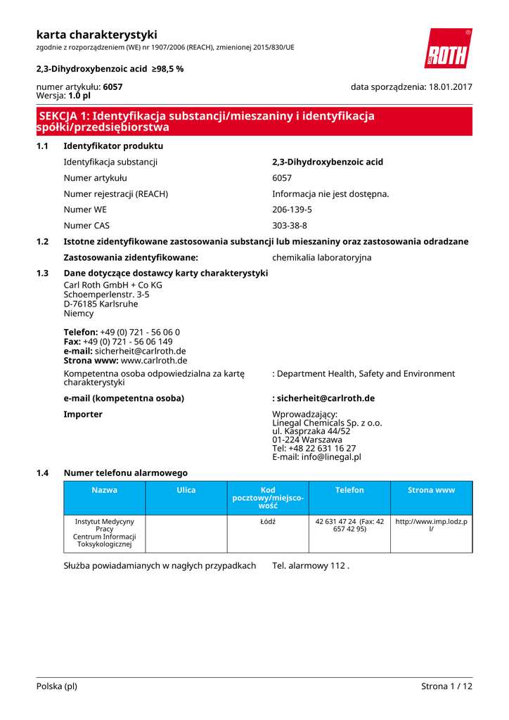 karta charakterystyki zgodnie z rozporządzeniem (WE) nr 1907/2006 (REACH), zmienionej 2015/830/UE 2,3-Dihydroxybenzoic acid ≥98,5 % numer artykułu: 6057 Wersja: 1.0 pl data sporządzenia: 18.01.2017 SEKCJA 1: Identyfikacja substancji/mieszaniny i identyfikacja spółki/przedsiębiorstwa 1.1 1.2 Identyfikator produktu Identyfikacja substancji 2,3-Dihydroxybenzoic acid Numer artykułu 6057 Numer rejestracji (REACH) Informacja nie jest dostępna. Numer WE 206-139-5 Numer CAS 303-38-8 Istotne zidentyfikowane zastosowania substancji lub mieszaniny oraz zastosowania odradzane Zastosowania zidentyfikowane: 1.3 chemikalia laboratoryjna Dane dotyczące dostawcy karty charakterystyki Carl Roth GmbH + Co KG Schoemperlenstr. 3-5 D-76185 Karlsruhe Niemcy Telefon: +49 (0) 721 - 56 06 0 Fax: +49 (0) 721 - 56 06 149 e-mail: [email protected] Strona www: www.carlroth.de 1.4 Kompetentna osoba odpowiedzialna za kartę charakterystyki : Department Health, Safety and Environment e-mail (kompetentna osoba) : [email protected] Importer Wprowadzający: Linegal Chemicals Sp. z o.o. ul. Kasprzaka 44/52 01-224 Warszawa Tel: +48 22 631 16 27 E-mail: [email protected] Numer telefonu alarmowego Nazwa Ulica Kod pocztowy/miejscowość Telefon Strona www Łódź 42 631 47 24 (Fax: 42 657 42 95) http://www.imp.lodz.p l/ Instytut Medycyny Pracy Centrum Informacji Toksykologicznej Służba powiadamianych w nagłych przypadkach Polska (pl) Tel. alarmowy 112 . Strona 1 / 12 karta charakterystyki zgodnie z rozporządzeniem (WE) nr 1907/2006 (REACH), zmienionej 2015/830/UE 2,3-Dihydroxybenzoic acid ≥98,5 % numer artykułu: 6057 SEKCJA 2: Identyfikacja zagrożeń 2.1 Klasyfikacja substancji lub mieszaniny Klasyfikacja zgodnie z rozporządzeniem (WE) nr 1272/2008 (CLP) Klasyfikacja zg. z GHS Sekcja Klasa zagrożenia Klasa i kategoria zagrożenia Zwrot wskazujący rodzaj zagrożenia 3.2 działanie żrące/podrażniające na skórę (Skin Irrit. 2) H315 3.3 poważne uszkodzenie oczu/działanie drażniące na oczy (Eye Irrit. 2) H319 3.8R działanie toksyczne na narządy docelowe – narażenie jednorazowe (podrażnienia dróg oddechowych) (STOT SE 3) H335 Uwagi Pełny tekst zwrotów wskazujących rodzaj zagrożenia i zwrotów EUH: zob. SEKCJA 16. 2.2 Elementy oznakowania Oznakowania zgodnie z rozporządzeniem (WE) nr 1272/2008 (CLP) Hasło ostrzegawcze Uwaga Piktogramy Zwroty wskazujące rodzaj zagrożenia H315 H319 H335 Działa drażniąco na skórę. Działa drażniąco na oczy. Może powodować podrażnienie dróg oddechowych. Zwroty wskazujące środki ostrożności Zwroty wskazujące środki ostrożności - zapobieganie P280 Stosować rękawice ochronne/ochronę oczu. Zwroty wskazujące środki ostrożności - reagowanie P302+P352 P305+P351+P338 Polska (pl) W PRZYPADKU KONTAKTU ZE SKÓRĄ: Umyć dużą ilością wody. W PRZYPADKU DOSTANIA SIĘ DO OCZU: ostrożnie płukać wodą przez kilka minut. Wyjąć soczewki kontaktowe, jeżeli są i można je łatwo usunąć. Kontynuować płukanie. Strona 2 / 12 karta charakterystyki zgodnie z rozporządzeniem (WE) nr 1907/2006 (REACH), zmienionej 2015/830/UE 2,3-Dihydroxybenzoic acid ≥98,5 % numer artykułu: 6057 Oznakowanie opakowań, których zawartość nie przekracza 125 ml Hasło ostrzegawcze: Uwaga Symbol(-e) 2.3 Inne zagrożenia Nie ma dodatkowych informacji. SEKCJA 3: Skład/informacja o składnikach 3.1 Substancje Nazwa substancji 2,3-Dihydroxybenzoic acid Numer WE 206-139-5 Numer CAS 303-38-8 Wzór cząsteczkowy C₇ H₆ O₄ Masa cząsteczkowa 154,1 g/mol SEKCJA 4: Środki pierwszej pomocy 4.1 Opis środków pierwszej pomocy Uwagi ogólne Zdjąć zanieczyszczoną odzież. Po narażeniu przez drogi oddechowe Zapewnić dostęp do świeżego powietrza. Zasięgnąć porady lekarza w przypadku pojawienia się jakichkolwiek wątpliwości, lub jeżeli objawy nie ustępują. Po kontakcie ze skórą Spłukać skórę pod strumieniem wody/prysznicem. W razie podrażnień skóry udać się do lekarza. Po kontakcie z oczami Spłukiwać obficie czystą, świeżą wodą, przez co najmniej 10 minut, utrzymując otwarte powieki. W przypadku podrażnienia oczu zasięgnąć porady lekarza okulisty. Po narażeniu przez przewód pokarmowy Wypłukać usta. W przypadku złego samopoczucia skontaktować się z lekarzem. 4.2 Najważniejsze ostre i opóźnione objawy oraz skutki narażenia Działanie drażniące, Kaszel, Duszność 4.3 Wskazania dotyczące wszelkiej natychmiastowej pomocy lekarskiej i szczególnego postępowania z poszkodowanym żadne Polska (pl) Strona 3 / 12 karta charakterystyki zgodnie z rozporządzeniem (WE) nr 1907/2006 (REACH), zmienionej 2015/830/UE 2,3-Dihydroxybenzoic acid ≥98,5 % numer artykułu: 6057 SEKCJA 5: Postępowanie w przypadku pożaru 5.1 Środki gaśnicze Odpowiednie środki gaśnicze Środki gaśnicze należy dostosować do otoczenia rozpylona woda, piana, suchy proszek gaśniczy, dwutlenek węgla (CO2) Niewłaściwe środki gaśnicze silny strumień wody 5.2 Szczególne zagrożenia związane z substancją lub mieszaniną Palny. Produkty spalania stwarzające zagrożenie Podczas pożaru mogą powstawać: tlenek węgla (CO), dwutlenek węgla (CO2) 5.3 Informacje dla straży pożarnej Gasić pożar z rozsądnej odległości z zachowaniem zwykłych środków ostrożności. Nosić autonomiczny aparat oddechowy. SEKCJA 6: Postępowanie w przypadku niezamierzonego uwolnienia do środowiska 6.1 Indywidualne środki ostrożności, sprzęt ochronny i procedury w sytuacjach awaryjnych Dla osób nienależących do personelu udzielającego pomocy Noszenie odpowiedniego sprzętu ochronnego (w tym osobiste wyposażenie ochronne, o których mowa w sekcji 8 karty charakterystyki), aby zapobiec skażeniu skóry, oczu lub odzieży. Nie wdychać pyłu. Unikać kontaktu ze skórą, oczami i odzieżą. 6.2 Środki ostrożności w zakresie ochrony środowiska Zapobiegać przedostaniu się do kanalizacji, wód powierzchniowych i gruntowych. 6.3 Metody i materiały zapobi
