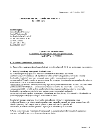 Numer sprawy :AZ.2150-35/ 4 /2011 ZAPROSZENIE DO ZŁOŻENIA OFERTY do 14.000 euro Zamawiający : Samodzielny Publiczny Szpital Wojewódzki im. Papieża Jana Pawła II ul. Al. Jana Pawła II 10 22-400 Zamość tel. ( 84 ) 677 33 33 fax (84) 638 66 69 Zaprasza do złożenia oferty na dostawę materiałów do remontu pomieszczeń . kod CPV : 44190000-8 I. Określenie przedmiotu zamówienia 1. Szczegółowy opis przedmiotu zamówienia określa załącznik Nr 2 do niniejszego zaproszenia . 2. Poniżej podajemy wymagania środowiskowe : a) Materiały powinny posiadać właściwe świadectwa /deklaracje do obrotu ,użytkowania,potwierdzające ich zgodność z ustalonymi wymaganiami prawnymi ochrony środowiska .Materiały powinny posiadać jeden z niżej wymienioych oznaczeń : -ozanaczenie CE-wrób zgodny z wymaganiami dotyczącymi bezpieczeństwa produktu dla zdrowia konsumenta a także ochronny środowiska, -oznaczenie PN-produkt został wytworzony zgodnie z polskimi normami z zakresu ISO serii 9000 (SZJ) oraz ISO 14000(SZŚ) i spełnia normy bezpieczeństwa dla człowieka i środowiska, -oznaczenie EKO—wyrób spełnia ustalone kryteria dotyczące ochrony zdrowia człowieka i środowiska naturalnego w trakcie jego wytwarzania,stosowania i utylizacji, -oznaczenie Q-wrób spełnia wymagania jakosciowe,jest bezpieczny dla człowieka i środowiska,a ponadto jego produkcja jest energo-i materiałooszczędna. 3.Materiały mogące zagrażać środowisku naturalnemu winny być zaopatrzone przez producenta/dostawcę w odpowiednie oznakowania na opakowaniach mówiące o zagrożeniu jak również powinny być zaopatrzone w pisemne pouczenie co do sposobu ich stosowania,przechowywania zgodnie z wymoganiami ochrony środowiska . 4.Puste opakowania po wyrobach stwarzających zagrożenie dla środowiska (niebezpieczne) powinny być odbierane przez dostawcę tych wyrobów. Strona 1 z 4 5. Zawartość Lotnych Związków Organicznych (LZO) w farbach powinna odpowiadać wartości określonym w załączniku do Rozp.Ministra Gospodarki i Pracy z 2005r.(Dz.U.Nr 216,poz.182).Informacja o ilości LZO(g/l) powinna być umieszczona na opakowaniu farby. 6. Wymagany przez Zamawiającego termin realizacji : 12 miesięcy licząc od daty podpisania umowy . Ofertę można złożyć na całość przedmiotu zamówienia lub na każdy asortyment oddzielnie ( oferta częściowa ). II. Sposób sporządzenia oferty 1. Ofertę należy złożyć w jednej zamkniętej kopercie w siedzibie Zamawiającego – pokój 248 ( Kancelaria Szpitala ) . 2. Na kopercie należy umieścić nazwę i adres Zamawiającego oraz zapis „ Dostawa materiałów do remontu pomieszczeń ” . 3. Oferta musi być podpisana przez wykonawcę tj. osobę uprawnioną do reprezentowania firmy ( zgodnie z wpisami do akt rejestrowych ) bądź osobę upoważnioną przez wykonawcę na piśmie. III. Oferta musi zawierać następujące dokumenty i informacje : 1. Formularz „ Oferty Wykonawcy „ wg załączonego wzoru ( zał. Nr 1 ) 2. Ofertę cenową przygotowaną w następujący sposób : lp. asortyment ,ilość , cena jednostkowa netto ( bez podatku VAT ) , stawka podatku VAT , cena jednostkowa brutto ( cena jednostkowa netto powiększona o stawkę VAT ) , łączna cena netto pozycji – bez podatku VAT ( wynik mnożenia ceny jednostkowej bez podatku VAT przez ilość ) , łączna cena brutto pozycji – z podatkiem VAT ( łączna cena netto pozycji powiększona o VAT ) , producent . Cena ostateczna za całość przedmiotu zamówienia ( suma cen łącznych ) musi być podana w wartości netto ( bez podatku VAT ) i wartości brutto ( z podatkiem VAT ) . Ceny muszą być wyrażone w złotych polskich zgodnie z obowiązującym systemem monetarnym ( zaokrąglone do dwóch miejsc po przecinku ) , łączna cena musi być wyrażona cyfrą i słownie . Zamawiający informuje , że rozliczenia między Zamawiającym a Wykonawcą będą prowadzone tylko w złotych polskich . 3. Aktualny odpis z właściwego rejestru albo aktualne zaświadczenie o wpisie do ewidencji działalności gospodarczej , wystawiony nie wcześniej niż 6 ( sześć ) miesięcy przed upływem terminu składania ofert . 4. Informację odnośnie asortymentu , po którym zgodnie z wymogiem podanym w części I pkt 4 bedą odbierane przez dostawcę puste opakowania . IV. Termin złożenia oferty : 19 maja 2011 r. V. Osobami uprawnionymi do kontaktów z Wykonawcami są : w sprawach merytorycznych – mgr Roman Kapica tel (84) 677 32 85 , w sprawach formalnych – inż. Dariusz Flis , tel.(84) 677 32 79 . VI. Przy wyborze oferty Zamawiający będzie kierował się kryterium : cena – 100 % . Strona 2 z 4 VII. Cena podana przez Wykonawcę nie może ulec podwyższeniu przez okres obowiązywania umowy . VIII.Wykonawca zobowiazuje się dostarczyć wraz z pierwszą dostawą karty charakteryski substancji niebezpicznych . IX. Informacja o wyborze oferty zostanie zamieszczona na stronie internetowej szpitala. X. Po wyborze najkorzystniejszej oferty Zamawiający wyśle do Wykonawcy umowę do podpisania i zwrotu jednego egzemplarza . Załączniki : 1. Formularz oferty Wykonawcy 2. Formularz oferty cenowej 3. Wzór umowy Strona 3 z 4 Załącznik Nr 1do zaproszenia OFERTA WYKONAWCY dotyczy poz .................................................................................................................................. Dane dotyczące Wykonawcy : Nazwa : ...................................................................... Siedziba ( dokładny adres ): ....................................... ..................................................................................... Numer telefonu : ........................................................ Numer faxu : ......................................................... Numer NIP : ......................................................... Dane dotyczące Zamawiającego : Nazwa : Samodzielny Publiczny Szpital Wojewódzki im Papieża Jana Pawła II Adres : ul. Aleje