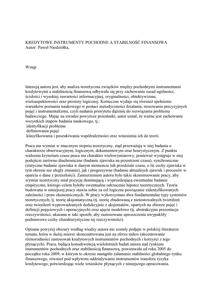 KREDYTOWE INSTRUMENTY POCHODNE A STABILNOŚĆ FINANSOWA Autor: Paweł Niedziółka, Wstęp Intencją autora jest, aby analiza teoretyczna związków między pochodnymi instrumentami kredytowymi a stabilnością finansową odbywała się przy zachowaniu zasad ogólności, ścisłości i wysokiej zawartości informacyjnej, oryginalności, obiektywizmu, wieloaspektowości oraz prostoty logicznej. Konieczne wydaje się również spełnienie warunków poznania naukowego w postaci metodyczności działania, stosowania precyzyjnych pojęć i instrumentalizmu, czyli nadania priorytetu dążeniu do rozwiązania problemu badawczego. Mając na uwadze powyższe przesłanki, autor uznał, że ważne jest zachowanie wszystkich etapów badania naukowego, tj.: identyfikacji problemu definiowania pojęć klasyfikowania i poszukiwania współzależności oraz wniesienia ich do teorii. Praca ma wymiar w znacznym stopniu teoretyczny, stąd przeważają w niej badania o charakterze obserwacyjnym, logicznym, dokumentowym oraz heurystycznym. Z punktu widzenia kryterium czasu praca ma charakter wielowymiarowy, ponieważ występuje w niej podejście zarówno diachroniczne (badanie zjawiska na przestrzeni czasu), synchroniczne (statyczne badanie zjawiska w danym momencie lub przedziale czasu, o ile cechy zjawiska w tym okresie nie uległy zmianie), jak i progresywne (badanie aktualnych zjawisk i procesów w oparciu o dane z przeszłości). Zamierzeniem autora było takie skonstruowanie pracy, aby wymiar teoretyczny miał pozycję dominującą i wyprzedzającą ewentualne badanie empiryczne, którego celem byłoby ewentualne odrzucenie hipotez teoretycznych. Teoria budowana w niniejszej pracy stawia sobie za cel logiczne powiązanie zidentyfikowanych zależności i praw ekonomicznych. W pracy wykorzystano dwa fundamentalne typy systemów teoretycznych, tj. teorię aksjomatyczną (tj. teorię zbudowaną z nietestowalnych twierdzeń oraz twierdzeń wyprowadzanych dedukcyjnie z aksjomatów, opartych na zbiorze pojęć i definicji pojęciowych i operacyjnych) oraz ujęcie modelowe (tj. abstrakcyjna prezentacja rzeczywistości, ukazana w taki sposób, aby zastosowane uproszczenia uwypukliły podstawowe cechy charakterystyczne tej rzeczywistości). Opisane powyżej obszary według wiedzy autora nie zostały podjęte w polskiej literaturze tematu, która w dużej mierze skoncentrowana jest na sferze mikro (akcentowanie różnorodności zastosowań kredytowych instrumentów pochodnych i korzyści z tego płynących). Praca, będąca konsekwencją wieloletnich badań autora nad rynkiem instrumentów pochodnych oraz stabilnością finansową, powstawała od roku 2005 do początku roku 2009, w którym to okresie nastąpiło załamanie stabilności globalnego rynku finansowego, również pod wpływem oddziaływania instrumentów transferu ryzyka kredytowego, potwierdzając wiele wniosków płynących z niniejszego opracowania. Opis Tytułowe instrumenty pochodne stają się obecnie pomostem pomiędzy bankowością inwestycyjną a komercyjną, będąc narzędziem ?Urynkowienia" ryzyka kredytowego , zwiększenia jego płynności i obiektywizacji wyceny. Pozytywny wpływ pochodnych kredytowych na rynek finansowy objawia się również w postaci efektu dywersyfikacji i ograniczenia ryzyka kredytowego; kwotowania derywatów są zaś lepszymi wyznacznikami zmian standingu ekonomiczno-finansowego emitenta instrumentu referencyjnego niż rating i marża. Spis treści Indeks skrótów nazw własnych używanych w pracy Wprowadzenie CZĘŚĆ I. TEORIA STABILNOŚCI FINANSOWEJ Rozdział 1. Teoria systemu finansowego 1.1. Osadzenie teorii stabilności finansowej oraz teorii kredytowych instrumentów pochodnych w ekonomii i teorii finansów 1.2. Wybrane aspekty teorii systemu finansowego Rozdział 2. Istota stabilności finansowej - definicja oraz wybrane problemy terminologiczne 2.1. Teoria stabilności finansowej a teoria kryzysu - uwagi wprowadzające 2.2. Typologia definicji stabilności finansowej 2.3. Ryzyko systemowe a ryzyko systematyczne 2.4. Niestabilność sektora bankowego jako źródło niestabilności finansowej - wybrane aspekty teoretyczne Rozdział 3. Teoria przyczyn niestabilności finansowej 3.1. Czynniki ryzyka systemowego oraz zagrożenia niestabilnością - uwagi ogólne 3.2. Mikrostrukturalne przyczyny niestabilności - przykład konfliktu interesów 3.3. Hipoteza pamięci instytucjonalnej 3.4. Boom kredytowy oraz rozwój rynków transferu ryzyka jako przyczyna wzrostu niestabilności finansowej 3.5. Wpływ liberalizacji przepływów kapitałowych na ryzyko systemowe, stabilność finansową i wzrost gospodarczy 3.6. Teoria ?dużego spekulanta" 3.7. Konglomeryzacja działalności finansowej 3.8. Kondycja przedsiębiorstw oraz gospodarstw domowych jako determinanta kondycji instytucji finansowych 3.9. Wpływ rozwoju rynku lewarowanych transakcji wysokokwotowych na kondycję instytucji finansowych 3.10. Typ instytucji finansowej a stabilność finansowa - przykład banków spółdzielczych 3.11. Czynniki aktywujące zaburzenia na rynku finansowym - przykład pęknięcia bańki spekulacyjnej pod wpływem wzrostu stóp procentowych 3.12. Zarażenie jako przyczyna niestabilności finansowej 3.13. Determinanty stabilności finansowej w ujęciu modelowym - uwagi końcowe Rozdział 4. Metody kwantyfikacji stabilności finansowej 4.1. Teoretyczne uwarunkowania estymacji stabilności finansowej 4.2. Proces identyfikacji potencjalnych obszarów niestabilności, wskaźników niestabilności oraz wskaźników wczesnego ostrzegania 4.3. Indeksy stabilności finansowej Rozdział 5. Stabilność finansowa a sfera realna gospodarki 5.1. Dwukierunkowość zależności między sferą finansową i realną gospodarki 5.2. Wpływ kryzysów finansowych na produkcję i PKB 5.3. Kryzys zaufania jako konsekwencja kryzysu finansowego 5.4. Modele stabilności finansowej 5.5. Cykl koniunkturalny jako czynnik utrudniający ocenę stabilności fina