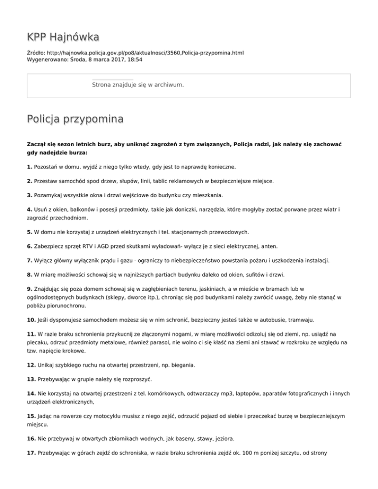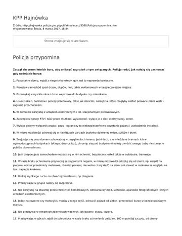 KPP Hajnówka Źródło: http://hajnowka.policja.gov.pl/po8/aktualnosci/3560,Policja-przypomina.html Wygenerowano: Środa, 8 marca 2017, 18:54 Strona znajduje się w archiwum. Policja przypomina Zaczął się sezon letnich burz, aby uniknąć zagrożeń z tym związanych, Policja radzi, jak należy się zachować gdy nadejdzie burza: 1. Pozostań w domu, wyjdź z niego tylko wtedy, gdy jest to naprawdę konieczne. 2. Przestaw samochód spod drzew, słupów, linii, tablic reklamowych w bezpieczniejsze miejsce. 3. Pozamykaj wszystkie okna i drzwi wejściowe do budynku czy mieszkania. 4. Usuń z okien, balkonów i posesji przedmioty, takie jak doniczki, narzędzia, które mogłyby zostać porwane przez wiatr i zagrozić przechodniom. 5. W domu nie korzystaj z urządzeń elektrycznych i tel. stacjonarnych przewodowych. 6. Zabezpiecz sprzęt RTV i AGD przed skutkami wyładowań- wyłącz je z sieci elektrycznej, anten. 7. Wyłącz główny wyłącznik prądu i gazu - ograniczy to niebezpieczeństwo powstania pożaru i uszkodzenia instalacji. 8. W miarę możliwości schowaj się w najniższych partiach budynku daleko od okien, sufitów i drzwi. 9. Znajdując się poza domem schowaj się w zagłębieniach terenu, jaskiniach, a w mieście w bramach lub w ogólnodostępnych budynkach (sklepy, dworce itp.), chroniąc się pod budynkami należy zwrócić uwagę, żeby nie stanąć w pobliżu piorunochronu. 10. Jeśli dysponujesz samochodem możesz się w nim schronić, bezpieczny jesteś także w autobusie, tramwaju. 11. W razie braku schronienia przykucnij ze złączonymi nogami, w miarę możliwości odizoluj się od ziemi, np. usiądź na plecaku, odrzuć przedmioty metalowe, również parasol, nie wolno ci się kłaść na ziemi ani stawać w rozkroku ze względu na tzw. napięcie krokowe. 12. Unikaj szybkiego ruchu na otwartej przestrzeni, np. biegania. 13. Przebywając w grupie należy się rozproszyć. 14. Nie korzystaj na otwartej przestrzeni z tel. komórkowych, odtwarzaczy mp3, laptopów, aparatów fotograficznych i innych urządzeń elektronicznych, 15. Jadąc na rowerze czy motocyklu musisz z niego zejść, odrzucić pojazd od siebie i przeczekać burzę w bezpieczniejszym miejscu. 16. Nie przebywaj w otwartych zbiornikach wodnych, jak baseny, stawy, jeziora. 17. Przebywając w górach zejdź do schroniska, w razie braku schronienia zejdź ok. 100 m poniżej szczytu, od strony zawietrznej, tj. przeciwnej do kierunku burzy. 18. Nie zatrzymuj się pod liniami elektroenergetycznymi, słupami, planszami reklamowymi, drzewami, kominami itp. Obiekty te ściągają wyładowania. oficer prasowy KPP w Hajnówce mł. asp. Irena Kuptel Ocena: 0/5 (0) Tweetnij