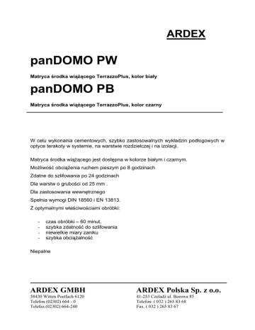 ARDEX panDOMO PW Matryca środka wiążącego TerrazzoPlus, kolor biały panDOMO PB Matryca środka wiążącego TerrazzoPlus, kolor czarny W celu wykonania cementowych, szybko zastosowalnych wykładzin podłogowych w optyce terakoty w systemie, na warstwie rozdzielczej i na izolacji. Matryca środka wiążącego jest dostępna w kolorze białym i czarnym. Możliwość obciążenia ruchem pieszym po 8 godzinach Zdatne do szlifowania po 24 godzinach Dla warstw o grubości od 25 mm . Dla zastosowania wewnętrznego Spełnia wymogi DIN 18560 i EN 13813. Z optymalnymi właściwościami obróbki: - czas obróbki – 60 minut, szybka zdatność do szlifowania niewielkie miary zaniku szybka obciążalność Niepalne ARDEX GMBH ARDEX Polska Sp. z o.o. 58430 Witten Postfach 6120 Telefon (02302) 664 - 0 Telefax (02302) 664-240 41-253 Czeladź ul. Borowa 85 Telefon: ( 032 ) 265 83 68 Fax. ( 032 ) 265 83 67 panDOMO PW Matryca środka wiążącego TerrazzoMicro, kolor biały panDOMO PB Matryca środka wiążącego TerrazzoMicro, kolor czarny Zakres zastosowania Dla zastosowania we wnętrzach. Dla wykonania cementowych, szlifowanych powierzchni wizualnych w optyce terakoty o szybkim utwardzeniu umożliwiającym chodzenie i wczesnej wytrzymałości początkowej´ - w systemie: grubość min. d = 25 mm na warstwie rozdzielczej: grubość min. d = 40 mm na pływającym jastrychu: grubość min. d = 45 mm na jastrychu gorącym: grubość min. d = 45 mm Zdatne do szlifowania. Jako normy wykonawcze obowiązują DIN 18560 i EN 13813 oraz DIN 18353 z następującą zmianą: Punkt 3.3.1 ma także zastosowanie dla systemów jednowarstwowych. Należy przy tym przestrzegać szybkiego utwardzenia matrycy środka wiążącego PANDOMO PW lub PB TerrazzoPlus. Przygotowanie podłoża Podłoże betonowe lub z jastrychu cementowego (wytrzymałości wg wymogów i odpowiednich norm DIN) musi być suche, trwałe i wolne od pyłu. W celu usunięcia zanieczyszczeń, środków zapobiegających przyleganiu, luźnych warstw wierzchnich i nagromadzeń środków wiążących należy podłoże obróbce za pomocą poddać piaskowania lub śrutowania. Aby zapewnić przyczepność do podłoża, należy wykonać jego obróbkę za pomocą namułu przyczepnego z matrycy środka wiążącego PANDOMO PW lub PB TerrazzoPlus, PANDOMO PR Primer zgodnie z zaleceniami producenta. Namuł przyczepny z matrycy środka wiążącego PANDOMO PW lub PB TerrazzoPlus nanosi się na podłże cementowe w konsystencji mułu lub stanie ciekłym. Stosunek mieszanki: 25 kg matrycy środka wiążącego PANDOMO PW lub PB TerrazzoPlus + ok. 6 litrów wody. Stosowanie materiału: Celem zarobienia należy wsypać matrycę środka wiążącego PANDOMO PW lub PB TerrazzoPlus do betoniarki przeciwbieżnej. Stosunek mieszanki dla mieszalnika 150litrowego wynosi: 75 kg drobnoziarnistego PANDOMO TG Uziarnienie ozdobne = 3 worki po 25 kg + 50 kg matrycy środka wiążącego PANDOMO PW lub PB TerrazzoPlus = 2 worki po 25 kg + 9-10 litrów wody Można stosować następujące Uziarnienia ozdobne PANDOMO TG: Nero 1-3 / 3-5 / 6-9 mm Rosso 1-3 / 3-5 / 6-9 mm Marrone-Ocra 1-3 / 3-5 / 6-9 mm Bianco-Rosé 1-3 / 3-5 / 6-9 mm Bianco 1-3 / 3-8 mm Obciążalność osiąga się po 1 dniu. Nie należy stosować żadnych domieszek jastrychowych, jak np. oleje mieszalnicze itd. Nie wolno mieszać z innymi cementami. Czas obróbki PANDOMO PW lub MB TerrazzoPlus wynosi ok. 1 godziny. Mieszanie, nanoszenie, wyrównywanie i gładzenie muszą następować po sobie w sposób ciągły. Powierzchnie należy wymiarować w takim stosunku, aby mogły one zostać ukończone w czasie jednej obróbki. Wyższe temperatury skracają czas obróbki. Niższe temperatury opóźniają utwardzenie. Nie wolno kłaść zaprawy w temperaturach poniżej +5°C. Szczeliny: Dowiązania jastrychowe lub powierzchnie częściowe kotwiczy się ze sobą za pomocą stali okrągłej. Szczeliny dylatacyjne budynku muszą być przejęte na miejscu występowania. Montaż odbywa się zgodnie z zaleceniami panDOMO PW Matryca środka wiążącego TerrazzoMicro, kolor biały panDOMO PB Matryca środka wiążącego TerrazzoMicro, kolor czarny producenta. Szczeliny ograniczenia pole wyznaczają granicę wykładziny wobec innych wykładzin lub rozgraniczają pole pracy. Szczeliny te muszą zawsze być prowadzone aż do podłoża nośnego albo do izolacji. Szczeliny brzegowe lub połączeniowe muszą zawsze być wykonane do wznoszących się ścian lub ograniczających elementów konstrukcji. Ich minimalna grubość wynosi 8 mm. Szczeliny pozorne ulokowane w jastrychu muszą być przejęte na miejscu występowania w wykładzinie wierzchniej, co najmniej ze szczeliną ograniczenia pola (wielkość ograniczenia pola musi zawsze odpowiadać aktualnym normom). Zastosowanie na ogrzewaniu podłogowym: W przypadku zastosowania matrycy środka wiążącego PANDOMO PW lub PB TerrazzoPlus na ogrzewaniu podłogowym wody gorącej można znacznie skrócić czas oczekiwania na ułożenie zaprawy. 3 dni po ułożeniu jastrychu rozpoczyna się nagrzewanie z temperaturą początkową + 25°C. Jest ona utrzymywana przez 3 dni. Następnie ustawia się maksymalną temperaturę początkową i utrzymuje przez kolejne 4 dni. Należy przy tym unikać ciągu powietrza. Dalsza obróbka powierzchniowa: Matryca środka wiążącego PANDOMO PW lub PB TerrazzoPlus nadaje się do chodzenia po 8 godzinach i jest zdatna do szlifowania po 1 dniu. W celu szlifowania podłogi należy stosować szlifierki trzytarczowe firmy MKS Funke GmbH. Osoba kontaktowa: MKS Funke GmbH Im Fisserhook 28 46395 Bocholt Telefon: +49 (0) 28 71 / 24 75 – 0 Telefaks: +49 (0) 28 71 / 24 75 50 www.mks-schleiftechnik.com E-Mail: [email protected] Należy przestrzegać: Dla równomiernego rozkładu obciążenia komunikacyjnego, np. w budownictwie 2 mieszkaniowym do 2,0 kN/m na warstwie izolacyjnej, obowiązuje minimalna grubość 45 mm dla matrycy środka wiążącego PANDOMO PW lub PB Terraz