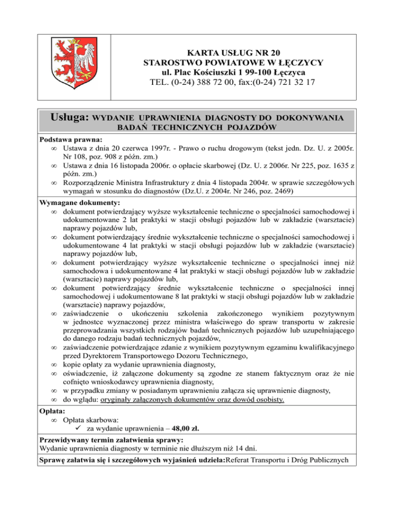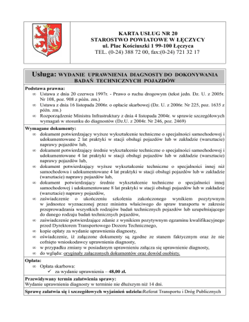 KARTA USŁUG NR 20 STAROSTWO POWIATOWE W ŁĘCZYCY ul. Plac Kościuszki 1 99-100 Łęczyca TEL. (0-24) 388 72 00, fax:(0-24) 721 32 17 Usługa: WYDANIE UPRAWNIENIA DIAGNOSTY DO DOKONYWANIA BADAŃ TECHNICZNYCH POJAZDÓW Podstawa prawna: • Ustawa z dnia 20 czerwca 1997r. - Prawo o ruchu drogowym (tekst jedn. Dz. U. z 2005r. Nr 108, poz. 908 z późn. zm.) • Ustawa z dnia 16 listopada 2006r. o opłacie skarbowej (Dz. U. z 2006r. Nr 225, poz. 1635 z późn. zm.) • Rozporządzenie Ministra Infrastruktury z dnia 4 listopada 2004r. w sprawie szczegółowych wymagań w stosunku do diagnostów (Dz.U. z 2004r. Nr 246, poz. 2469) Wymagane dokumenty: • dokument potwierdzający wyższe wykształcenie techniczne o specjalności samochodowej i udokumentowane 2 lat praktyki w stacji obsługi pojazdów lub w zakładzie (warsztacie) naprawy pojazdów lub, • dokument potwierdzający średnie wykształcenie techniczne o specjalności samochodowej i udokumentowane 4 lat praktyki w stacji obsługi pojazdów lub w zakładzie (warsztacie) naprawy pojazdów lub, • dokument potwierdzający wyższe wykształcenie techniczne o specjalności innej niż samochodowa i udokumentowane 4 lat praktyki w stacji obsługi pojazdów lub w zakładzie (warsztacie) naprawy pojazdów lub, • dokument potwierdzający średnie wykształcenie techniczne o specjalności innej samochodowej i udokumentowane 8 lat praktyki w stacji obsługi pojazdów lub w zakładzie (warsztacie) naprawy pojazdów, • zaświadczenie o ukończeniu szkolenia zakończonego wynikiem pozytywnym w jednostce wyznaczonej przez ministra właściwego do spraw transportu w zakresie przeprowadzania wszystkich rodzajów badań technicznych pojazdów lub uzupełniającego do danego rodzaju badań technicznych pojazdów, • zaświadczenie potwierdzające zdanie z wynikiem pozytywnym egzaminu kwalifikacyjnego przed Dyrektorem Transportowego Dozoru Technicznego, • kopie opłaty za wydanie uprawnienia diagnosty, • oświadczenie, iż załączone dokumenty są zgodne ze stanem faktycznym oraz że nie cofnięto wnioskodawcy uprawnienia diagnosty, • w przypadku zmiany w posiadanym uprawnieniu załącza się uprawnienie diagnosty, • do wglądu: oryginały załączonych dokumentów oraz dowód osobisty. Opłata: • Opłata skarbowa: za wydanie uprawnienia – 48,00 zł. Przewidywany termin załatwienia sprawy: Wydanie uprawnienia diagnosty w terminie nie dłuższym niż 14 dni. Sprawę załatwia się i szczegółowych wyjaśnień udziela:Referat Transportu i Dróg Publicznych Wydział:Wydział Komunikacji, Transportu i Dróg Publicznych Nr pokoju:7 Nr telefonu/faxu:tel. 0243887241/ fax 0243887237 Godziny pracy:poniedziałek, wtorek, czwartek: 8.00 – 14.00 środa: 8.00 – 15.30; piątek: 8.00 – 13.30 Sposób załatwienia sprawy: Wydanie imiennego uprawnienia diagnosty. Tryb odwoławczy: Odwołanie wnosi się do Samorządowego Kolegium Odwoławczego za pośrednictwem organu wydającego decyzję (odwołanie składa się w sekretariacie Starostwa lub w referacie prowadzącym sprawę). Odwołanie wnosi się w terminie 14 dni od daty doręczenia decyzji stronie. Uwagi: W przypadku braku kompletu wymaganych dokumentów wnioskodawca zostanie wezwany do ich uzupełnienia i złożenia w sekretariacie Starostwa lub w referacie prowadzącym sprawę.