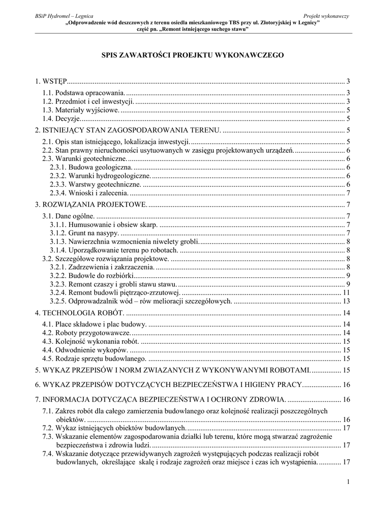BSiP Hydromel – Legnica Projekt wykonawczy „Odprowadzenie wód deszczowych z terenu osiedla mieszkaniowego TBS przy ul. Złotoryjskiej w Legnicy” część pn. „Remont istniejącego suchego stawu” SPIS ZAWARTOŚCI PROEJKTU WYKONAWCZEGO 1. WSTĘP...................................................................................................................................................... 3 1.1. Podstawa opracowania. ...................................................................................................................... 3 1.2. Przedmiot i cel inwestycji. ................................................................................................................. 3 1.3. Materiały wyjściowe. ......................................................................................................................... 5 1.4. Decyzje............................................................................................................................................... 5 2. ISTNIEJĄCY STAN ZAGOSPODAROWANIA TERENU. .................................................................. 5 2.1. Opis stan istniejącego, lokalizacja inwestycji.................................................................................... 5 2.2. Stan prawny nieruchomości usytuowanych w zasięgu projektowanych urządzeń............................ 6 2.3. Warunki geotechniczne...................................................................................................................... 6 2.3.1. Budowa geologiczna. .................................................................................................................. 6 2.3.2. Warunki hydrogeologiczne. ........................................................................................................ 6 2.3.3. Warstwy geotechniczne. ............................................................................................................. 6 2.3.4. Wnioski i zalecenia. .................................................................................................................... 7 3. ROZWIĄZANIA PROJEKTOWE. .......................................................................................................... 7 3.1. Dane ogólne. ...................................................................................................................................... 7 3.1.1. Humusowanie i obsiew skarp. .................................................................................................... 7 3.1.2. Grunt na nasypy. ......................................................................................................................... 7 3.1.3. Nawierzchnia wzmocnienia niwelety grobli............................................................................... 8 3.1.4. Uporządkowanie terenu po robotach. ......................................................................................... 8 3.2. Szczegółowe rozwiązania projektowe. .............................................................................................. 8 3.2.1. Zadrzewienia i zakrzaczenia. ...................................................................................................... 8 3.2.2. Budowle do rozbiórki.................................................................................................................. 9 3.2.3. Remont czaszy i grobli stawu stawu. .......................................................................................... 9 3.2.4. Remont budowli piętrząco-zrzutowej. ...................................................................................... 11 3.2.5. Odprowadzalnik wód – rów melioracji szczegółowych. .......................................................... 13 4. TECHNOLOGIA ROBÓT. .................................................................................................................... 14 4.1. Place składowe i plac budowy. ........................................................................................................ 14 4.2. Roboty przygotowawcze.................................................................................................................. 14 4.3. Kolejność wykonania robót. ............................................................................................................ 15 4.4. Odwodnienie wykopów. .................................................................................................................. 15 4.5. Rodzaje sprzętu budowlanego. ........................................................................................................ 15 5. WYKAZ PRZEPISÓW I NORM ZWIAZANYCH Z WYKONYWANYMI ROBOTAMI................. 15 6. WYKAZ PRZEPISÓW DOTYCZĄCYCH BEZPIECZEŃSTWA I HIGIENY PRACY..................... 16 7. INFORMACJA DOTYCZĄCA BEZPIECZEŃSTWA I OCHRONY ZDROWIA. ............................. 16 7.1. Zakres robót dla całego zamierzenia budowlanego oraz kolejność realizacji poszczególnych obiektów. ......................................................................................................................................... 16 7.2. Wykaz istniejących obiektów budowlanych.................................................................................... 17 7.3. Wskazanie elementów zagospodarowania działki lub terenu, które mogą stwarzać zagroŜenie bezpieczeństwa i zdrowia ludzi. ...................................................................................................... 17 7.4. Wskazanie dotyczące przewidywanych zagroŜeń występujących podczas realizacji robót budowlanych, określające skalę i rodzaje zagroŜeń oraz miejsce i czas ich wystąpienia. ............ 17 1 BSiP Hydromel – Legnica Projekt wykonawczy „Odprowadzenie wód deszczowych z terenu osiedla mieszkaniowego TBS przy ul. Złotoryjskiej w Legnicy” część pn. „Remont istniejącego suchego stawu” 7.5. Wskazanie sposobu prowadzenia instruktaŜu pracowników przed prz