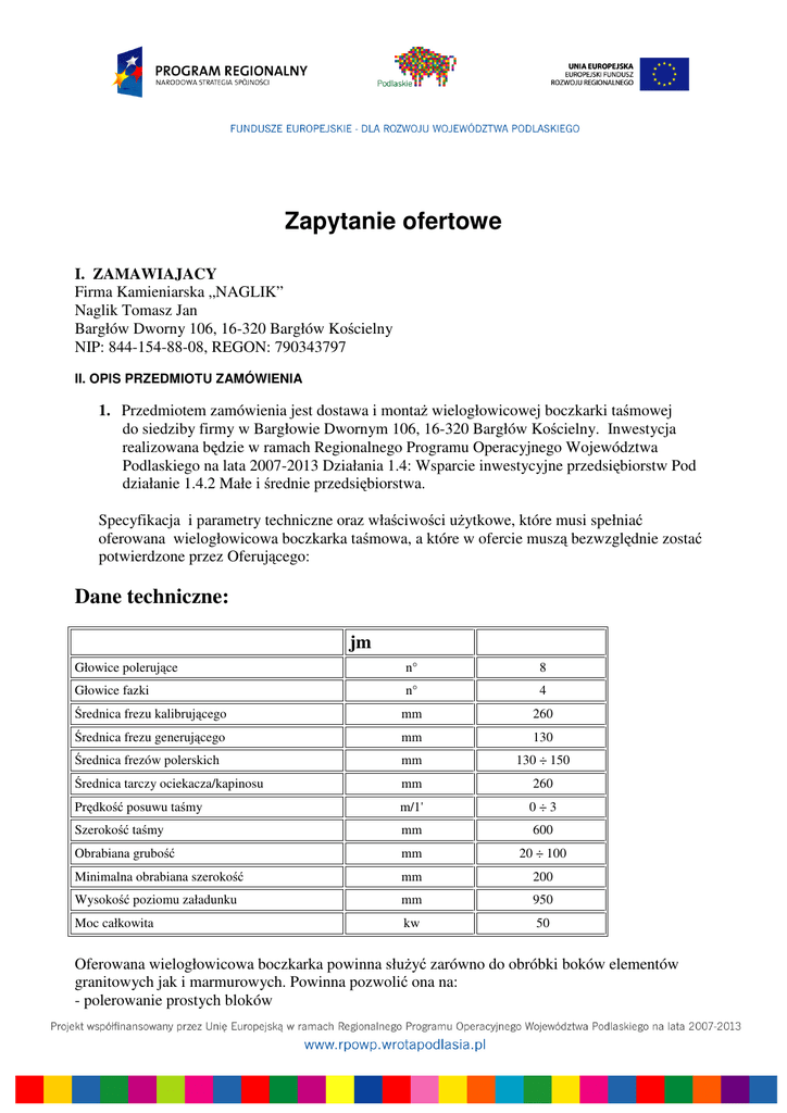 Zapytanie ofertowe I. ZAMAWIAJACY Firma Kamieniarska „NAGLIK” Naglik Tomasz Jan Bargłów Dworny 106, 16-320 Bargłów Kościelny NIP: 844-154-88-08, REGON: 790343797 II. OPIS PRZEDMIOTU ZAMÓWIENIA 1. Przedmiotem zamówienia jest dostawa i montaż wielogłowicowej boczkarki taśmowej do siedziby firmy w Bargłowie Dwornym 106, 16-320 Bargłów Kościelny. Inwestycja realizowana będzie w ramach Regionalnego Programu Operacyjnego Województwa Podlaskiego na lata 2007-2013 Działania 1.4: Wsparcie inwestycyjne przedsiębiorstw Pod działanie 1.4.2 Małe i średnie przedsiębiorstwa. Specyfikacja i parametry techniczne oraz właściwości użytkowe, które musi spełniać oferowana wielogłowicowa boczkarka taśmowa, a które w ofercie muszą bezwzględnie zostać potwierdzone przez Oferującego: Dane techniczne: jm Głowice polerujące n° 8 Głowice fazki n° 4 Średnica frezu kalibrującego mm 260 Średnica frezu generującego mm 130 Średnica frezów polerskich mm 130 ÷ 150 Średnica tarczy ociekacza/kapinosu mm 260 Prędkość posuwu taśmy m/1' 0÷3 Szerokość taśmy mm 600 Obrabiana grubość mm 20 ÷ 100 Minimalna obrabiana szerokość mm 200 Wysokość poziomu załadunku mm 950 Moc całkowita kw 50 Oferowana wielogłowicowa boczkarka powinna służyć zarówno do obróbki boków elementów granitowych jak i marmurowych. Powinna pozwolić ona na: - polerowanie prostych bloków - polerowanie boków toroidalnych - wykonanie fazek - wycinanie rowka ociekacza - wycinanie rowka w stopniach - kalibrowanie płyt - cięcie pod kątem - groszkowanie Dodatkowo oferowana wielogłowicowa boczkarka taśmowa musi być modelem urządzeń dostępnym na rynku światowym nie dłużej niż 3 lata, co Oferujący również potwierdzi w swojej ofercie 2. Zamawiający nie dopuszcza możliwości składania ofert częściowych. 3. Termin realizacji dostawy – od 01.03.2012 do 30.06.2012 r. III. OPIS SPOSOBU PRZYGOTOWANIA OFERTY Oferent powinien podać całościowa kwotę netto za przedmiot zamówienia. Oferta powinna być: - opatrzona pieczątką firmową, - posiadać datę sporządzenia, - zawierać adres lub siedzibę oferenta oraz numer NIP, - podpisana przez wykonawcę. W przypadku wyboru oferty udzielenie zamówienia nastąpi poprzez zawarcie umowy w formie pisemnej. IV. MIEJSCE ORAZ TERMIN SKŁADANIA OFERT 1. Oferta powinna być przesłana za pośrednictwem: poczty elektronicznej na adres [email protected], faksu na nr: + 48 87 641 33 00, poczty, kuriera lub tez dostarczona osobiście na adres: Bargłów Dworny 106, 16-320 Bargłów Kościelny do dnia 2012-0130. 2. Ocena ofert zostanie dokonana w dniu 2012-02-01, a wyniki i wybór najkorzystniejszej oferty zostanie ogłoszony o godzinie 11:00 w siedzibie firmy Firma Kamieniarska „NAGLIK” 3. Oferty złożone po terminie nie będą rozpatrywane 4. Oferent może przed upływem terminu składania ofert zmienić lub wycofać swoja ofertę. 5. W toku badania i oceny ofert Zamawiający może żądać od oferentów wyjaśnień dotyczących treści złożonych ofert. V. OCENA OFERT Zamawiający dokona oceny ważnych ofert na podstawie następujących kryteriów: 1. Cena 100% VI. DODATKOWE INFORMACJE Dodatkowych informacji udziela Pan Tomasz Jan Naglik pod numerem telefonu + 48 87 6424114 oraz adresem email: [email protected] lub Iza Olszewska pod numerem telefonu + 48 87 6424114 oraz adresem email: [email protected]