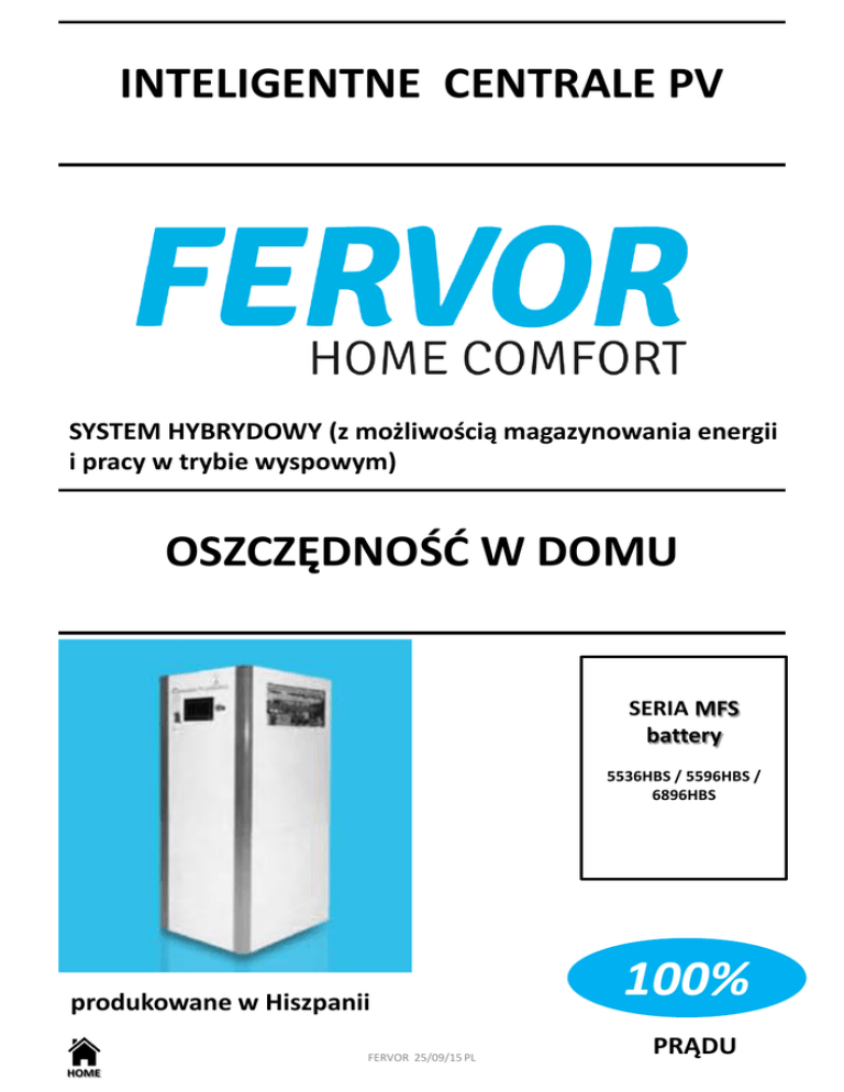 INTELIGENTNE CENTRALE PV SYSTEM HYBRYDOWY (z możliwością magazynowania energii i pracy w trybie wyspowym) OSZCZĘDNOŚĆ W DOMU SERIA MFS battery 5536HBS / 5596HBS / 6896HBS produkowane w Hiszpanii FERVOR 25/09/15 PL HOME 100% PRĄDU CENTRALE PV MFS-BATTERY … OSZCZĘDNOŚĆ W DOMU KOMPLETNA CENTRALA PV Z BATERIĄ AKUMULATORÓW Energia wyprodukowana przez panele fotowoltaiczne jest przeznaczana przede wszystkim na potrzeby budynku, oświetlenie lub zasilanie innych urządzeń. System w przypadku nadwyżki energii, przeznacza ją do użytku domowego: ładowania akumulatorów magazynu energii lub ładowania akumulatorów samochodów elektrycznych. Automatyka zarządza energią elektryczną wyprodukowaną z paneli fotowoltaicznych, akumulatorów lub sieci w czasie rzeczywistym tak, aby uzyskać jak najwyższą opłacalność i efektywność energetyczną. Gdy budynek zużywa więcej energii niż wytwarzają panele, automatycznie pobierze brakującą energię z sieci elektrycznej. W przypadku, gdy panele fotowoltaiczne wyprodukują więcej energii niż potrzebuje budynek, zostanie ona do sieci oddana. 2 FERVOR 25/09/15 PL HOME CENTRALE PV MFS-BATTERY … OSZCZĘDNOŚĆ W DOMU DANE TECHNICZNE Model / nazwa skrócona produktu MFS-battery MFS 5536HBS MFS 5596HBS MFS 6896HBS Specyfikacja elektryczna Inwerter AC - wyjście Moc wyjściowa (ciągła) przy 25°C Przeciążenie 30min / 60sek przy 25°C Moc wyjściowa (ciągła) przy 40°C Max. prąd wyjściowy 60 sekund (rms) Częstotliwość wyjściowa Napięcie wyjściowe 5500 W 5500 W 6800 W 7000 W / 9000 W 7000 W / 9000 W 8500 W / 12000 W 4500 W 4500 W 6000 W 40 A 40A 53 A 50 / 60 Hz 50 / 60 Hz 50 / 60 Hz 230 Vac 230 Vac 230 Vac Zużycie wyszukiwania(stand-by) ˂7W ˂7W ˂7W Zakres napięcia wejściowego DC 40 do 64 V (nominalne 48 V) 40 do 64 V (nominalne 48 V) 40 do 64 V (nominalne 48 V) Maksymalny prąd wejściowy DC 150 A 150 A 180 A Ładowanie - wyjście DC Maksymalny prąd wyjściowy ładowania Wyjście - zakres napięcia ładowania Kontrola naładowania Kompensacja temperatury ładowania Współczynnik mocy (ładowanie) 110 A 110 A 140 A 40 do 64 V (nominalne 48 V) 40 do 64 V (nominalne 48 V) 40 do 64 V (nominalne 48 V) trójstopniowa/dwustopniowa trójstopniowa/dwustopniowa trójstopniowa/dwustopniowa zawiera czujnik temperatury baterii zawiera czujnik temperatury baterii zawiera czujnik temperatury batterii 0,98 0,98 0,98 Żelowe, opcionalnie: LiON Żelowe, opcionalnie: LiON Żelowe, opcionalnie: LiON 3,6 kWh 9,6 kWh 9,6 kWh AC 1 (sieć) prąd wejściowy (do wyboru limitu) 3 - 60 A (domyślnie 56 A) 3 - 60 A (domyślnie 56 A) 3 - 60 A (domyślnie 56 A) AC 2 (generator) prąd wejściowy (do wyboru limitu) 3 - 60 A (domyślnie 56 A) 3 - 60 A (domyślnie 56 A) 3 - 60 A (domyślnie 56 A) Automatyczne przenoszenie - przekaźnik / Typowy czas transferu 60 A / 8ms 60 A / 8ms 60 A / 8ms Nominalne napięcie wejściowe AC 230 V ± 3% 230 V ± 3% 230 V ± 3% Sieć, oddawanie na AC1 (max) 4,5 kVA 4,5 kVA 6,0 kVA Zakres prądu oddawanego do sieci AC1 (zakres wyboru) 0 - 20 A 0 -20 A 205 - 262 Vrms (automatyczna regulacja) 205 - 262 Vrms (automatyczna regulacja) 205 - 262 Vrms (automatyczna regulacja) 48 - 51 Hz (automatyczna regulacja) 48 - 51 Hz (automatyczna regulacja) 48 - 51 Hz (automatyczna regulacja) 0,5 0,5 0,5 95,80% 95,80% 95,80% 1800/600/700mm 1800/600/700mm 1800/600/700mm IP20 IP20 IP20 -25 do +70 (spadek mocy powyżej 25) -25 do +70 (spadek mocy powyżej 25) -25 do +70 (spadek mocy powyżej 25) 2 - 5 lat 2 - 5 lat 2 - 5 lat dostępny dostępny dostępny regulacja częstotliwości regulacja częstotliwości Rodzaje baterii Pojemność banku baterii Wejście AC Wyjście AC (sieć) Zakres napięcia oddawanego do sieci AC1 Zakres częstotliwości - oddawanie do sieci AC1 Zakres współczynnika mocy oddawanej do sieci (lead/lag) Efektywność Szczyt Specyfikacja ogólna Wymiary produktu (W/Sz/G) Stopień ochrony Zakres temperatur pracy (otoczenia) °C Gwarancja Cechy dodatkowe System monitorowania systemu komunikacji i sieci Inteligentne funkcje sprzedaż do sieci, szczytowe zmniejszenie obciążenia, obsługa generatora, priorytet: zużycie energii, baterii lub zasilania zewnętrznego Port pomocniczy Off-grid - sprzężenie AC regulacja częstotliwości Obsługa wielu urządzeń jednofazowe: do czterech jednostek równolegle, trzy fazy: do 12 jednostek w konfiguracji multi-klastra z zewnętrznego stycznika AC Moduł komunikacji router VPN, serwer WWW router VPN, serwer WWW router VPN, serwer WWW Moduł sterujący przewidywanie opcja opcja opcja Ładowanie pojazdów elektrycznych opcja opcja opcja EN61000-6-1, EN61000-6-3, EN61000-3-2 EN61000-6-1, EN61000-6-3, EN61000-3-2 EN61000-6-1, EN61000-6-3, EN61000-3-2 EN50178 EN50178 EN50178 IEC 62109-1, IEC 62109-2, AS3100 IEC 62109-1, IEC 62109-2, AS3100 IEC 62109-1, IEC 62109-2, AS3100 EN50438-2013 EN50438-2013 EN50438-2013 Zgodność z normami i regulacjami Znak CE zgodnie z następującymi dyrektywami i normami UE: Dyrektywa EMC Dyrektywa niskonapięciowa Bezpieczeństwo Połączenie z siecią www.fervor.eu Informacje podane w tej publikacji mają charakter informacyjny. Producent zastrzega sobie prawo do wprowadzania zmian lub modyfikacji, które uzna za niezbędne dla poprawy produktu. 3 FERVOR 25/09/15 PL HOME