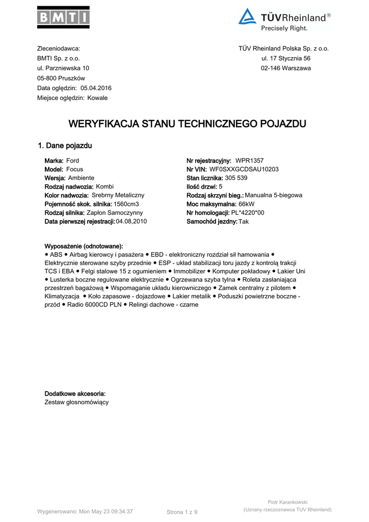 Zleceniodawca: TÜV Rheinland Polska Sp. z o.o. BMTI Sp. z o.o. ul. 17 Stycznia 56 ul. Parzniewska 10 02-146 Warszawa 05-800 Pruszków Data oględzin: 05.04.2016 Miejsce oględzin: Kowale WERYFIKACJA STANU TECHNICZNEGO POJAZDU 1. Dane pojazdu Marka: Ford Model: Focus Wersja: Ambiente Rodzaj nadwozia: Kombi Kolor nadwozia: Srebrny Metaliczny Pojemność skok. silnika: 1560cm3 Rodzaj silnika: Zapłon Samoczynny Data pierwszej rejestracji: 04.08,2010 Nr rejestracyjny: WPR1357 Nr VIN: WF0SXXGCDSAU10203 Stan licznika: 305 539 Ilość drzwi: 5 Rodzaj skrzyni bieg.: Manualna 5-biegowa Moc maksymalna: 66kW Nr homologacji: PL*4220*00 Samochód jezdny: Tak Wyposażenie (odnotowane): ● ABS ● Airbag kierowcy i pasażera ● EBD - elektroniczny rozdział sił hamowania ● Elektrycznie sterowane szyby przednie ● ESP - układ stabilizacji toru jazdy z kontrolą trakcji TCS i EBA ● Felgi stalowe 15 z ogumieniem ● Immobilizer ● Komputer pokładowy ● Lakier Uni ● Lusterka boczne regulowane elektrycznie ● Ogrzewana szyba tylna ● Roleta zasłaniająca przestrzeń bagażową ● Wspomaganie układu kierowniczego ● Zamek centralny z pilotem ● Klimatyzacja ● Koło zapasowe - dojazdowe ● Lakier metalik ● Poduszki powietrzne boczne przód ● Radio 6000CD PLN ● Relingi dachowe - czarne Dodatkowe akcesoria: Zestaw głosnomówiący Wygenerowano: Mon May 23 09:34:37 Strona 1 z 9 Piotr Karankowski (Uznany rzeczoznawca TUV Rheinland) 2. Stan pojazdu 2.1 Układ jezdny. Stan ogumienia: Opona lewa przednia: Producent, model: Platin RP50 Winter Rodzaj: Zimowa Wysokość bieżnika: 6 Opona prawa przednia: Producent, model: Platin RP50 Winter Rodzaj: Zimowa Wysokość bieżnika: 6 Opona lewa tylna: Producent, model: Platin RP50 Winter Rodzaj: Zimowa Wysokość bieżnika: 5 Opona prawa tylna: Producent, model: Platin RP50 Winter Rodzaj: Zimowa Wysokość bieżnika: 5 Stan obręczy kół/kołpaków: Kołpaki kół niewielkie ślady zarysowań Zaobserwowany stan tarcz/klocków hamulcowych: Bliskie zużycia Niepokojące odgłosy/objawy stwierdzone w trakcie jazdy próbnej: Brak (C) TÜV, TUEV, TUV, are registred trademarks. Utilisation and application requires prior approval. Uwagi inne: Zużyte przednie amortyzatory. Wygenerowano: Mon May 23 09:34:37 Strona 2 z 9 Piotr Karankowski (Uznany rzeczoznawca TUV Rheinland) 2.2 Nadwozie pojazdu. Pomiar lakieru wykonany miernikiem: 150-176 140-146 228-242 Limit 5100 145-200 230-270 190-237 190-207 250-999 180-218 189-221 168-260 (C) TÜV, TUEV, TUV, are registred trademarks. Utilisation and application requires prior approval. Uszkodzenia nadwozia: MASKA SILNIKA - wgniecenia, PROG DRZWI T P - wgięty, ZDERZAK T – odkształcony, POKRYWA BAGAŻNIKA – wgięta/ogniska korozji, SCIANA BOCZNA T L Odpryski lakieru/ogniska korozji, SC BOCZNA T P KPL NAPRAWA – wgięta odpryski lakieru/korozja, ZDERZAK P – odpryski lakieru/trwałe zarysowania, DRZWI PRZ L – trwałe zarysowania, DRZWI T L – trwałe zarysowania, LUSTERKO ZEWN L – popękane, KOŁO KIEROWNICY wytarte Szyby pojazdu: Szyba przednia NordGlass rok 2003 Uwagi inne: Nadwosie wymaga polerowania w celu usunięcia drobnych zarysowań Wygenerowano: Mon May 23 09:34:37 Strona 3 z 9 Piotr Karankowski (Uznany rzeczoznawca TUV Rheinland) 2.3 Wnętrze pojazdu. Stan tapicerki foteli oraz tapicerek drzwiowych: Brak uwag Stan podsufitki, deski rozdzielczej, oraz wykończeń przedziału bagażowego: Brak uwag Tablica rozdzielcza - świecące kontrolki: Brak powiadomień Uwagi inne: Brak uszkodzeń 2.4 Układ napędowy. Wycieki w układzie napędowym: Brak widocznych wycieków Nieprawidłowości w pracy układu napędowego: Amortyzatory wskazują na zużycie Stan układu wydechowego: Układ wydechowy widoczna korozja (C) TÜV, TUEV, TUV, are registred trademarks. Utilisation and application requires prior approval. 2.5 Kompletność pojazdu. Do samochodu dołączono: - Klucze (szt): 1 - Dowód rejestracyjny: TAK - Instrukcję obsługi: TAK - Książkę serwisową - data ostatniego wpisu: 30.03.2014 - Koło zapasowe - wysokość bieżnika: Dojazdowe 5 mm - Kompletny zestaw narzędzi: TAK - Sprawny podnośnik: TAK - Ważna gaśnicę - data ważności: Nieczytelna Drugi komplet kół/opon: Rodzaj opon: Brak Rodzaj felg: Ilość, marka, model i rozmiar opon: Wygenerowano: Mon May 23 09:34:37 Strona 4 z 9 Piotr Karankowski (Uznany rzeczoznawca TUV Rheinland) 3. Dodatkowe uwagi. Rzeczoznawca przeprowadzający weryfikację oraz TÜV Rheinland Polska sp. z o.o. nie biorą odpowiedzialności za wady ukryte pojazdu oraz wady których nie dotyczyła powyższa weryfikacja. Powyższa weryfikacja stanu pojazdu została sporządzona organoleptycznie, oraz za pomocą wymienionych w formularzu urządzeń. Weryfikacja nie ma charakteru diagnostyki uszkodzeń pojazdu. Dodatkowe uwagi: Brak (C) TÜV, TUEV, TUV, are registred trademarks. Utilisation and application requires prior approval. 4. Zdjęcia pojazdu. Wygenerowano: Mon May 23 09:34:39 Strona 5 z 9 Piotr Karankowski (Uznany rzeczoznawca TUV Rheinland) Wygenerowano: Mon May 23 09:34:42 Strona 6 z 9 Piotr Karankowski (Uznany rzeczoznawca TUV Rheinland) (C) TÜV, TUEV, TUV, are registred trademarks. Utilisation and application requires prior approval. Wygenerowano: Mon May 23 09:34:43 Strona 7 z 9 Piotr Karankowski (Uznany rzeczoznawca TUV Rheinland) (C) TÜV, TUEV, TUV, are registred trademarks. Utilisation and application requires prior approval. (C) TÜV, TUEV, TUV, are registred trademarks. Utilisation and application requires prior approval. 5. Wartość pojazdu Jako zużycie ponadnormatywne uznano: MASKA SILNIKA - wgniecenia, PROG DRZWI T P - wgięty, ZDERZAK T – odkształcony, POKRYWA BAGAŻNIKA – wgięta, SCIANA BOCZNA T L Odpryski lakieru/ogniska korozji, SC BOCZNA T P KPL NAPRAWA – wgięta odpryski lakieru/korozja, DRZWI PRZ L – trwałe zarysowania, DRZWI T L – trwałe zarysowania, LUSTERKO ZEWN L – popękane, Wartość pojazdu obliczona za pomocą 