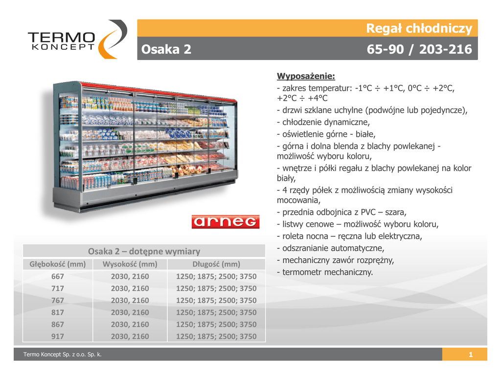 Regał chłodniczy Osaka 2 Osaka 2 – dotępne wymiary Głębokość (mm) 667 717 767 817 867 917 Termo Koncept Sp. z o.o. Sp. k. Wysokość (mm) 2030, 2160 2030, 2160 2030, 2160 2030, 2160 2030, 2160 2030, 2160 Długość (mm) 1250; 1875; 2500; 3750 1250; 1875; 2500; 3750 1250; 1875; 2500; 3750 1250; 1875; 2500; 3750 1250; 1875; 2500; 3750 1250; 1875; 2500; 3750 65-90 / 203-216 Wyposażenie: - zakres temperatur: -1°C ÷ +1°C, 0°C ÷ +2°C, +2°C ÷ +4°C - drzwi szklane uchylne (podwójne lub pojedyncze), - chłodzenie dynamiczne, - oświetlenie górne - białe, - górna i dolna blenda z blachy powlekanej możliwość wyboru koloru, - wnętrze i półki regału z blachy powlekanej na kolor biały, - 4 rzędy półek z możliwością zmiany wysokości mocowania, - przednia odbojnica z PVC – szara, - listwy cenowe – możliwość wyboru koloru, - roleta nocna – ręczna lub elektryczna, - odszranianie automatyczne, - mechaniczny zawór rozprężny, - termometr mechaniczny. 1 Regał chłodniczy Osaka 2 Termo Koncept Sp. z o.o. Sp. k. 65-90 / 203-216 2