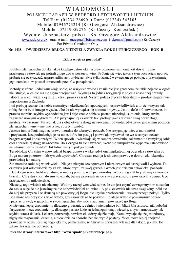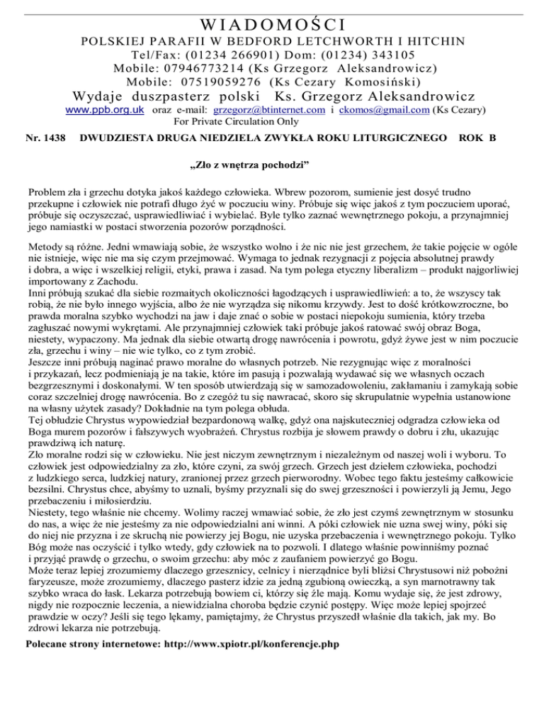 WIADOMOŚCI POLSKIEJ PARAFII W BEDFORD LETCHWORTH I HITCHIN Tel/Fax: (01234 266901) Dom: (01234) 343105 Mobile: 07946773214 (Ks Grzegorz Aleksandrowicz) Mobile: 07519059276 (Ks Cezary Komosi ński) Wydaje duszpasterz polski Ks. Grzegorz Aleksandrowicz www.ppb.org.uk oraz e-mail: [email protected] i [email protected] (Ks Cezary) For Private Circulation Only Nr. 1438 DWUDZIESTA DRUGA NIEDZIELA ZWYKŁA ROKU LITURGICZNEGO ROK B „Zło z wnętrza pochodzi” Problem zła i grzechu dotyka jakoś każdego człowieka. Wbrew pozorom, sumienie jest dosyć trudno przekupne i człowiek nie potrafi długo żyć w poczuciu winy. Próbuje się więc jakoś z tym poczuciem uporać, próbuje się oczyszczać, usprawiedliwiać i wybielać. Byle tylko zaznać wewnętrznego pokoju, a przynajmniej jego namiastki w postaci stworzenia pozorów porządności. Metody są różne. Jedni wmawiają sobie, że wszystko wolno i że nic nie jest grzechem, że takie pojęcie w ogóle nie istnieje, więc nie ma się czym przejmować. Wymaga to jednak rezygnacji z pojęcia absolutnej prawdy i dobra, a więc i wszelkiej religii, etyki, prawa i zasad. Na tym polega etyczny liberalizm – produkt najgorliwiej importowany z Zachodu. Inni próbują szukać dla siebie rozmaitych okoliczności łagodzących i usprawiedliwień: a to, że wszyscy tak robią, że nie było innego wyjścia, albo że nie wyrządza się nikomu krzywdy. Jest to dość krótkowzroczne, bo prawda moralna szybko wychodzi na jaw i daje znać o sobie w postaci niepokoju sumienia, który trzeba zagłuszać nowymi wykrętami. Ale przynajmniej człowiek taki próbuje jakoś ratować swój obraz Boga, niestety, wypaczony. Ma jednak dla siebie otwartą drogę nawrócenia i powrotu, gdyż żywe jest w nim poczucie zła, grzechu i winy – nie wie tylko, co z tym zrobić. Jeszcze inni próbują naginać prawo moralne do własnych potrzeb. Nie rezygnując więc z moralności i przykazań, lecz podmieniają je na takie, które im pasują i pozwalają wydawać się we własnych oczach bezgrzesznymi i doskonałymi. W ten sposób utwierdzają się w samozadowoleniu, zakłamaniu i zamykają sobie coraz szczelniej drogę nawrócenia. Bo z czegóż tu się nawracać, skoro się skrupulatnie wypełnia ustanowione na własny użytek zasady? Dokładnie na tym polega obłuda. Tej obłudzie Chrystus wypowiedział bezpardonową walkę, gdyż ona najskuteczniej odgradza człowieka od Boga murem pozorów i fałszywych wyobrażeń. Chrystus rozbija je słowem prawdy o dobru i złu, ukazując prawdziwą ich naturę. Zło moralne rodzi się w człowieku. Nie jest niczym zewnętrznym i niezależnym od naszej woli i wyboru. To człowiek jest odpowiedzialny za zło, które czyni, za swój grzech. Grzech jest dziełem człowieka, pochodzi z ludzkiego serca, ludzkiej natury, zranionej przez grzech pierworodny. Wobec tego faktu jesteśmy całkowicie bezsilni. Chrystus chce, abyśmy to uznali, byśmy przyznali się do swej grzeszności i powierzyli ją Jemu, Jego przebaczeniu i miłosierdziu. Niestety, tego właśnie nie chcemy. Wolimy raczej wmawiać sobie, że zło jest czymś zewnętrznym w stosunku do nas, a więc że nie jesteśmy za nie odpowiedzialni ani winni. A póki człowiek nie uzna swej winy, póki się do niej nie przyzna i ze skruchą nie powierzy jej Bogu, nie uzyska przebaczenia i wewnętrznego pokoju. Tylko Bóg może nas oczyścić i tylko wtedy, gdy człowiek na to pozwoli. I dlatego właśnie powinniśmy poznać i przyjąć prawdę o grzechu, o swoim grzechu: aby móc z zaufaniem powierzyć go Bogu. Może teraz lepiej zrozumiemy dlaczego grzesznicy, celnicy i nierządnice byli bliżsi Chrystusowi niż pobożni faryzeusze, może zrozumiemy, dlaczego pasterz idzie za jedną zgubioną owieczką, a syn marnotrawny tak szybko wraca do łask. Lekarza potrzebują bowiem ci, którzy się źle mają. Komu wydaje się, że jest zdrowy, nigdy nie rozpocznie leczenia, a niewidzialna choroba będzie czynić postępy. Więc może lepiej spojrzeć prawdzie w oczy? Jeśli się tego lękamy, pamiętajmy, że Chrystus przyszedł właśnie dla takich, jak my. Bo zdrowi lekarza nie potrzebują. Polecane strony internetowe: http://www.xpiotr.pl/konferencje.php MSZE ŚWIĘTE I NABOŻEŃSTWA w BEDFORD: Charity Reg.No.1119423 DWUDZIESTA DRUGA NIEDZIELA ROKU LITURGICZNEGO – Rok B Godz. 9.30 - O błog.Boże i potrzebne łaski dla Konrada z okazji urodzin – int. rodziców Godz.19.00 - O błog. Boże i potrzebne łaski dla Marleny i Eriona z okazji 4-ej rocznicy ślubu oraz z okazji urodzin – int. rodziców. Poniedziałek, 31.08. Godz. 9.30 - za dusze ś.p.Stanisława i Dominiki Miskiewicz int. kolegi Ernesta Witulskiego. Wtorek. 1.09.2015 Godz. 9.30 - O błogosławieństwo Boże dla Michała i chrzestnej - int. babci. Środa, 2.09.2015 Godz.19.00 - Intencja wolna. Niedziela,30.08.2015 Godz. 9.30 - O błog. Boże i opiekę Matki Bożej dla Ks Grzegorza Aleksandrowicza i Brata Mariana - int. Parafian. - PIERWSZY PIĄTEK miesiąca WRZEŚNIA Godz. 15.00 - za dusze ś.p.Tomas Juska - int. przyjaciół. Koronka do Miłosierdzia Bożego. Godz. 18.00 - Spowiedź Sw. dla dzieci Komunijnych z okazji Pierwszego piątku miesiąca. Godz. 19.00 - Intencja wolna. Godz. 9.30 - Intencja wolna. Godz. 10.00 - ADORACJA NAJŚWIĘTSZEGO SAKRAMENTU. Godz.19.00 - Intencja wolna. Niedziela, 6.09.2015 DWUDZIESTA TRZECIA NIEDZIELA ROK LITURGICZNEGO RokB Godz. 9.30 - O błog.Boże i potrzebne łaski dla Ewy i Rolanda Arapi, Marleny i Eriona oraz Wioletty i Alfreda Arapi w kolejną rocznicę ślubu - int. rodziców. Godz.18.00 - ADORACJA NAJŚWIETSZEGO SAKRAMENTU Godz.19.00 -O błog. Boże i opiekę Matki Bożej dla Kamila z ok.40-tych urodzin–int.rodziny. Poniedziałek, 7.09. Godz. 9.30 - Intencja wolna. Godz.19.00 - Intencja wolna. Wtorek, 8.09.2015 Godz.19.00 - za dusze ś.p. Krystyny Jakubowskiej i Marii Kręciszewskiej – int. rodziny. Narodzenie NMP Środa, 9.09.2015 Godz.19.00 - Intencja wolna. Czwartek,10