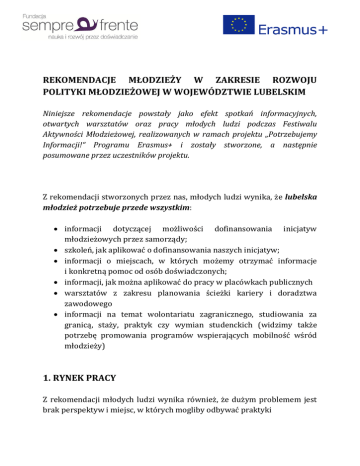 REKOMENDACJE MŁODZIEŻY W ZAKRESIE ROZWOJU POLITYKI MŁODZIEŻOWEJ W WOJEWÓDZTWIE LUBELSKIM Niniejsze rekomendacje powstały jako efekt spotkań informacyjnych, otwartych warsztatów oraz pracy młodych ludzi podczas Festiwalu Aktywności Młodzieżowej, realizowanych w ramach projektu „Potrzebujemy Informacji!“ Programu Erasmus+ i zostały stworzone, a następnie posumowane przez uczestników projektu. Z rekomendacji stworzonych przez nas, młodych ludzi wynika, że lubelska młodzież potrzebuje przede wszystkim: informacji dotyczącej możliwości dofinansowania inicjatyw młodzieżowych przez samorządy; szkoleń, jak aplikować o dofinansowania naszych inicjatyw; informacji o miejscach, w których możemy otrzymać informacje i konkretną pomoc od osób doświadczonych; informacji, jak można aplikować do pracy w placówkach publicznych warsztatów z zakresu planowania ścieżki kariery i doradztwa zawodowego informacji na temat wolontariatu zagranicznego, studiowania za granicą, staży, praktyk czy wymian studenckich (widzimy także potrzebę promowania programów wspierających mobilność wśród młodzieży) 1. RYNEK PRACY Z rekomendacji młodych ludzi wynika również, że dużym problemem jest brak perspektyw i miejsc, w których mogliby odbywać praktyki odpowiadające ich zainteresowaniom czy wykształceniu. Zarówno studenci jak i licealiści często widzą rynek pracy jako miejsce dla osób posiadających kontakty, „znajomości”, bardziej niż miejsce dla ambitnych i wykształconych młodych ludzi. 2. INFORMACJA MŁODZIEŻOWA I DIALOG Z DECYDENTAMI Młodzi ludzie są często nieświadoma jakie możliwości oferują samorządy lokalne, granty europejskie, czy instytucje pożytku publicznego, apelujemy więc do władz lokalnych o stwarzanie możliwości dialogu i informacji. Wypracowaliśmy również swoje stanowisko wobec problemów aktywności społecznej: Pokazujemy tym samym, że chcemy działać, być widoczni i aktywni w życiu społecznym, ale jesteśmy niedoinformowani i uważamy, że w kwestiach młodzieżowych bardziej widoczne jest wsparcie Unii Europejskiej niż Państwa Polskiego. 3. ROZWÓJ OSOBISTY I SPOŁECZNY Młodzi ludzie, którzy angażują się społecznie widzą potrzebę tworzenia sieci współpracy pomiędzy organizacjami pozarządowymi, a szkołami/uniwersytetami i samorządami. Podkreślają rosnącą potrzebę tworzenia przestrzeni do współpracy, ze względu na brak zrozumienia potrzeb młodzieży. Widzimy potrzebę rozwoju zarówno interpersonalnego jak i zawodowego, praktycznego. Udzielając się społecznie przy poszczególnych akcjach wzrosła nasza siła i potrzeba ciągłego zdobywania doświadczenia poprzez działanie. 4. ROLA EDUKACJI POZAFORMALNEJ Czynnikiem wstrzymującym nas przed działaniem jest nierzadko szkoła i rodzice często nierozumiejący korzyści płynących z aktywnego spędzania czasu pozaszkolnego. Młodzi ludzie wśród swoich rówieśników widzą nierzadko chęć działania ograniczaną potrzebą zdobywania jak najlepszych wyników w szkole. Władze lokalne jako autorytet, idąc za rekomendacjami młodzieży, powinny kłaść nacisk na to, by w szkołach respektowano aktywną postawę obywatelską, uczono o niej w sposób atrakcyjny na przedmiotach takich jak Wiedza o Społeczeństwie. Praktyczna wiedza, to coś, czego najbardziej brakuje młodzieży w szkołach. Rekomendowana przez nas jest wspierająca postawa władz lokalnych w stosunku do miejsc, w których młodzi ludzie otrzymują możliwość udzielania się społecznie. Taka postawa powinna być jednocześnie widoczna i wyraźna dla szkół, nauczycieli i rodziców. 5. PROPOZYCJE DZIAŁAŃ Tworząc rekomendacje wypracowaliśmy także konkretne propozycje działań, które samorządy lokalne, kuratoria oświaty i inne instytucję zajmujące się młodzieżą, mogłyby podjąć w celu poprawy jakości aktywnego uczestnictwa młodzieży w życiu publicznym: promocja postawy aktywnego społecznie obywatela (szczególnie wśród rodziców i nauczycieli), kładąca nacisk przede wszystkim na promocję korzyści płynących z przejawiania takich postaw, z bycia aktywnym położenie większego nacisku na zajęcia praktyczne w ramach zajęć szkolnych - pokazywanie możliwości, jakie stoją przed młodym człowiekiem dialog decydentów z młodzieżą w postaci otwartych spotkań, debat, warsztatów organizacja warsztatów/szkoleń ukazujących możliwości dofinansowania młodzieżowych inicjatyw lokalnych promocja działalności centrów informacji młodzieżowej, wskazywanie na potrzebę ich istnienia. wsparcie merytoryczne i finansowe dla Centrum Informacji i Rozwoju Młodzieży