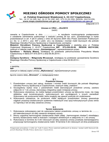 MIEJSKI OŚRODEK POMOCY SPOŁECZNEJ ul. Polskiej Organizacji Wojskowej 2, 42-217 Częstochowa, Tel.: 34 37 24 200, fax: 34 37 24 250, NIP: 573-23-02-950, REGON: 002741290, www.mops.czestochowa.um.gov.pl. [email protected] Załącznik nr 5 Umowa nr CRU/...../Zm/2015 (wzór) zawarta w Częstochowie w dniu .........………... w rezultacie rozstrzygnięcia postępowania o udzielenie zamówienia publicznego o wartości poniżej 30 tys. euro, prowadzonego w trybie przewidzianym w art. 4 pkt 8 ustawy z dnia 29 stycznia 2004 roku Prawo Zamówień Publicznych (j.t. Dz. U. z 2013 r. poz. 907 z późn. zm.) na dostawę i montaż mebli biurowych dla potrzeb Miejskiego Ośrodka Pomocy Społecznej w Częstochowie, pomiędzy: Miejskim Ośrodkiem Pomocy Społecznej w Częstochowie z siedzibą przy ul. Polskiej Organizacji Wojskowej 2, 42-217 Częstochowa NIP: 573-230-29-50, REGON: 002741290, zwanym w dalszej części umowy „Zamawiającym”, reprezentowanym przez: Dyrektora – Barbarę Mizerę, działającą na podstawie pełnomocnictwa Prezydenta Miasta Częstochowy nr BDG.077.610.2014 z dnia 06.06.2014 r. oraz Zastępcę Dyrektora – Małgorzatę Mruszczyk, działającą na podstawie upoważnienia Dyrektora Miejskiego Ośrodka Pomocy Społecznej w Częstochowie z dnia 09.06.2014 r. a ...................................................................................................................................... z siedzibą ..................................................................................................................... NIP: ………………………, REGON: ……………………., zwanym w dalszej części umowy „Wykonawcą”, reprezentowanym przez: ..........................................................................., łącznie zwane dalej „Stronami”, o następującej treści: 1. 2. 3. 4. § 1. Przedmiot Umowy Przedmiotem umowy jest zakup, dostawa i montaż mebli biurowych dla potrzeb Miejskiego Ośrodka Pomocy Społecznej w Częstochowie, zwanych dalej „meblami”. Szczegółowy wykaz wraz z parametrami mebli stanowiących przedmiot umowy, zawiera załącznik nr 1 do umowy, stanowiący integralną część niniejszej umowy. Wykonawca oświadcza, że meble będące przedmiotem umowy są fabrycznie nowe, nie mają defektów, wad konstrukcyjnych, wykonawczych ani wynikających z innych zaniedbań Wykonawcy lub producenta mebli, które mogłyby się ujawnić podczas ich użytkowania. Wykonawca oświadcza, że producent mebli będących przedmiotem umowy gwarantuje ciągłość produkcji dostarczanych systemów meblowych oraz opcji kolorystycznych przez okres co najmniej 2 lat od daty zawarcia umowy. § 2. Termin wykonania 1. Wykonawca zobowiązany jest do wykonania całości przedmiotu umowy w terminie do ........... dni kalendarzowych od daty zawarcia niniejszej umowy. 2. Strony uzgodnią harmonogram dostarczenia mebli (dalej: „harmonogram dostaw") określający terminy dostarczenia mebli w ilościach i rodzajach określonych w załączniku nr 1 do umowy. 3. Wykonawca w terminie do 5 dni roboczych od daty zawarcia umowy przekaże Zamawiającemu propozycję harmonogramu dostarczenia mebli. W terminie 5 dni roboczych od dnia przekazania ________________________________________________________________________________________________ Postępowanie prowadzone w trybie art. 4 pkt 8 ustawy Prawo zamówień publicznych na dostawę i montaż mebli biurowych dla potrzeb Miejskiego Ośrodka Pomocy Społecznej w Częstochowie. Strona 1/5 harmonogramu dostaw Zamawiającemu, Zamawiający zgłosi propozycje zmian do harmonogramu dostarczenia mebli albo zaakceptuje propozycję Wykonawcy, przy czym brak jakiegokolwiek oświadczenia w tym zakresie ze strony Zamawiającego oznacza jego akceptację. 4. Przekazanie harmonogramu dostarczenia mebli, propozycji zmian do tego harmonogramu, a także wszelkie uzgodnienia harmonogramu dostarczenia mebli mogą dokonywać osoby wymienione w § 13 umowy, także przy użyciu poczty elektronicznej. 1. 2. 3. 4. 5. 6. 7. § 3. Obowiązki Wykonawcy Wykonawca jest zobowiązany do dostawy, rozładunku, wniesienia, montażu i rozmieszczenia mebli bezpośrednio w lokalizacjach wskazanych przez Zamawiającego w załączniku nr 1 do umowy, zgodnie z harmonogramem dostaw, o którym mowa w § 2 ust. 2 niniejszej umowy. Wykonawca dostarczy przedmiot zamówienia własnym transportem, na własny koszt i we własnym zakresie. Wykonawca przy udziale co najmniej dwóch własnych przedstawicieli zapewni szybkie i sprawne rozładowanie, wniesienie, montaż oraz rozmieszczenie mebli, w sposób nie zakłócający prawidłowej pracy Ośrodka. Powyższe czynności muszą być wykonywane w godzinach pracy Ośrodka (od 7 30 do 15 00), w dniach od poniedziałku do piątku, z wyłączeniem dni ustawowo wolnych od pracy. Wykonawca ponosi ryzyko utraty bądź uszkodzenia mebli do momentu ich odebrania przez Zamawiającego. Przekazanie mebli nastąpi na podstawie protokołu przekazania, zawierającego: 1) liczbę porządkową, 2) model, 3) nazwę producenta, 4) ilość sztuk. Wykonawca zapewnia serwis gwarancyjny na zasadach określonych w umowie. Wykonawca nie później niż wraz z ostatnią dostawą mebli, przekaże Zamawiającemu dokumentację mebli, gwarancję na meble oraz fakturę VAT. § 4. Obowiązki Zamawiającego Zamawiający zobowiązany jest do: 1) odbioru mebli stanowiących przedmiot umowy, z zastrzeżeniem § 5 ust. 2 – 5 umowy; 2) zapłaty ceny umownej, z zastrzeżeniem § 11 umowy. § 5. Dostarczenie, odbiór 1. Wykonawca dostarczy meble do siedziby Zamawiającego w terminach określonych w harmonogramie dostaw. 2. Każda częściowa dostawa, zgodnie z harmonogramem dostaw, potwierdzona będzie podpisanym przez obie Strony protokołem przekazania, w którym określona zostanie ilość i rodzaj przekazanych mebli. Zamawiający w przypadku stwierdzenia przy odbiorze, że dostarczone meble nie spełniają wymogów wskazanych w załączniku do umo