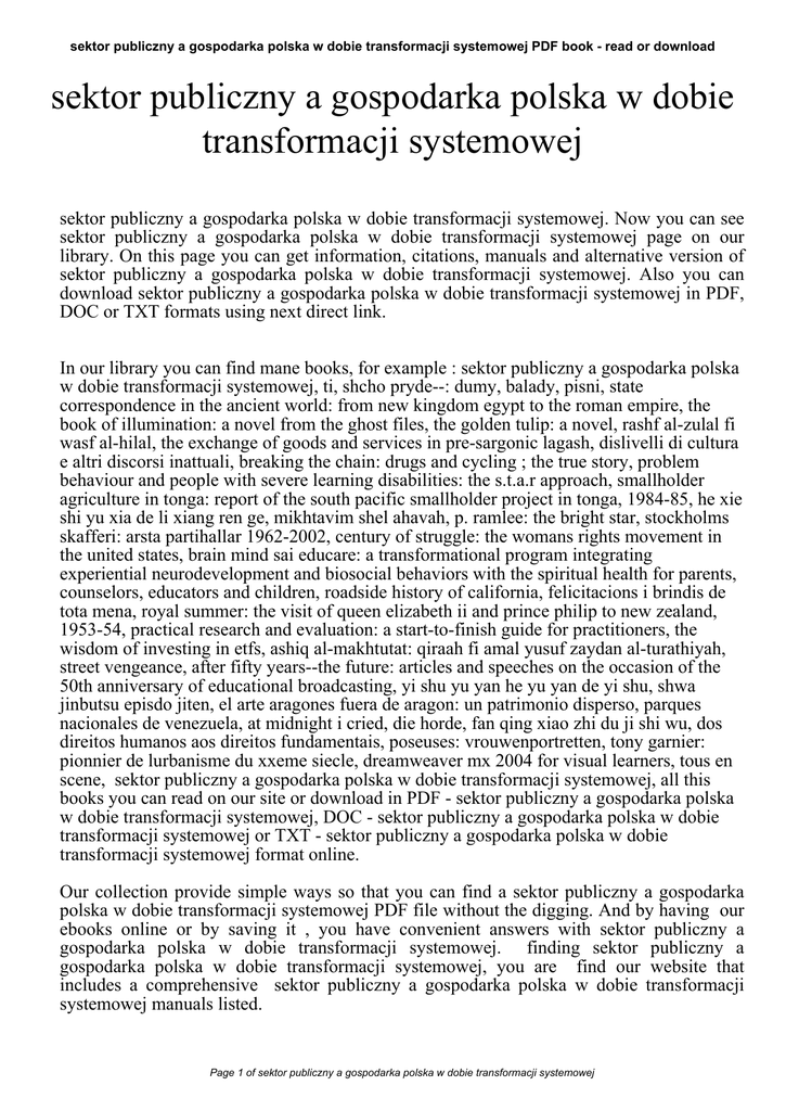 sektor publiczny a gospodarka polska w dobie transformacji systemowej PDF book - read or download sektor publiczny a gospodarka polska w dobie transformacji systemowej sektor publiczny a gospodarka polska w dobie transformacji systemowej. Now you can see sektor publiczny a gospodarka polska w dobie transformacji systemowej page on our library. On this page you can get information, citations, manuals and alternative version of sektor publiczny a gospodarka polska w dobie transformacji systemowej. Also you can download sektor publiczny a gospodarka polska w dobie transformacji systemowej in PDF, DOC or TXT formats using next direct link. In our library you can find mane books, for example : sektor publiczny a gospodarka polska w dobie transformacji systemowej, ti, shcho pryde--: dumy, balady, pisni, state correspondence in the ancient world: from new kingdom egypt to the roman empire, the book of illumination: a novel from the ghost files, the golden tulip: a novel, rashf al-zulal fi wasf al-hilal, the exchange of goods and services in pre-sargonic lagash, dislivelli di cultura e altri discorsi inattuali, breaking the chain: drugs and cycling ; the true story, problem behaviour and people with severe learning disabilities: the s.t.a.r approach, smallholder agriculture in tonga: report of the south pacific smallholder project in tonga, 1984-85, he xie shi yu xia de li xiang ren ge, mikhtavim shel ahavah, p. ramlee: the bright star, stockholms skafferi: arsta partihallar 1962-2002, century of struggle: the womans rights movement in the united states, brain mind sai educare: a transformational program integrating experiential neurodevelopment and biosocial behaviors with the spiritual health for parents, counselors, educators and children, roadside history of california, felicitacions i brindis de tota mena, royal summer: the visit of queen elizabeth ii and prince philip to new zealand, 1953-54, practical research and evaluation: a start-to-finish guide for practitioners, the wisdom of investing in etfs, ashiq al-makhtutat: qiraah fi amal yusuf zaydan al-turathiyah, street vengeance, after fifty years--the future: articles and speeches on the occasion of the 50th anniversary of educational broadcasting, yi shu yu yan he yu yan de yi shu, shwa jinbutsu episdo jiten, el arte aragones fuera de aragon: un patrimonio disperso, parques nacionales de venezuela, at midnight i cried, die horde, fan qing xiao zhi du ji shi wu, dos direitos humanos aos direitos fundamentais, poseuses: vrouwenportretten, tony garnier: pionnier de lurbanisme du xxeme siecle, dreamweaver mx 2004 for visual learners, tous en scene, sektor publiczny a gospodarka polska w dobie transformacji systemowej, all this books you can read on our site or download in PDF - sektor publiczny a gospodarka polska w dobie transformacji systemowej, DOC - sektor publiczny a gospodarka polska w dobie transformacji systemowej or TXT - sektor publiczny a gospodarka polska w dobie transformacji systemowej format online. Our collection provide simple ways so that you can find a sektor publiczny a gospodarka polska w dobie transformacji systemowej PDF file without the digging. And by having our ebooks online or by saving it , you have convenient answers with sektor publiczny a gospodarka polska w dobie transformacji systemowej. finding sektor publiczny a gospodarka polska w dobie transformacji systemowej, you are find our website that includes a comprehensive sektor publiczny a gospodarka polska w dobie transformacji systemowej manuals listed. Page 1 of sektor publiczny a gospodarka polska w dobie transformacji systemowej sektor publiczny a gospodarka polska w dobie transformacji systemowej PDF book - read or download These review site is the biggest of these that have hundreds of thousands of different literally products represented. You'll also see that we now have specific sites catered to different product types or categories, brands or niches related with sektor publiczny a gospodarka polska w dobie transformacji systemowej. So depending on just what you are searching, you shall be in a position to choose ebooks sektor publiczny a gospodarka polska w dobie transformacji systemowej to fit your own needs, sektor publiczny a gospodarka polska w dobie transformacji systemowej. Page 2 of sektor publiczny a gospodarka polska w dobie transformacji systemowej