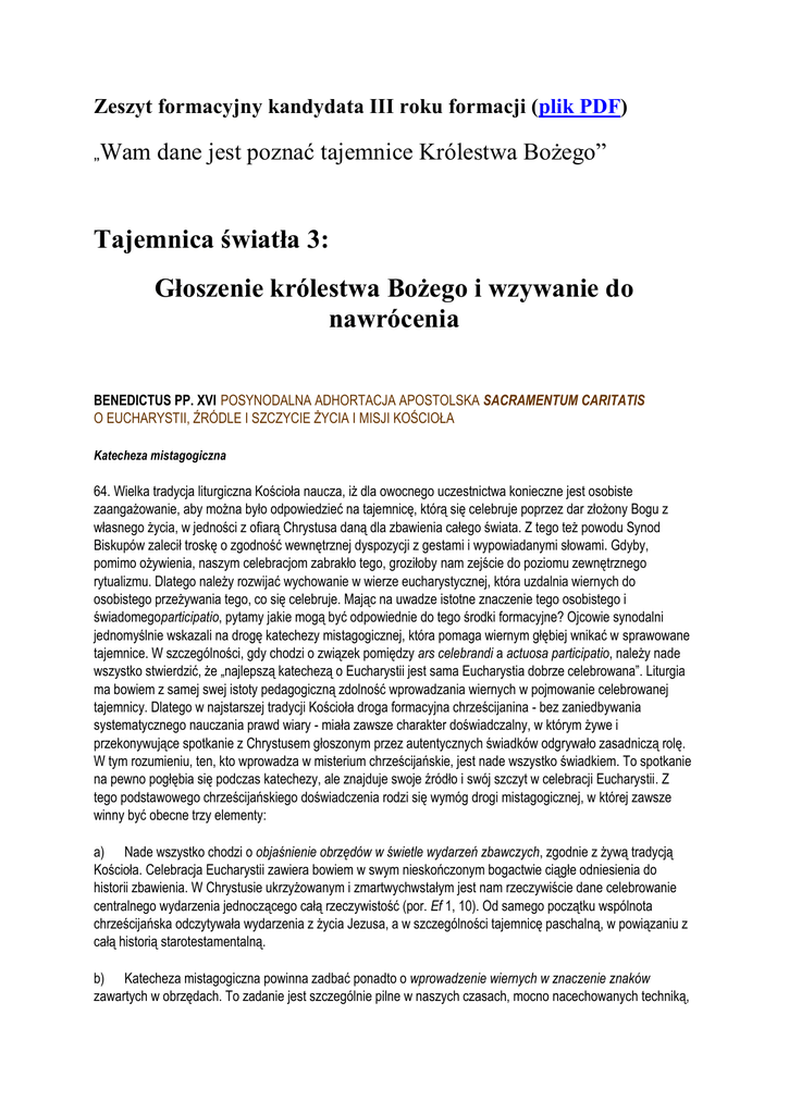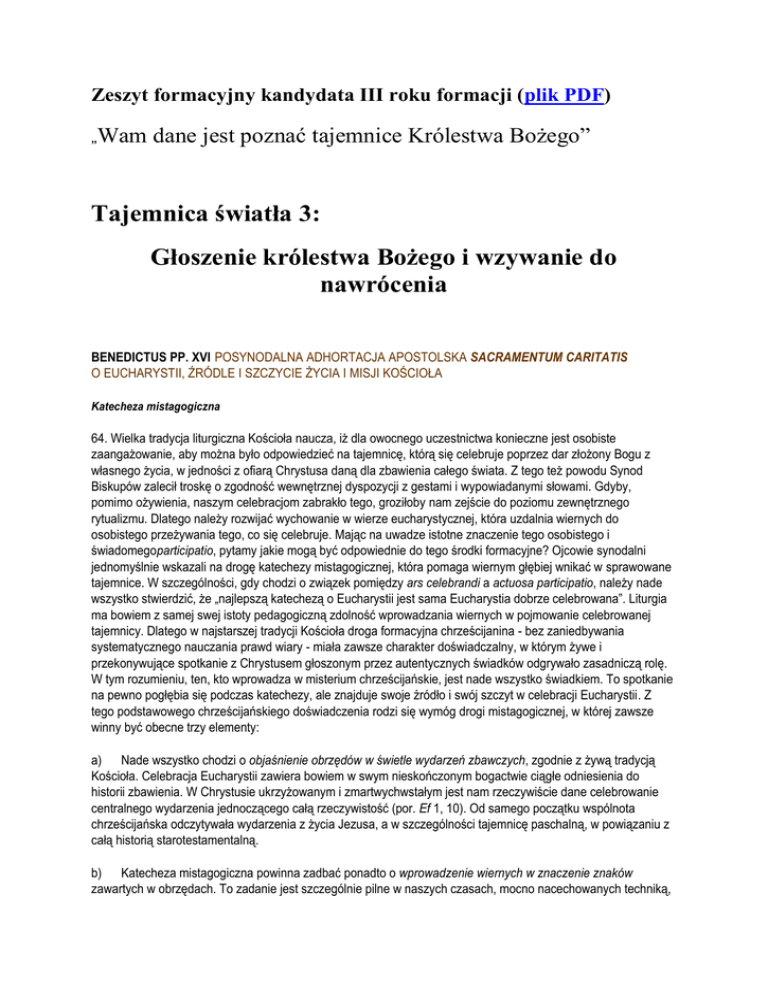 Zeszyt formacyjny kandydata III roku formacji (plik PDF) „ Wam dane jest poznać tajemnice Królestwa Bożego” Tajemnica światła 3: Głoszenie królestwa Bożego i wzywanie do nawrócenia BENEDICTUS PP. XVI POSYNODALNA ADHORTACJA APOSTOLSKA SACRAMENTUM CARITATIS O EUCHARYSTII, ŹRÓDLE I SZCZYCIE ŻYCIA I MISJI KOŚCIOŁA Katecheza mistagogiczna 64. Wielka tradycja liturgiczna Kościoła naucza, iż dla owocnego uczestnictwa konieczne jest osobiste zaangażowanie, aby można było odpowiedzieć na tajemnicę, którą się celebruje poprzez dar złożony Bogu z własnego życia, w jedności z ofiarą Chrystusa daną dla zbawienia całego świata. Z tego też powodu Synod Biskupów zalecił troskę o zgodność wewnętrznej dyspozycji z gestami i wypowiadanymi słowami. Gdyby, pomimo ożywienia, naszym celebracjom zabrakło tego, groziłoby nam zejście do poziomu zewnętrznego rytualizmu. Dlatego należy rozwijać wychowanie w wierze eucharystycznej, która uzdalnia wiernych do osobistego przeżywania tego, co się celebruje. Mając na uwadze istotne znaczenie tego osobistego i świadomegoparticipatio, pytamy jakie mogą być odpowiednie do tego środki formacyjne? Ojcowie synodalni jednomyślnie wskazali na drogę katechezy mistagogicznej, która pomaga wiernym głębiej wnikać w sprawowane tajemnice. W szczególności, gdy chodzi o związek pomiędzy ars celebrandi a actuosa participatio, należy nade wszystko stwierdzić, że „najlepszą katechezą o Eucharystii jest sama Eucharystia dobrze celebrowana”. Liturgia ma bowiem z samej swej istoty pedagogiczną zdolność wprowadzania wiernych w pojmowanie celebrowanej tajemnicy. Dlatego w najstarszej tradycji Kościoła droga formacyjna chrześcijanina - bez zaniedbywania systematycznego nauczania prawd wiary - miała zawsze charakter doświadczalny, w którym żywe i przekonywujące spotkanie z Chrystusem głoszonym przez autentycznych świadków odgrywało zasadniczą rolę. W tym rozumieniu, ten, kto wprowadza w misterium chrześcijańskie, jest nade wszystko świadkiem. To spotkanie na pewno pogłębia się podczas katechezy, ale znajduje swoje źródło i swój szczyt w celebracji Eucharystii. Z tego podstawowego chrześcijańskiego doświadczenia rodzi się wymóg drogi mistagogicznej, w której zawsze winny być obecne trzy elementy: a) Nade wszystko chodzi o objaśnienie obrzędów w świetle wydarzeń zbawczych, zgodnie z żywą tradycją Kościoła. Celebracja Eucharystii zawiera bowiem w swym nieskończonym bogactwie ciągłe odniesienia do historii zbawienia. W Chrystusie ukrzyżowanym i zmartwychwstałym jest nam rzeczywiście dane celebrowanie centralnego wydarzenia jednoczącego całą rzeczywistość (por. Ef 1, 10). Od samego początku wspólnota chrześcijańska odczytywała wydarzenia z życia Jezusa, a w szczególności tajemnicę paschalną, w powiązaniu z całą historią starotestamentalną. b) Katecheza mistagogiczna powinna zadbać ponadto o wprowadzenie wiernych w znaczenie znaków zawartych w obrzędach. To zadanie jest szczególnie pilne w naszych czasach, mocno nacechowanych techniką, w których grozi utrata zdolności rozumienia znaków i symboli. Zadaniem tej katechezy jest nie tyle informować, ile wzbudzić i wychować wrażliwość wiernych na język znaków i gestów, które w połączeniu ze słowem stanowią obrzęd. c) W końcu trzeba dołożyć starań, aby w katechezie mistagogicznej ukazać wiernym znaczenie obrzędów w powiązaniu z życiem chrześcijańskim we wszystkich jego wymiarach, pracy i zaangażowań, myśli i uczuć, aktywności i wypoczynku. Do tej części katechezy należy ponadto pouczenie o związku tajemnic celebrowanych w obrzędzie z odpowiedzialnością misyjną wiernych. W tym znaczeniu, dojrzałym skutkiem mistagogii jest świadomość, iż własna egzystencja jest stopniowo przemieniana przez celebrowane święte misteria. Celem zresztą wszelkiego chrześcijańskiego wychowania jest uformowanie wiernego jako „nowego człowieka” w dojrzałej wierze, uzdalniającej go do świadczenia we własnym środowisku o chrześcijańskiej nadziei, którą żywi. By móc spełnić takie zadanie wychowawcze wewnątrz naszych kościelnych wspólnot trzeba mieć osoby odpowiednio przygotowane. Na pewno cały Lud Boży powinien czuć się zobowiązany do sprostania tej formacji. Każda chrześcijańska wspólnota jest wezwana, by była miejscem pedagogicznego wprowadzania w tajemnice, które się celebruje w wierze. W związku z tym, Ojcowie synodalni wskazali na konieczność większego zaangażowania wspólnot życia konsekrowanego oraz ruchów i grup, które na mocy własnych charyzmatów mogą nadać nowy impuls chrześcijańskiej formacji. Również i w naszym czasie Duch Święty na pewno nie skąpi wylania swoich darów dla wspierania apostolskiej misji Kościoła, która zmierza do rozprzestrzenienia wiary oraz do rozwinięcia jej w nas, aż do jej dojrzałości. 1. Założenia trzeciego roku formacji kandydatów TEMATYKA FORMACJI WE WSPÓLNOCIE 1. Poznawanie charyzmatu Wspólnoty i celów: http://mamre.pl/Strona/charyzmat/charyzmatwspolnoty oraz http://mamre.pl/Strona/charyzmat/statut?showall=&start=1 2. Formacja biblijna – Wdrożenie w codzienną praktykę czytania Pisma św., głównie w oparciu o Ewangelię wg św. Łukasz i Dzieje Apostolskie. 3. Formacja liturgiczna – KKK 1066-1690 oraz wychowanie do właściwych postaw w liturgii w oparciu o Ogólne wprowadzenie do Mszału Rzymskiego (2002). Lektura uzupełniająca: Być chrześcijaninem. Teologia dla szkół średnich, pr. zbiorowa pod red. M.Ruseckiego, Lublin 2007 (KUL), 457-549. 4. Formacja ascetyczno-mistyczna (duchowa) – książka ks. Wł. Cyrana, „Módlcie się, abyście nie ulegli pokusie”, s. 70-137. 5. Formacja rodzinna – akcentujemy rolę liturgii Kościoła w kształtowaniu codziennego życia (od życia do liturgii, od liturgii do życia – zob. książkę ks. Wł.Cyran, „Mystagogia l