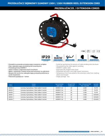 PRZEDŁUŻACZ BĘBNOWY GUMOWY 230V / 230V RUBBER REEL EXTENSION CORD PRZEDŁUŻACZE / EXTENSION CORDS - Prowadnica przewodu przyspieszająca nawijanie na bęben - Klips zabezpieczający przewód przed rozwinięciem - Przewód gumowy H05RR-F - Stelaż stalowy o ergonomicznych kształtach - Bęben z poliamidu o bardzo dużej wytrzymałości na uderzenia - Bezpiecznik termiczny zabezpieczający przewód przedłużacza przed stopieniem - Pakowanie pojedyncze - karton - Guide bar quickening the process of cable winding onto the drum - Clip protecting the cable against unrolling - H05RR-F rubber cable - Ergonomically shaped steel stand - Polyamide reel with a very high impact resistance - Temperature limit fuse protects the extension cable from melting when overcharged - Single package - box index nazwa article typ przewodu cable type długość [m] lenght [m] max. obciążenie [W] max. load [W] gniazda sockets 304118 Gumowy 4 gniazdowy / Reel rubber 4-socket H05RR-F 3x1 20 2.300 PL-FR 304125 Gumowy 4 gniazdowy / Reel rubber 4-socket H05RR-F 3x1 25 2.300 PL-FR 304156 Gumowy 4 gniazdowy / Reel rubber 4-socket H05RR-F 3x1 40 2.300 PL-FR 304101 Gumowy 4 gniazdowy / Reel rubber 4-socket H05RR-F 3x1 20 2.300 SCHUKO 304132 Gumowy 4 gniazdowy / Reel rubber 4-socket H05RR-F 3x1 25 2.300 SCHUKO 304149 Gumowy 4 gniazdowy / Reel rubber 4-socket H05RR-F 3x1 40 3.680 SCHUKO OŚWIETLENIE I ART. ELEKTROTECHNICZNE / LIGHTING AND ELECTROTECHNICS LENA LIGHTING 89
