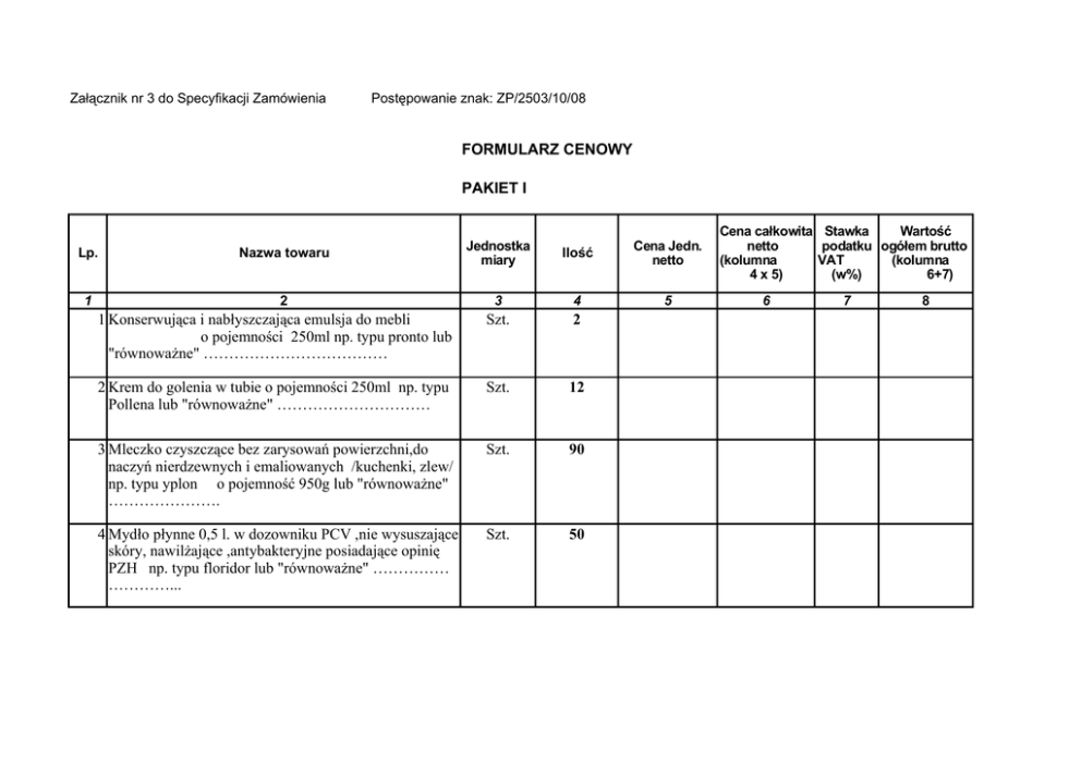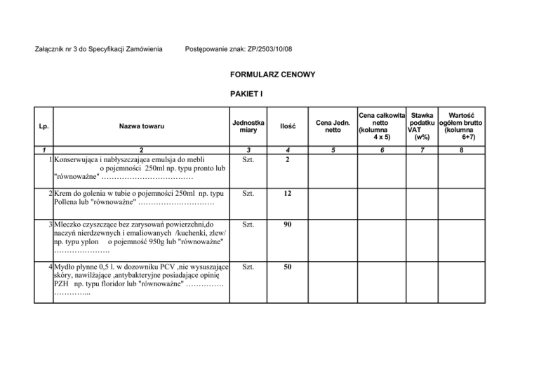 FORMULARZ CENOWY PAKIET I 1 Szt. 2 2 Szt. 12 3 Szt. 90 4 Szt