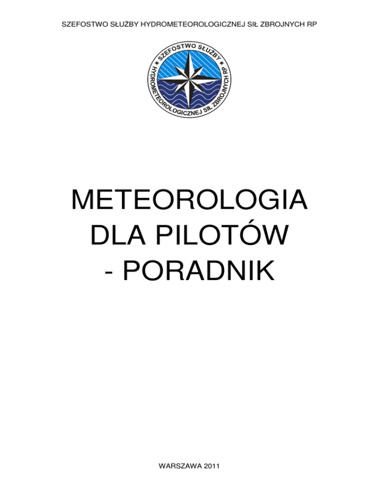 SZEFOSTWO SŁUŻBY HYDROMETEOROLOGICZNEJ SIŁ ZBROJNYCH RP METEOROLOGIA DLA PILOTÓW - PORADNIK WARSZAWA 2011 SZEFOSTWO SŁUŻBY HYDROMETEOROLOGICZNEJ SZ RP Spis treści 1. BUDOWA I SKŁAD ATMOSFERY. MASY POWIETRZA NAD EUROPĄ. .......... 4 1.2. BUDOWA ATMOSFERY. ................................................................................. 4 1.2. ATMOSFERA WZORCOWA (ISA – ICAO) ...................................................... 6 1.3. INWERSJE....................................................................................................... 8 1.4. MASY POWIETRZA NAD EUROPĄ .............................................................. 10 2. CIŚNIENIE ATMOSFERYCZNE, UKŁADY BARYCZNE I FRONTY ATMOSFERYCZNE.................................................................................................. 13 2.1. CIŚNIENIE ATMOSFERYCZNE. ............................................................. 13 2.1.1. JEDNOSKI CIŚNIENIA STOSOWANE W LOTNICTWIE...................... 14 2.2. UKŁADY BARYCZNE. ............................................................................. 15 2.3. MAPY TOPOGRAFII BARYCZNEJ, DIAGRAM AEROLOGICZNY. ......... 17 2.4. FRONTY ATMOSFERYCZNE ................................................................. 21 2.4.1. FRONTY CHŁODNE. ............................................................................ 22 3. CHMURY I ICH RODZAJE. ............................................................................... 32 4. WIATR. .............................................................................................................. 43 5. NIEBEZPIECZNE ZJAWISKA POGODY. ......................................................... 53 5.1. ZJAWISKA ZWIĄZANE Z BURZĄ (szkwał, uskok wiatru trąba powietrzna, tornado, grad). ...................................................................................................... 53 5.1.1. POWSTAWANIE CHMUR Cb I RODZAJE BURZ. ............................... 53 5.1.2. SZKWAŁ, USKOK WIATRU, DOWNBURST. ....................................... 58 5.1.3. TRĄBA POWIETRZNA, TORNADO. .................................................... 61 5.1.4. WYŁADOWANIA ATMOSFERYCZNE. ................................................. 65 5.2. MGŁA. ...................................................................................................... 69 5.2.1. MGŁA ADWEKCYJNA. ......................................................................... 69 5.2.2. MGŁA RADIACYJNA. ........................................................................... 71 5.2.3. MGŁA FRONTOWA. ............................................................................. 72 5.2.6. INNE ZJAWISKA OGRANICZAJĄCE WIDZIALNOŚĆ. ........................ 77 METEOROLOGIA DLA PILOTÓW - PORADNIK Strona 5.2.5. ZAMGLENIA ......................................................................................... 77 2 5.2.4. INNE RODZAJE MGIEŁ........................................................................ 73 SZEFOSTWO SŁUŻBY HYDROMETEOROLOGICZNEJ SZ RP 6. 5.3. OBLODZENIE. ......................................................................................... 78 5.4. TURBULENCJA ....................................................................................... 83 5.5. OPADY I WIDZIALNOŚĆ W OPADACH. ................................................. 88 LOTNICZE INFORMACJE METEOROLOGICZNE W STANDARDZIE ICAO. . 89 6.1. PROGNOZY OBSZAROWE GAMET ....................................................... 90 6.2. MAPY ISTOTNYCH ZJAWISK POGODY SIGWX (SIGNIFICANT) ......... 95 6.3. DEPESZE METAR I TAF. ...................................................................... 110 6.4. DEPESZE SIGMET ................................................................................ 113 6.5. DEPESZE AIRMET ................................................................................ 115 7. WOJSKOWA SŁUŻBA METEOROLOGICZNA. .............................................. 117 8. LITERATURA .................................................................................................. 125 Niniejsza praca chroniona jest przepisami prawa. Kopiowanie, rozpowszechnianie zarówno w całości jak i w jej części jest zabronione bez zgody autorów lub Szefa SSH SZ RP Strona 3 (Ustawa o prawie autorskim i prawach pokrewnych. z dnia 4 lutego 1994 r. Dz. U. 2000 r. Nr 80 poz. 904) METEOROLOGIA DLA PILOTÓW - PORADNIK SZEFOSTWO SŁUŻBY HYDROMETEOROLOGICZNEJ SZ RP 1. BUDOWA I SKŁAD ATMOSFERY. MASY POWIETRZA NAD EUROPĄ. Atmosfera ziemska jest powłoką gazową powstałą dzięki przyciąganiu ziemskiemu, które zatrzymuje ucieczkę gazów w przestrzeń kosmiczną. W związku z działaniem siły grawitacji zarówno skład jak i gęstość powietrza atmosferycznego jest różny na poszczególnych wysokościach nad poziomem morza. Wyróżnić można warstwy atmosfery, w których zmianom podlegają procesy fizyczne i chemiczne. 1.2. BUDOWA ATMOSFERY. W obecnym podziale (przyjętym przez Komisję Aerologiczną WMO1 w 1961 roku) atmosferą podzielono na 6 warstw nazwanych sferami. Pomiędzy poszczególnymi warstwami wydzielono warstwy przejściowe nazwane pauzami (tab. 1). TROPOSFERA Sfera (pauza) Tab. 1 Budowa atmosfery ziemskiej. Wysokość nad poziomem morza Podstawowe cechy i procesy. (km) Dolna Od 0 do ≈ 1 – 2 Średnia Od 1 ≈ 2 do ≈ 4-5 1 WMO – World Meteorological Organization, Światowa Organizacja Meteorologiczna z siedzibą w Genewie. 2 Gradient temperatury- różnica wartości temperatury na jednostkę odległości. METEOROLOGIA DLA PILOTÓW - PORADNIK Strona 4 Górna Od ≈ 4-5 do ≈617 (w strefie umiarkowanej ≈ 11) Warstwa najbardziej zależna od warunków lokalnych i podłoża, w której zachodzą procesy nagrzewania i ochładzania w cyklu dobowym (dzień/noc). Inaczej nazywana warstwą tarciową, którą dzielimy na: turbulencyjną (bliżej powierzchni Ziemi) i przejściową (pomiędzy turbulencyjną a atmosferą swobodną). W tej warstwie two