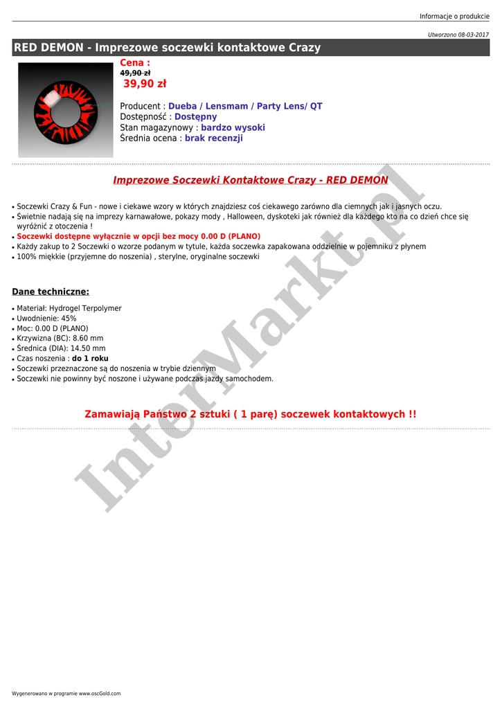 Informacje o produkcie Utworzono 08-03-2017 RED DEMON - Imprezowe soczewki kontaktowe Crazy Cena : 49,90 zł 39,90 zł Producent : Dueba / Lensmam / Party Lens/ QT Dostępność : Dostępny Stan magazynowy : bardzo wysoki Średnia ocena : brak recenzji ● ● ● ● Soczewki Crazy & Fun - nowe i ciekawe wzory w których znajdziesz coś ciekawego zarówno dla ciemnych jak i jasnych oczu. Świetnie nadają się na imprezy karnawałowe, pokazy mody , Halloween, dyskoteki jak również dla każdego kto na co dzień chce się wyróżnić z otoczenia ! Soczewki dostępne wyłącznie w opcji bez mocy 0.00 D (PLANO) Każdy zakup to 2 Soczewki o wzorze podanym w tytule, każda soczewka zapakowana oddzielnie w pojemniku z płynem 100% miękkie (przyjemne do noszenia) , sterylne, oryginalne soczewki ar kt ● .p l Imprezowe Soczewki Kontaktowe Crazy - RED DEMON Dane techniczne: ● ● ● ● ● ● te r ● Materiał: Hydrogel Terpolymer Uwodnienie: 45% Moc: 0.00 D (PLANO) Krzywizna (BC): 8.60 mm Średnica (DIA): 14.50 mm Czas noszenia : do 1 roku Soczewki przeznaczone są do noszenia w trybie dziennym Soczewki nie powinny być noszone i używane podczas jazdy samochodem. M ● In Zamawiają Państwo 2 sztuki ( 1 parę) soczewek kontaktowych !! Wygenerowano w programie www.oscGold.com