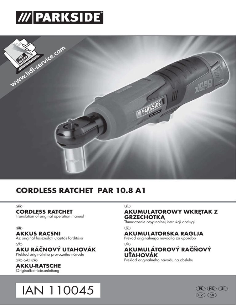 CORDLESS RATCHET PAR 10.8 A1 CORDLESS RATCHET Translation of original operation manual AKUMULATOROWY WKRĘTAK Z GRZECHOTKĄ Tłumaczenie oryginalnej instrukcji obsługi AKKUS RACSNI AKUMULATORSKA RAGLJA AKU RÁČNOVÝ UTAHOVÁK AKUMULÁTOROVÝ RAČŇOVÝ UŤAHOVÁK Az originál használati utasítás fordítása Překlad originálního provozního návodu Prevod originalnega navodila za uporabo Preklad originálneho návodu na obsluhu AKKU-RATSCHE Originalbetriebsanleitung IAN 110045 Before reading, unfold the page containing the illustrations and familiarise yourself with all functions of the device. Przed przeczytaniem proszę rozłożyć stronę z ilustracjami, a następnie proszę zapoznać się z wszystkimi funkcjami urządzenia. Olvasás előtt kattintson az ábrát tartalmazó oldalra és végezetül ismerje meg a készülék mindegyik funkcióját. Pred branjem odprite stran s slikami in se nato seznanite z vsemi funkcijami naprave. Před čtením si otevřete stranu s obrázky a potom se seznamte se všemi funkcemi přístroje. Pred čítaním si odklopte stranu s obrázkami a potom sa oboznámte so všetkými funkciami prístroja. Klappen Sie vor dem Lesen die Seite mit den Abbildungen aus und machen Sie sich anschließend mit allen Funktionen des Gerätes vertraut. GB PL HU SI CZ SK DE / AT / CH Translation of original operation manual Tłumaczenie oryginalnej instrukcji obsługi Az originál használati utasítás fordítása Prevod originalnega navodila za uporabo Překlad originálního provozního návodu Preklad originálneho návodu na obsluhu Originalbetriebsanleitung Page Strona Oldal Stran Strana Strana Seite 1 11 21 31 41 51 61 Contents GB Introduction . . . . . . . . . . . . . . . . . . . . . . . . . . . . . . . . . . . . . . . . . . . . . . . . . . . . . . 2 Intended use . . . . . . . . . . . . . . . . . . . . . . . . . . . . . . . . . . . . . . . . . . . . . . . . . . . . . . . . . . . . . . . . 2 Features . . . . . . . . . . . . . . . . . . . . . . . . . . . . . . . . . . . . . . . . . . . . . . . . . . . . . . . . . . . . . . . . . . . 2 Package contents . . . . . . . . . . . . . . . . . . . . . . . . . . . . . . . . . . . . . . . . . . . . . . . . . . . . . . . . . . . . 2 Technical data . . . . . . . . . . . . . . . . . . . . . . . . . . . . . . . . . . . . . . . . . . . . . . . . . . . . . . . . . . . . . . 2 General Power Tool Safety Warnings . . . . . . . . . . . . . . . . . . . . . . . . . . . . . . . . 3 1. Work area safety . . . . . . . . . . . . . . . . . . . . . . . . . . . . . . . . . . . . . . . . . . . . . . . . . . . . . . . . . . 3 2. Electrical safety . . . . . . . . . . . . . . . . . . . . . . . . . . . . . . . . . . . . . . . . . . . . . . . . . . . . . . . . . . . 3 3. Personal safety . . . . . . . . . . . . . . . . . . . . . . . . . . . . . . . . . . . . . . . . . . . . . . . . . . . . . . . . . . . . 4 4. Power tool use and care . . . . . . . . . . . . . . . . . . . . . . . . . . . . . . . . . . . . . . . . . . . . . . . . . . . . 4 5. Use and handling of the cordless electrical power tool . . . . . . . . . . . . . . . . . . . . . . . . . . . . . 5 6. Service . . . . . . . . . . . . . . . . . . . . . . . . . . . . . . . . . . . . . . . . . . . . . . . . . . . . . . . . . . . . . . . . . . 5 Safety guidelines for battery chargers . . . . . . . . . . . . . . . . . . . . . . . . . . . . . . . . . . . . . . . . . . . . 5 Appliance-specific safety guidelines for cordless ratchets . . . . . . . . . . . . . . . . . . . . . . . . . . . . . 6 Original accessories/auxiliary equipment . . . . . . . . . . . . . . . . . . . . . . . . . . . . . . . . . . . . . . . . . 6 Before first use . . . . . . . . . . . . . . . . . . . . . . . . . . . . . . . . . . . . . . . . . . . . . . . . . . . 6 Removing/charging/inserting the battery pack . . . . . . . . . . . . . . . . . . . . . . . . . . . . . . . . . . . . . 6 Checking the battery charge level . . . . . . . . . . . . . . . . . . . . . . . . . . . . . . . . . . . . . . . . . . . . . . . 7 Using the adapter sleeve . . . . . . . . . . . . . . . . . . . . . . . . . . . . . . . . . . . . . . . . . . . . . . . . . . . . . . 7 Initial use . . . . . . . . . . . . . . . . . . . . . . . . . . . . . . . . . . . . . . . . . . . . . . . . . . . . . . . . 7 Switching on and off . . . . . . . . . . . . . . . . . . . . . . . . . . . . . . . . . . . . . . . . . . . . . . . . . . . . . . . . . 7 Changing the direction of rotation . . . . . . . . . . . . . . . . . . . . . . . . . . . . . . . . . . . . . . . . . . . . . . . 7 Maintenance and cleaning. . . . . . . . . . . . . . . . . . . . . . . . . . . . . . . . . . . . . . . . . . 7 Warranty . . . . . . . . . . . . . . . . . . . . . . . . . . . . . . . . . . . . . . . . . . . . . . . . . . . . . . . . 8 Service . . . . . . . . . . . . . . . . . . . . . . . . . . . . . . . . . . . . . . . . . . . . . . . . . . . . . . . . . . 8 Importer . . . . . . . . . . . . . . . . . . . . . . . . . . . . . . . . . . . . . . . . . . . . . . . . . . . . . . . . 8 Disposal . . . . . . . . . . . . . . . . . . . . . . . . . . . . . . . . . . . . . . . . . . . . . . . . . . . . . . . . . 9 Translation of the original Conformity Declaration . . . . . . . . . . . . . . . . . . . . . . 9 PAR 10.8 A1 1 GB CORDLESS RATCHET PAR 10.8 A1 Introduction Congratulations on the purchase of your new appliance. You have selected a high quality product. The operating instructions are part of this product. They contain important information on safety, usage and disposal. Before using the product, familiarise yourself with all handling and safety instructions. Use the product only as described and for the range of applications specified. Hand over all documents to any future owner(s). Intended use The appliance is intended for tightening and loosening hexagonal bolts and nuts. Use this product only as described and for the areas of applications specified. The appliance is not meant for commercial use. Any other us