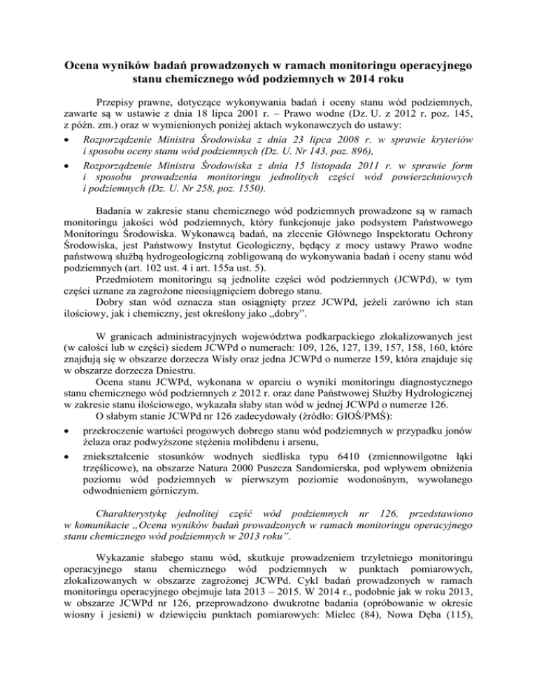 Ocena wyników badań prowadzonych w ramach monitoringu operacyjnego stanu chemicznego wód podziemnych w 2014 roku Przepisy prawne, dotyczące wykonywania badań i oceny stanu wód podziemnych, zawarte są w ustawie z dnia 18 lipca 2001 r. – Prawo wodne (Dz. U. z 2012 r. poz. 145, z późn. zm.) oraz w wymienionych poniżej aktach wykonawczych do ustawy: Rozporządzenie Ministra Środowiska z dnia 23 lipca 2008 r. w sprawie kryteriów i sposobu oceny stanu wód podziemnych (Dz. U. Nr 143, poz. 896), Rozporządzenie Ministra Środowiska z dnia 15 listopada 2011 r. w sprawie form i sposobu prowadzenia monitoringu jednolitych części wód powierzchniowych i podziemnych (Dz. U. Nr 258, poz. 1550). Badania w zakresie stanu chemicznego wód podziemnych prowadzone są w ramach monitoringu jakości wód podziemnych, który funkcjonuje jako podsystem Państwowego Monitoringu Środowiska. Wykonawcą badań, na zlecenie Głównego Inspektoratu Ochrony Środowiska, jest Państwowy Instytut Geologiczny, będący z mocy ustawy Prawo wodne państwową służbą hydrogeologiczną zobligowaną do wykonywania badań i oceny stanu wód podziemnych (art. 102 ust. 4 i art. 155a ust. 5). Przedmiotem monitoringu są jednolite części wód podziemnych (JCWPd), w tym części uznane za zagrożone nieosiągnięciem dobrego stanu. Dobry stan wód oznacza stan osiągnięty przez JCWPd, jeżeli zarówno ich stan ilościowy, jak i chemiczny, jest określony jako „dobry”. W granicach administracyjnych województwa podkarpackiego zlokalizowanych jest (w całości lub w części) siedem JCWPd o numerach: 109, 126, 127, 139, 157, 158, 160, które znajdują się w obszarze dorzecza Wisły oraz jedna JCWPd o numerze 159, która znajduje się w obszarze dorzecza Dniestru. Ocena stanu JCWPd, wykonana w oparciu o wyniki monitoringu diagnostycznego stanu chemicznego wód podziemnych z 2012 r. oraz dane Państwowej Służby Hydrologicznej w zakresie stanu ilościowego, wykazała słaby stan wód w jednej JCWPd o numerze 126. O słabym stanie JCWPd nr 126 zadecydowały (źródło: GIOŚ/PMŚ): przekroczenie wartości progowych dobrego stanu wód podziemnych w przypadku jonów żelaza oraz podwyższone stężenia molibdenu i arsenu, zniekształcenie stosunków wodnych siedliska typu 6410 (zmiennowilgotne łąki trzęślicowe), na obszarze Natura 2000 Puszcza Sandomierska, pod wpływem obniżenia poziomu wód podziemnych w pierwszym poziomie wodonośnym, wywołanego odwodnieniem górniczym. Charakterystykę jednolitej część wód podziemnych nr 126, przedstawiono w komunikacie „Ocena wyników badań prowadzonych w ramach monitoringu operacyjnego stanu chemicznego wód podziemnych w 2013 roku”. Wykazanie słabego stanu wód, skutkuje prowadzeniem trzyletniego monitoringu operacyjnego stanu chemicznego wód podziemnych w punktach pomiarowych, zlokalizowanych w obszarze zagrożonej JCWPd. Cykl badań prowadzonych w ramach monitoringu operacyjnego obejmuje lata 2013 – 2015. W 2014 r., podobnie jak w roku 2013, w obszarze JCWPd nr 126, przeprowadzono dwukrotne badania (opróbowanie w okresie wiosny i jesieni) w dziewięciu punktach pomiarowych: Mielec (84), Nowa Dęba (115), Kolbuszowa (139), Cmolas (1059), Turza (1219), Przyszów (1220), Stany (1221), Jeziórko (1526), Grębów (1527). Badania laboratoryjne próbek wody wykonało Centralne Laboratorium Chemiczne PIG-PIB. Analiza wód obejmowała następujące elementy fizykochemiczne: przewodność elektrolityczna w 20°C, odczyn pH, temperatura, tlen rozpuszczony, ogólny węgiel organiczny, amonowy jon, antymon, arsen, azotany, azotyny, bar, beryl, bor, chlorki, chrom, cyjanki wolne, cyna, cynk, fluorki, fosforany, glin, kadm, kobalt, magnez, mangan, miedź, molibden, nikiel, ołów, potas, rtęć, selen, siarczany, sód, srebro, tal, tytan, uran, wanad, wapń, wodorowęglany, żelazo, fenole (indeks fenolowy), a w pkt Mielec, Stany, Jeziórko, Grębów dodatkowe wskaźniki organiczne: pestycydy, trichloroeten, tetrachloroeten, wielopierścieniowe węglowodory aromatyczne (WWA). Na podstawie badań i pomiarów wykonanych w roku 2014, w punktach monitoringu operacyjnego, w obszarze JCWPd o numerze 126, dokonano klasyfikacji wód, która przedstawia się następująco: wody podziemne odpowiadające I klasie jakości (dobry stan wód) – 1 pkt (Stany), wody podziemne odpowiadające II klasie jakości (dobry stan wód) – 1 pkt (Przyszów), wody podziemne odpowiadające III klasie jakości (dobry stan wód) – 3 pkt (Nowa Dęba, Cmolas, Turza), wody podziemne odpowiadające IV klasie jakości (słaby stan wód) – 3 pkt (Mielec, Kolbuszowa, Grębów), wody podziemne odpowiadające V klasie jakości (słaby stan wód) – 1 pkt (Jeziórko). W punktach pomiarowych, w których przeprowadzono badania dodatkowych wskaźników organicznych jakość wody odpowiada I klasie. W porównaniu do wyników badań z 2013 r. klasyfikacja wód podziemnych poprawiła się w pkt Stany (z klasy III na I), w pkt Przyszów (z klasy III na II), w pkt Cmolas (z klasy IV na III). W pozostałych punktach klasyfikacja wód nie uległa zmianie. Podstawę oceny jakości wód podziemnych stanowiło rozporządzenie Ministra Środowiska z dnia 23 lipca 2008 r. w sprawie kryteriów i sposobu oceny stanu wód podziemnych, które wyróżnia pięć klas jakości wód: klasa I – wody bardzo dobrej jakości, klasa II – wody dobrej jakości, klasa III – wody zadowalającej jakości, klasa IV – wody niezadowalającej jakości, klasa V – wody złej jakości, oraz dwa stany chemiczne wód: stan dobry (klasy I, II i III), stan słaby (klasy IV i V). Zgodnie z cytowanym rozporządzeniem, wartościami progowymi elementów fizykochemicznych dla dobrego stanu chemicznego są wartości graniczne elementów fizykochemicznych, określone dla III klasy jakości wód podziemnych. Realizując obowiązek udostępniania informacji o środowisku, zgodnie z rozporządzeniem Ministra Środowiska z dnia 23 listopa