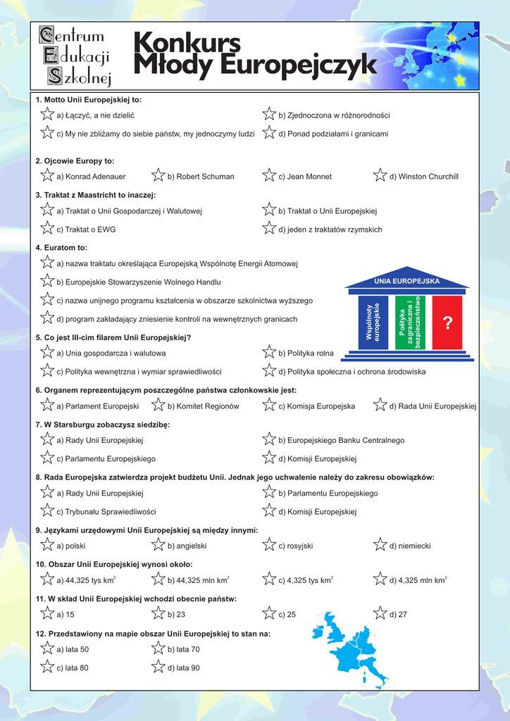 entrum dukacji zkolnej 1. Motto Unii Europejskiej to: a) £¹czyæ, a nie dzieliæ b) Zjednoczona w ró¿norodnoœci c) My nie zbli¿amy do siebie pañstw, my jednoczymy ludzi d) Ponad podzia³ami i granicami 2. Ojcowie Europy to: a) Konrad Adenauer b) Robert Schuman c) Jean Monnet d) Winston Churchill 3. Traktat z Maastricht to inaczej: a) Traktat o Unii Gospodarczej i Walutowej b) Traktat o Unii Europejskiej c) Traktat o EWG d) jeden z traktatów rzymskich 4. Euratom to: a) nazwa traktatu okreœlaj¹ca Europejsk¹ Wspólnotê Energii Atomowej d) program zak³adaj¹cy zniesienie kontroli na wewnêtrznych granicach 5. Co jest III-cim filarem Unii Europejskiej? Polityka zagraniczna i bezpieczeñstwo c) nazwa unijnego programu kszta³cenia w obszarze szkolnictwa wy¿szego Wspólnoty europejskie UNIA EUROPEJSKA b) Europejskie Stowarzyszenie Wolnego Handlu a) Unia gospodarcza i walutowa b) Polityka rolna c) Polityka wewnêtrzna i wymiar sprawiedliwoœci d) Polityka spo³eczna i ochrona œrodowiska ? 6. Organem reprezentuj¹cym poszczególne pañstwa cz³onkowskie jest: a) Parlament Europejski b) Komitet Regionów c) Komisja Europejska d) Rada Unii Europejskiej 7. W Starsburgu zobaczysz siedzibê: a) Rady Unii Europejskiej b) Europejskiego Banku Centralnego c) Parlamentu Europejskiego d) Komisji Europejskiej 8. Rada Europejska zatwierdza projekt bud¿etu Unii. Jednak jego uchwalenie nale¿y do zakresu obowi¹zków: a) Rady Unii Europejskiej b) Parlamentu Europejskiego c) Trybuna³u Sprawiedliwoœci d) Komisji Europejskiej 9. Jêzykami urzêdowymi Unii Europejskiej s¹ miêdzy innymi: a) polski b) angielski c) rosyjski d) niemiecki c) 4,325 tys km2 d) 4,325 mln km2 c) 25 d) 27 10. Obszar Unii Europejskiej wynosi oko³o: a) 44,325 tys km2 b) 44,325 mln km2 11. W sk³ad Unii Europejskiej wchodzi obecnie pañstw: a) 15 b) 23 12. Przedstawiony na mapie obszar Unii Europejskiej to stan na: a) lata 50 b) lata 70 c) lata 80 d) lata 90 13. Przed przyst¹pieniem Polski do Unii Europejskiej, Unia sk³ada³a siê z: a) 6 pañstw b) 11 pañstw c) 15 pañstw d) 25 pañstw 14. Idea „czterech swobód” okreœla swobodê przep³ywu osób, towarów oraz: b) kapita³u a) dóbr kulturowych c) zwierz¹t d) us³ug 15. Które z poni¿ej przedstawionych pañstw nale¿¹ do Unii Europejskiej? Ankara b) a) c) Warsaw Bucharest d) Stockholm 16. ZnajdŸ podpunkt, w którym poprawnie przyporz¹dkowano flagi do pañstw cz³onkowskich. a) b) Hiszpania Austria £otwa c) Hiszpania Austria £otwa Hiszpania Austria £otwa d) Hiszpania Austria £otwa 17. Polska rozpoczê³a oficjalne negocjacje w sprawie przyst¹pienia do Unii Europejskiej w roku: a) 1988 b) 1998 c) 2000 d) 2004 c) epsilon d) ypsilon c) d) c) 2 monety euro d) 7 banknotów 18. Znakiem graficznym waluty euro jest grecka litera: a) alfa b) beta 19. Jak wygl¹daj¹ awersy monet od 1 do 5 eurocentów? a) b) 20. W walucie europejskiej wyró¿niamy: a) 8 monet b) 6 monet eurocentowych 21. Moneta 50 eurocentów o przedstawionym na rysunku rewersie zosta³a wyemitowana w: a) Finlandii b) Holandii c) Niemczech d) Austrii 22. Jak¹ walut¹ ma zap³aciæ turysta za zakupy dokonane w sklepie w Szwecji? a) euro b) korony szwedzkie c) funty szterlingi d) forinty 23. Flaga Unii Europejskiej: a) przedstawia 13 z³otych gwiazd tworz¹cych kr¹g b) przedstawia 12 piêcioramiennych gwiazd ustawionych tak jak godziny na tarczy zegara c) przedstawia na tle niebieskiego nieba dwanaœcie z³otych piêcioramiennych gwiazdek tworz¹cych kr¹g d) pozostaje jednakowa bez wzglêdu na poszerzanie siê Unii Europejskiej 24. Paszporty obowi¹zuj¹ce w pañstwach cz³onkowskich maj¹ ok³adki w kolorze: a) bordowym z napisem Unia Europejska poni¿ej nazwy pañstwa wydaj¹cego dokument b) wina burgundzkiego z napisem Unia Europejska powy¿ej nazwy pañstwa wydaj¹cego dokument c) granatowym z napisem Unia Europejska obok nazwy pañstwa wydaj¹cego dokument d) ciemnoczerwonym z napisem Unia Europejska obok nazwy pañstwa wydaj¹cego dokument 25. Nazwê maskotce Unii Europejskiej u¿yczy³a najjaœniejsza gwiazda na niebie. Jak wiêc nazywa siê ta maskotka? a) Procjon b) Syriusz c) Epsilon Indi d) Tau Ceti c) euroekonomista d) eurosceptyk 26. Osoba o pozytywnym podejœciu do Unii Europejskiej to: a) euroentuzjasta b) eurobiurokrata