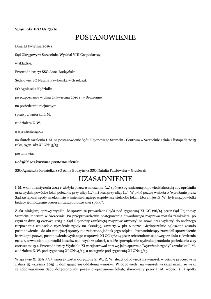 Sygn. akt VIII Gz 73/16 POSTANOWIENIE Dnia 25 kwietnia 2016 r. Sąd Okręgowy w Szczecinie, Wydział VIII Gospodarczy w składzie: Przewodniczący: SSO Anna Budzyńska Sędziowie: SO Natalia Pawłowska – Grzelczak SO Agnieszka Kądziołka po rozpoznaniu w dniu 25 kwietnia 2016 r. w Szczecinie na posiedzeniu niejawnym sprawy z wniosku I. M. z udziałem Z. W. o wyrażenie zgody na skutek zażalenia I. M. na postanowienie Sądu Rejonowego Szczecin - Centrum w Szczecinie z dnia 2 listopada 2015 roku, sygn. akt XI GNs 5/15 postanawia: uchylić zaskarżone postanowienie. SSO Agnieszka Kądziołka SSO Anna Budzyńska SSO Natalia Pawłowska – Grzelczak UZASADNIENIE I. M. w dniu 14 stycznia 2014 r. złożyła pozew o nakazanie (...) spółce z ograniczoną odpowiedzialnością aby opróżniła oraz wydała powódce lokal położony przy ulicy (...)(...) oraz przy ulicy (...). W pkt 6 pozwu wniosła o "wyrażanie przez Sąd zastępczej zgody na eksmisję w imieniu drugiego współwłaściciela obu lokali, którym jest Z. W., były mąż powódki będący jednocześnie prezesem zarządu pozwanej spółki". Z akt niniejszej sprawy wynika, że sprawa ta prowadzona była pod sygnaturą XI GC 176/14 przez Sąd Rejonowy Szczecin-Centrum w Szczecinie. Po przeprowadzeniu postępowania dowodowego rozprawa została zamknięta, po czym w dniu 15 czerwca 2015 r. Sąd Rejonowy zamkniętą rozprawę otworzył na nowo oraz wyłączył do osobnego rozpoznania wniosek o wyrażenie zgody na eksmisję, zawarty w pkt 6 pozwu. Jednocześnie ogłoszone zostało postanowienie - do akt niniejszej sprawy nie załączono jednak jego odpisu. Przewodniczący zarządził sporządzenie kserokopii pozwu, postanowienia wydanego w sprawie XI GC 176/14 przez referendarza sądowego w dniu 11 kwietnia 2014 r. o zwolnieniu powódki kosztów sądowych w całości, a także sporządzenie wydruku protokołu posiedzenia z 15 czerwca 2015 r. Przewodniczący Wydziału XI zarejestrował sprawę jako sprawę o "wyrażenie zgody" z wniosku I. M. z udziałem Z. W. pod sygnaturą XI GNs 4/15, a następnie pod sygnaturą XI GNs 5/15. W sprawie XI GNs 5/15 wniosek został doręczony Z. W.. Z. W. złożył odpowiedź na wniosek w piśmie procesowym z dnia 15 września 2015 r. domagając się oddalenia wniosku. W odpowiedzi na wniosek wskazał m.in., że wraz ze zobowiązaniem Sądu doręczono mu pozew o opróżnienie lokali, skierowany przez I. M. wobec (...) spółki z ograniczoną odpowiedzialnością w S.. Zdaniem uczestnika niezrozumiałe jest, dlaczego powództwo skierowane przeciwko osobie prawnej, jaką jest spółka (...), doprowadziło do wszczęcia postępowania, w którym wskazywany jest on jako strona. Niezrozumiały dla Z. W. jest również sam wniosek zawarty w pkt 6 pozwu, do którego miałby się ustosunkować. Z wniosku tego nie wynika na co dokładnie miałby zgodzić się Z. W., na czym miałaby polegać zastępcza zgoda na eksmisję, jaką miałby wydać Sąd. Z. W. dostrzegł, że w zarządzeniu wydanym w sprawie XI GC 176/14 (którego kserokopie załączono do akt niniejszej sprawy) wskazane zostało, że z pozwu wydzielony zostanie "wniosek o wyrażenie zgody na złożenie pozwu w imieniu drugiego współwłaściciela obu lokali jakim jest Z. W.". Zdaniem Z. W. treść wniosku z pkt 6 pozwu nie pozwala jednak na taką interpretację żądania I. M., w aktach sprawy brak jest przy tym jakichkolwiek informacji, aby I. M. precyzowała swój wniosek w sposób przyjęty przez Sąd. Dalej wskazał, że pozwana w sprawie XI GC 176/14 spółka (...) do chwili obecnej dysponuje tytułem prawnym do lokali umową najmu, dlatego brak jest podstaw do uwzględnienia pozwu o eksmisję Po złożeniu odpowiedzi na wniosek Przewodniczący w sprawie XI Gns 5/15 ustalił na jakim etapie jest postępowanie o podział majątku, prowadzone z udziałem stron niniejszego postępowania przez Sąd Rejonowy Szczecin-Centrum w Szczecinie Wydział II Cywilny pod sygnaturą Ns 1580/10. Z ustaleń, jakie telefonicznie uzyskał sekretarz sądowy wynika, że w sprawie Ns 1580/10 wyznaczono posiedzenie na dzień 17 grudnia 2015 r. Następnie Sąd Rejonowy postanowieniem z dnia 2 listopada 2015 r. zawiesił postępowanie w sprawie XI Gns 5/15 na podstawie art. 177 § 1 pkt 1 k.p.c. W uzasadnieniu wskazał, że I. M. złożyła wniosek o wyrażenie zgody przez sąd na złożenie pozwu o eksmisję w imieniu drugiego współwłaściciela Z. W.. Podstawą prawną żądania jest art. 199 k.c. Dalej Sąd Rejonowy wskazał, że między I. M. i Z. W. toczy się postępowanie o podział majątku pod sygnaturą II Ns 1580/10. Następnie powołał się na prezentowany w orzecznictwie pogląd (uchwała S.N. z 24 września 1981 r., II CZP 29/81), zgodnie z którym w przypadku jednoczesnego toczenia się postępowania wszczętego na podstawie art. 199 k.c. oraz postępowania o zniesienie współwłasności postępowanie o wydanie zezwolenia podlega zawieszeniu do czasu prawomocnego zakończenia postępowania o zniesienie współwłasności. Tak argumentując postępowanie zawiesił na podstawie art. 177 § 1 pkt 1 k.p.c. w zw. z art. 13 § 2 k.p.c. Zażalenie na powyższe postanowienie złożyła I. M. domagając się uchylenia zaskarżonego postanowienia. Zarzuciła Sądowi pierwszej instancji błędną interpretację wniosku nr 6 z pozwu z dnia 8 stycznia 2014 r. Wskazała również, że Sąd błędnie zastosował uchwałę Sądu Najwyższego z 24 września 1981 r., powołała się również na poniesioną szkodę związaną z tym, że postępowanie niniejsze toczy się w wyniku błędu Sądu rozpoznającego pozew o eksmisję. Odnosząc się do błędnej interpretacji wniosku nr 6 z pozwu, dokonanej zdaniem skarżącej przez Sąd Rejonowy, I. M. wskazała, że nie domagała się wyrażenia sądowej "zgody na złożenie pozwu o eksmisję", jak to wskazano w uzasadnieniu zaskarżonego postanowienia, domagała się natomiast wyrażenia przez Sąd "zgody na eksmisję" prz