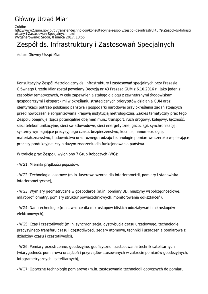 Główny Urząd Miar Źródło: http://www2.gum.gov.pl/pl/transfer-technologii/konsultacyjne-zespoly/zespol-ds-infrastruktur/9,Zespol-ds-Infrastr uktury-i-Zastosowan-Specjalnych.html Wygenerowano: Środa, 8 marca 2017, 18:55 Zespół ds. Infrastruktury i Zastosowań Specjalnych Autor: Główny Urząd Miar Konsultacyjny Zespół Metrologiczny ds. infrastruktury i zastosowań specjalnych przy Prezesie Głównego Urzędu Miar został powołany Decyzją nr 43 Prezesa GUM z 6.10.2016 r., jako jeden z zespołów tematycznych, w celu zapewnienia stałego dialogu z zewnętrznymi środowiskami gospodarczymi i eksperckimi w określaniu strategicznych priorytetów działania GUM oraz identyfikacji potrzeb polskiego państwa i gospodarki narodowej oray określenia zadań stojących przed nowocześnie zorganizowaną krajową instytucją metrologiczną. Zakres tematyczny prac tego Zespołu obejmuje (bądź potencjalnie obejmie) m.in.: transport, ruch drogowy, kolejowy, łączność, sieci telekomunikacyjne, sieci światłowodowe, sieci energetyczne, gazociągi, synchronizację, systemy wymagające precyzyjnego czasu, bezpieczeństwo, kosmos, nanometrologię, materiałoznawstwo, budownictwo oraz różnego rodzaju technologie pomiarowe szeroko wspierające procesy produkcyjne, czy o dużym znaczeniu dla funkcjonowania państwa. W trakcie prac Zespołu wyłoniono 7 Grup Roboczych (WG): - WG1: Mierniki prędkości pojazdów, - WG2: Technologie laserowe (m.in. laserowe wzorce dla interferometrii, pomiary i stanowiska interferometryczne), - WG3: Wymiary geometryczne w gospodarce (m.in. pomiary 3D, maszyny współrzędnościowe, mikroprofilometry, pomiary struktur powierzchniowych, monitorowanie odkształceń), - WG4: Nanotechnologie (m.in. wzorce dla mikroskopów bliskich oddziaływań i mikroskopów elektronowych), - WG5: Czas i częstotliwość (m.in. synchronizacja, dystrybucja czasu urzędowego, technologie precyzyjnego transferu czasu i częstotliwości, zegary atomowe, techniki i urządzenia pomiarowe z dziedziny czasu i częstotliwości), - WG6: Pomiary przestrzenne, geodezyjne, geofizyczne i zastosowania technik satelitarnych (wiarygodność pomiarowa urządzeń i przyrządów stosowanych w zakresie pomiarów geodezyjnych, fotogrametrycznych i satelitarnych), - WG7: Optyczne technologie pomiarowe (m.in. zastosowania technologii optycznych do pomiaru temperatury, ciśnienia, wilgotności, pól elektromagnetycznych). Kontakt do Zespołu: [email protected] sekretarz Zespołu – Zbigniew Ramotowski, tel. 22 581 95 43, z-ca sekretarza Zespołu – Albin Czubla, tel. 22 581 91 56.