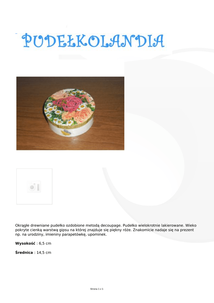 Okrągłe drewniane pudełko ozdobione metodą decoupage. Pudełko wielokrotnie lakierowane. Wieko pokryte cienką warstwą gipsu na której znajduje się piękny róże. Znakomicie nadaje się na prezent np. na urodziny, imieniny parapetówkę, upominek. Wysokość : 6,5 cm Średnica : 14,5 cm Strona 1 z 1