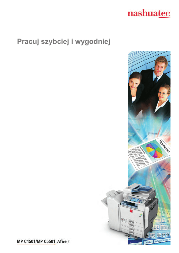 Pracuj szybciej i wygodniej Zwiększ wydajność Urządzenia MP C4501/MP C5501 zostały zaprojektowane, aby poprawić wydajność Twojego środowiska biurowego. Jednoprzebiegowe skanowanie dwustronne, duża prędkość drukowania w kolorze, odpowiednio 45/55 stron na minutę i krótki czas nagrzewania urządzenia to cechy, które w znacznym stopniu poprawiają obieg Twoich dokumentów. Dzięki opcjonalnemu podajnikowi kopert oraz możliwości drukowania z pamięci USB i kart SD znacząco wzrasta wydajność pracy. Najlepsze parametry ekologiczne o najniższym w klasie zużyciu energii zmniejszają wpływ na środowisko naturalne. Zaawansowane funkcje zabezpieczeń zapewniają, że te niezawodne wielofunkcyjne drukarki są zaufanym partnerem w Twoim biurze. Bezpieczeństwo dzięki nadpisywaniu danych dysku twardego i funkcjom szyfrowania. Drukowanie z pamięci USB lub kart SD (opcjonalnie). Optymalizacja zarządzania kosztami - limity wydruków. Drukowanie/kopiowanie w kolorze 45/55 stron na minutę. Skanowanie z dużą prędkością dzięki jednoprzebiegowemu skanowaniu dwustronnemu (MP C4501SPDF/MP C5501SPDF). W pełni niezawodne i funkcjonalne OPTYMALNA WYDAJNOŚĆ Wybierz MP C4501/MP C5501, urządzenie o wysokiej wydajności i efektywności. Urządzenie rozgrzewa się tylko w 22/36 sekund i drukuje w kolorze 45/55 stron na minutę. Czas nagrzewania modeli z jednoprzebiegowym skanowaniem dwustronnym to 24/38 sekund. Powrót z trybu uśpienia jest równie szybki: zaledwie 20/32 sekund i 20/34 modeli SPDF. Duże ilości dokumentów nie są problemem, kasety mogą pomieścić do 4400 arkuszy. Możesz również oszczędzić czas dzięki opcjonalnej możliwość drukowania bezpośrednio z pamięci USB lub kart SD (obsługiwane formaty plików: PDF, JPEG i TIFF). DRUKOWANIE W DUPLEKSIE Jednostronne skanowanie jest szybkie bo wynosi aż 67 stron na minutę. Skanowanie dwustronne (MP C4501SPDF i MP C5501SPDF) jest jeszcze szybsze, do 116 stron na minutę dzięki jednoprzebiegowemu skanowaniu dwustronnemu; przód i tył są skanowane jednocześnie. Jeśli używasz drukowania dwustronnego sporadycznie, możesz oszczędzić czas używając tacy ręcznej. USTAW LIMIT WYDRUKÓW Oszczędzaj pieniądze i ograniczaj negatywny wpływ na środowisko naturalne. Ustawiaj i zarządzaj limitami wydruków dla każdego użytkownika indywidualnie lub grupowo. Otrzymasz dzięki temu podgląd wykorzystania maszyny w Twoim biurze, co może przełożyć się na oszczędności eksploatacji. SZEROKA UNIWERSALNOŚĆ NOŚNIKÓW Drukowanie dokumentów na papierze grubym o gramaturze do 300 g/m to nie problem z MP C4501/MP C5501. Są idealne do szybkiego drukowania na grubych mediach, takich jak ulotki, korespondencja czy materiały do punktów sprzedaży. Drukowanie na kopertach jest bardzo proste, po prostu wykorzystaj kasetę wewnętrzną na koperty. BEZPIECZEŃSTWO JEST PRIORYTETEM Urządzenia MP C4501/MP C5501 korzystają z najwyższych aktualnie dostępnych poziomów bezpieczeństwa i gwarantują, że nie musisz się martwić o wrażliwe dane. Standardowe szyfrowanie dysku twardego koduje dane, które są przechowywane w urządzeniach. Dzięki zabezpieczeniom nadpisywania danych wszystkie tymczasowe dane na dysku twardym mogą być nadpisane. Kolejną funkcją zabezpieczeń jest skanowane do Web mail`a (SMTP z szyfrowaniem SSL), które doskonale chronią zeskanowane informacje. PROSTY W UŻYCIU Urządzenia MP C4501/MP C5501 dostarczane są z platformą App2Me firmy Nashuatec. Ta innowacyjna platforma technologiczna pozwala na uruchamianie małych programów Nashuatec Widgets, umożliwiając mobilnym użytkownikom personalizację sposobu pracy z MFP. Te jednozadaniowe aplikacje są automatycznie wykrywane przez urządzenie wyposażone w App2Me, które zostały zainstalowane na połączonym komputerze lub laptopie. Po wykryciu użytkownika widgety będą wyświetlane bezpośrednio na wyświetlaczu urządzenia, zapewniając szybki dostęp do najnowszych narzędzi i aplikacji. PRZYJAZNY DLA ŚRODOWISKA Firma Nashuatec pomaga obniżyć negatywne oddziaływanie na środowisko w Twoim biurze, jak również obniżyć koszty. Urządzenia MP C4501/MP C5501 mają przyjazne dla środowiska i zmniejszające koszty funkcje, takie jak druk dwustronny, bardzo niski pobór mocy w trybie uśpienia, zwiększoną wydajność tonera i niskie TEC (średnie zużycie energii). Urządzenia mogą być również ustawione w tryb Eco Mode - ustawienie, które znacząco pozwala zmniejszyć zużycie energii. Aby urządzenia rozgrzewały się jeszcze szybciej, firma Ricoh udoskonaliła proces utrwalania wprowadzając bezpośrednie nagrzewanie rolki. Ponadto produkty Ricoh są zgodne z wymogami Energy Star. Oznacza to, że emitowana jest mniejsza ilość CO2 , która powstaje podczas produkcji energii potrzebnej do zasilania urządzeń Nashuatec. KOPIARKA Proces kopiowania: Prędkość kopiowania: SKANER Laserowa wiązka skanująca, drukowanie Prędkość skanowania: Maksymalnie 67 oryginałów na minutę (LEF, A4, elektro-fotograficzne 200/300 dpi) (z ARDF) Pełnokolorowe: 45/55 kopii na minutę Maksymalnie 85/116 oryginałów na minutę (LEF, Czarno-białe: 45/55 kopii na minutę A4, 200/300 dpi) (z SPDF, jednostronne/ Rozdzielczość: 600 dpi Kopiowanie wielokrotne: Do 999 Rozdzielczość: Maksymalnie 1,200 dpi (tylko skan TWAIN) Czas nagrzewania: 22/36 sekund (24/38 sekund dla SDPF) Rozmiar oryginału: A5 - A3 Formaty wyjściowe: PDF/JPEG/TIFF/Wysoka kompresja PDF Czarno-białe: 3.7/3.1 sekund Sterowniki standardowe: Sieciowy TWAIN Zoom: 25 - 400% (w 1% krokach) Skanowanie do e-mail: SMTP, POP3 Pamięć: 2 GB (standardowo) Adresy odbiorców: Maksymalnie 500 na zadanie Dysk twardy: 160 GB (standardowo) Zapisane adresy odbiorców: Maksymalnie 2,000 Pojemność wejściowa papieru: Standardowo: 2 x 550-arkuszowe kasety na Książka adresowa: Przez LDAP lub lokalnie na dysku twardym papier Skanowanie do folderu: SMB, FTP, NCP 1 x 100-arkuszowa ta
