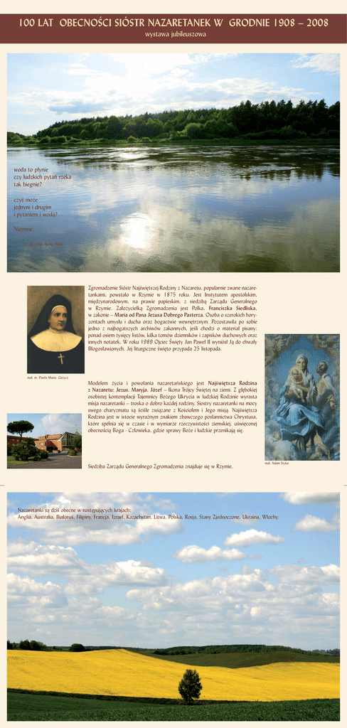 100 LAT OBECNOÂCI SIÓSTR NAZARETANEK W GRODNIE 1908 – 2008 wystawa jubileuszowa woda to p∏ynie czy ludzkich pytaƒ rzeka tak biegnie? czyÊ mo˝e jednym i drugim i pytaniem i wodà? Niemnie s. Bo˝ena Anna Flak Zgromadzenie Sióstr NajÊwi´tszej Rodziny z Nazaretu, popularnie zwane nazaretankami, powsta∏o w Rzymie w 1875 roku. Jest Instytutem apostolskim, mi´dzynarodowym, na prawie papieskim, z siedzibà Zarzàdu Generalnego w Rzymie. Za∏o˝ycielkà Zgromadzenia jest Polka, Franciszka Siedliska, w zakonie – Maria od Pana Jezusa Dobrego Pasterza. Osoba o szerokich horyzontach umys∏u i ducha oraz bogactwie wewn´trznym. Pozostawi∏a po sobie jedno z najbogatszych archiwów zakonnych, jeÊli chodzi o materia∏ pisany: ponad osiem tysi´cy listów, kilka tomów dzienników i zapisków duchowych oraz innych notatek. W roku 1989 Ojciec Âwi´ty Jan Pawe∏ II wyniós∏ Jà do chwa∏y B∏ogos∏awionych. Jej liturgiczne Êwi´to przypada 25 listopada. mal. m. Paw∏a Maria Ga˝ycz Modelem ˝ycia i powo∏ania nazaretaƒskiego jest NajÊwi´tsza Rodzina z Nazaretu: Jezus, Maryja, Józef – Ikona Trójcy Âwi´tej na ziemi. Z g∏´bokiej osobistej kontemplacji Tajemnicy Bo˝ego Ukrycia w ludzkiej Rodzinie wyrasta misja nazaretanki – troska o dobro ka˝dej rodziny. Siostry nazaretanki na mocy swego charyzmatu sà ÊciÊle zwiàzane z KoÊcio∏em i Jego misjà. NajÊwi´tsza Rodzina jest w istocie wyraênym znakiem zbawczego pos∏annictwa Chrystusa, które spe∏nia si´ w czasie i w wymiarze rzeczywistoÊci ziemskiej, uÊwi´conej obecnoÊcià Boga - Cz∏owieka, gdzie sprawy Bo˝e i ludzkie przenikajà si´. Siedziba Zarzàdu Generalnego Zgromadzenia znajduje si´ w Rzymie. mal. Adam Styka Nazaretanki sà dziÊ obecne w nast´pujàcych krajach: Anglia, Australia, Bia∏oruÊ, Filipiny, Francja, Izrael, Kazachstan, Litwa, Polska, Rosja, Stany Zjednoczone, Ukraina, W∏ochy.