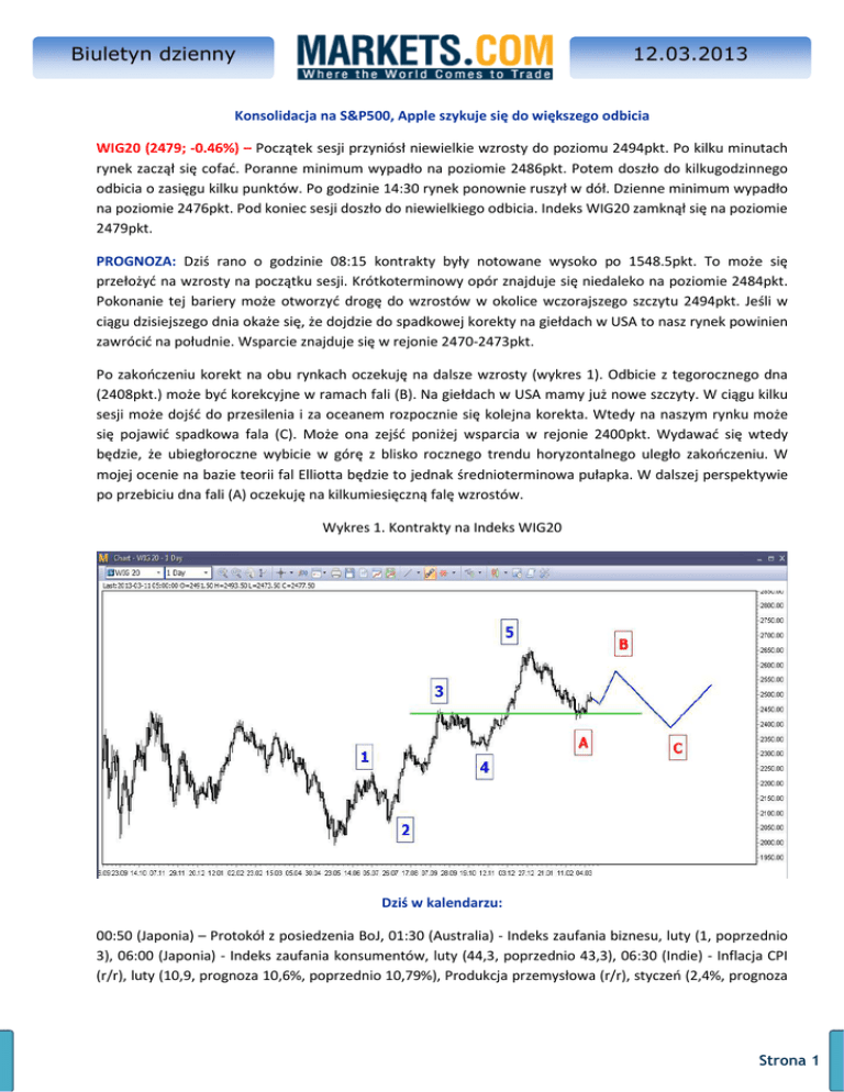 Biuletyn dzienny 12.03.2013 15 Konsolidacja na S&P500, Apple szykuje się do większego odbicia WIG20 (2479; -0.46%) – Początek sesji przyniósł niewielkie wzrosty do poziomu 2494pkt. Po kilku minutach rynek zaczął się cofać. Poranne minimum wypadło na poziomie 2486pkt. Potem doszło do kilkugodzinnego odbicia o zasięgu kilku punktów. Po godzinie 14:30 rynek ponownie ruszył w dół. Dzienne minimum wypadło na poziomie 2476pkt. Pod koniec sesji doszło do niewielkiego odbicia. Indeks WIG20 zamknął się na poziomie 2479pkt. PROGNOZA: Dziś rano o godzinie 08:15 kontrakty były notowane wysoko po 1548.5pkt. To może się przełożyć na wzrosty na początku sesji. Krótkoterminowy opór znajduje się niedaleko na poziomie 2484pkt. Pokonanie tej bariery może otworzyć drogę do wzrostów w okolice wczorajszego szczytu 2494pkt. Jeśli w ciągu dzisiejszego dnia okaże się, że dojdzie do spadkowej korekty na giełdach w USA to nasz rynek powinien zawrócić na południe. Wsparcie znajduje się w rejonie 2470-2473pkt. Po zakończeniu korekt na obu rynkach oczekuję na dalsze wzrosty (wykres 1). Odbicie z tegorocznego dna (2408pkt.) może być korekcyjne w ramach fali (B). Na giełdach w USA mamy już nowe szczyty. W ciągu kilku sesji może dojść do przesilenia i za oceanem rozpocznie się kolejna korekta. Wtedy na naszym rynku może się pojawić spadkowa fala (C). Może ona zejść poniżej wsparcia w rejonie 2400pkt. Wydawać się wtedy będzie, że ubiegłoroczne wybicie w górę z blisko rocznego trendu horyzontalnego uległo zakończeniu. W mojej ocenie na bazie teorii fal Elliotta będzie to jednak średnioterminowa pułapka. W dalszej perspektywie po przebiciu dna fali (A) oczekuję na kilkumiesięczną falę wzrostów. Wykres 1. Kontrakty na Indeks WIG20 Dziś w kalendarzu: 00:50 (Japonia) – Protokół z posiedzenia BoJ, 01:30 (Australia) - Indeks zaufania biznesu, luty (1, poprzednio 3), 06:00 (Japonia) - Indeks zaufania konsumentów, luty (44,3, poprzednio 43,3), 06:30 (Indie) - Inflacja CPI (r/r), luty (10,9, prognoza 10,6%, poprzednio 10,79%), Produkcja przemysłowa (r/r), styczeń (2,4%, prognoza Strona 1 Biuletyn dzienny 12.03.2013 15 1,2%, poprzednio -0,6%), 08:00 (Niemcy) - Inflacja CPI, fin. (m/m), luty (prognoza 0,6%, poprzednio -0,5%), Inflacja CPI, fin. (r/r), luty (prognoza 1,5%, poprzednio 1,7%), 10:30 (Wlk. Brytania) - Bilans handlu zagranicznego (GBP), styczeń (prognoza -9 mld, poprzednio -8,897 mld), Produkcja przemysłowa (r/r), styczeń (prognoza -1,1%, poprzednio -1,7%), Przetwórstwo przemysłowe (r/r), styczeń (prognoza -1,1%, poprzednio -1,5%), 19:00 (USA) - Budżet federalny (USD), luty (prognoza 205 mld, poprzednio 3 mld), 21:30 (USA) - Tygodniowa zmiana zapasów ropy wg API (poprzednio 5,6 mln brk). Rynek w USA S&P500 Future (1550.15; +0.03%) – W piątek kurs kontraktów osiągnął nowe maksimum na poziomie 1552.5pkt. Potem rozpoczęła się niewielka korekta. W poniedziałek około godziny 13-tej osiągnięte zostało dzienne minimum na poziomie 1540.5pkt. Potem rozpoczęły się wzrosty. Dzienne maksimum wypadło na poziomie 1561.65pkt. Zamknięcie wypadło na poziomie 1550.15pkt. Dziś w nocy doszło do niewielkich spadków. Lokalne minimum wypadło na razie na poziomie 1548.15pkt. O godzinie 08:15 kontrakty były notowane po 1548.5pkt. PROGNOZA: Z tegorocznego szczytu (1530pkt.) do poziomu 1482pkt. pojawiła się tylko spadkowa trójka (a-bc). Zaś z poziomu 1482pkt. widoczna jest wzrostowa trójka ze szczytem na poziomie 1552.5pkt. W perspektywie krótkoterminowej możliwa jest lokalna korekta. Byłaby to fala czwarta. Ponieważ szczyt fali pierwszej znajduje się na poziomie 1524pkt. więc miejsca na korektę jest dużo i byki nie powinny mieć problemu z obroną wsparcia również w postaci lutowego szczytu (1530pkt.). Po zakończeniu korekty oczekuję na kolejną falę wzrostów. Po pojawieniu się wzrostowej piątki (target 1570pkt.) możliwa jest korekta wzrostów z poziomu 1482pkt. Sygnał pojawi się po przebiciu szczytu fali trzeciej (1552.5pkt.). Po przebiciu poziomu 1530pkt. pojawi się sygnał do korekty wzrostów z grudniowego dna (wykres 2). Wykres 2. Kontrakty na indeks S&P500 w układzie intraday Strona 2 Biuletyn dzienny 12.03.2013 15 Na rynku technologicznym sytuacja jest podobna. Cofnięcie z ostatniego szczytu jest wyraźniejsze. Obecnie możemy znajdować się w fali 4-tej. Krytyczne wsparcie znajduje się w rejonie 2760pkt. (wykres 3). Wykres 3. Kontrakty na indeks Nasdaq100 w układzie intraday Obrona wsparcia oznacza możliwość kontynuacji wzrostów z lutowego dołka. W przeciwnym wypadku czeka nas spadek w rejon ostatniego minimum i dopiero potem rozpocznie się kolejna fala wzrostów. APPLE - Spadki z jesiennego szczytu rozwinęły się w dużą spadkową trójkę (A-B-C). Fala C powinna wykształcić 5-falową strukturę. Wczoraj doszło do wzrostów. Dzienne maksimum wypadło na poziomie 438.92 USD, zamknięcie nieznacznie niżej na poziomie 437.79 USD. Psychologiczne wsparcie znajduje się na poziomie 400 USD. Na wykresie długoterminowym widoczne są silne wsparcia w rejonie 400-420 USD. Na wykresie wskaźnika MACD-histogram tworzy się pozytywna dywergencja. To wszystko przemawia za tym, że niedługo w ciągu kilku sesji może dojść do przesilenia i mocniejszego ruchu w górę. Sygnał (średnioterminowy) do otwarcia pozycji długich pojawi się po przebiciu od dołu ważnego oporu w rejonie 440-442.50 USD (korpusy dziennych świec). Sygnał (krótkoterminowy) może się pojawić niżej. Na przykład na bazie klasycznej formacji cenowej (np. podwójne dno), lub poprzez budowę krótkoterminowego trendu wzrostowego, który z czasem przekształci się w trend średnioterminowy, lub też poprzez wykształcenie w ramach fali 5-tej mniejszej 5-falowej struktury (wykres 4). Obecnie możemy się znajdować w podfali czwartej (4-5). Po jej zakończeniu możliwy jeszcze jeden ruch w dół (5-5). Jeśli 
