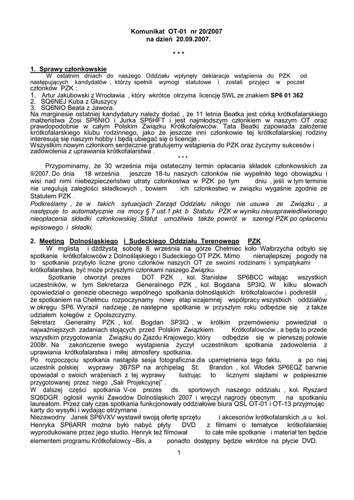 Komunikat OT-01 nr 20/2007 na dzień 20.09.2007. * * * 1. Sprawy
