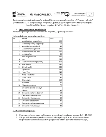 Postępowanie o udzielenie zamówienia publicznego w ramach projektu „Z Pomocą rodzinie” poddziałania 9.1.1 Regionalnego Programu Operacyjnego Województwa Małopolskiego na lata 2014-2020. Numer projektu: RPMP.09.01.01-12-0001/15 1. Opis przedmiotu zamówienia Rehabilitacja indywidualna uczestników projektu „Z pomocą rodzinie”. Usługa obejmuje następujące zabiegi: Lp. 1 2 3 4 5 6 7 8 9 10 11 12 13 14 15 16 17 18 19 20 21 22 23 24 25 Nazwa Masaż całego kręgosłupa Masaż częściowy kręgosłupa Masaż kończyn dolnych Masaż kończyn górnych Masaż limfatyczny boa Lampa solux Pole magnetyczne laser Laser wysokoenergetyczny Jontoforeza Ultradźwięki Stymulacja Prądy Tens Prądy Trauberta Prądy Kotza Krioterapia Wirówka Fala uderzeniowa Ćwiczenia bierne kończyn górnych Ćwiczenia kończyn dolnych Ćwiczenia izometryczne Ćwiczenia równoważne Ćwiczenia oddechowe Ćwiczenia ogólnorozwojowe Ćwiczenia rozluźniające Ilość 420 10 40 100 200 80 200 200 210 150 380 180 240 40 50 150 20 72 30 60 30 40 20 10 20 II. Warunki współpracy: 1. Umowa cywilno-prawna realizowana w okresie od podpisania umowy do 31.12.2016 2. Usługa realizowana w pomieszczeniach udostępnionych przez Wykonawcę lub w miejscu zamieszkania uczestników projektu na terenie powiatu chrzanowskiego, III. O udzielenie zamówienia, mogą ubiegać się Wykonawcy, którzy spełniają następujące warunki: 1. Pomieszczenie udostępnione przez Wykonawcę na potrzeby realizacji usługi musi znajdować się na terenie powiatu chrzanowskiego, 2. Wykonawca posiada uprawnienia do wykonywania usług rehabilitacji. 3. Wykonawca posada wyposażenie pozwalające na realizację wszystkich zabiegów wymienionych w pkt I. Weryfikacja na podstawie oświadczenia zawartego w formularzu oferty. IV. Kryteria oceny oferty, informacja o wagach punktowych, opis sposobów przyznawania punktacji. W niniejszym postępowaniu wybór oferty dokonany zostanie na podstawie kryterium: cena brutto - 100 % Oferty niepodlegające odrzuceniu oceniane będą wg wzoru: P1 = (Cmin / C of. licz.) x 100% przy czym 1 % =1 pkt. gdzie: Cmin - najniższa całkowita cena brutto wykonania zamówienia spośród wszystkich ocenianych ofert. C of. licz. - zaoferowana całkowita cena brutto wykonania zamówienia w ofercie ocenianej. P1 - ilość punktów w kryterium przyznanych ofercie ocenianej. Jako oferta najkorzystniejsza uznana zostanie ta, która otrzyma największą ilość punktów. Opis sposobu obliczenia ceny oferty: 1. W druku „oferta” – należy podać cenę: Lp. 1 2 3 4 5 6 7 8 9 10 11 12 13 14 15 Nazwa Masaż całego kręgosłupa Masaż częściowy kręgosłupa Masaż kończyn dolnych Masaż kończyn górnych Masaż limfatyczny boa Lampa solux Pole magnetyczne laser Laser wysokoenergetyczny Jontoforeza Ultradźwięki Stymulacja Prądy Tens Prądy Trauberta Prądy Kotza Ilość Cena za zabieg netto Cena za zabieg brutto 420 10 40 100 200 80 200 200 210 150 380 180 240 40 50 16 Krioterapia 17 Wirówka 18 Fala uderzeniowa Ćwiczenia bierne kończyn 19 górnych 20 Ćwiczenia kończyn dolnych 21 Ćwiczenia izometryczne 22 Ćwiczenia równoważne 23 Ćwiczenia oddechowe 24 Ćwiczenia ogólnorozwojowe 25 Ćwiczenia rozluźniające 150 20 72 30 60 30 40 20 10 20 2. Cena ofertowa musi uwzględniać wszystkie należne wykonawcy elementy wynagrodzenia wynikające z tytułu przygotowania oferty, realizacji i rozliczenia przedmiotu zamówienia. 3. W wyniku nieuwzględnienia okoliczności, które mogą wpłynąć na cenę zamówienia, Wykonawca ponosić będzie skutki błędów w ofercie. Od Wykonawcy wymagane jest bardzo szczegółowe zapoznanie się z przedmiotem zamówienia, a także sprawdzenie warunków wykonania zamówienia i skalkulowanie ceny oferty z należytą starannością. 4. Cena ma być wyrażona w złotych polskich netto i brutto z uwzględnieniem należnego podatku VAT. Cenę oferty należy podać z dokładnością do dwóch miejsc po przecinku (zł/ gr). 5. Dla porównania ofert zamawiający przyjmuje cenę brutto stanowiącą wycenę całości przedmiotu zamówienia, określoną w formularzu ofertowym. V. Miejsce oraz termin składania ofert. Oferty należy składać na adres e-mail: [email protected] lub osobiście w siedzibie PCPR w Chrzanowie, ul. Topolowa 16, do dnia 27.05.2016 do godziny 9.00. VI. Warunki zmiany umowy zawartej w wyniku przeprowadzonego postępowania o udzielenie zamówienia publicznego. 1. Zamawiający przewiduje możliwość zmiany ilości osób korzystających z usługi oraz ilości zabiegów. 2. Zamawiający przewiduje możliwość unieważnienia postępowania o udzielenie zamówienia i odstąpienia od umowy w przypadku nieprzyznania środków pochodzących z budżetu Unii Europejskiej, które miały być przeznaczone na sfinansowanie projektu.