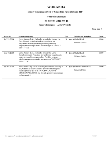 WOKANDA spraw wyznaczonych w Urzędzie Patentowym RP w trybie spornym na dzień: 2015-07-16 Przewodniczący: Artur Pyliński Sala nr: 1 Sygn. akt Przedmiot sprawy Sp.339.2014 Loris Azzaro B.V., Holandia przeciwko Nature Up Eurl, Francja o stwierdzenie wygaśnięcia na terytorium Rzeczypospolitej Polskiej ochrony międzynarodowego znaku towarowego "AZZARO" IR.841773A R Loris Azzaro B.V., Holandia przeciwko Loris Developpement, Francja o stwierdzenie wygaśnięcia na terytorium Rzeczypospolitej Polskiej ochrony międzynarodowego znaku towarowego "AZZARO" IR.841773C R Nixor Polska Sp.z o.o, Kowale przweciwko Ecol Sp.z o.o, Gdańsk o unieważnienie prawa ochronnego na wzór użytkowy pt: "FILTR PODWŁAZOWY ODORÓW" Ru.66936 /na skutek sprzeciwu uznanego za bezzasadny/ R Sp.340.2014 Sp.164.2015 R - rozprawa, P - posiedzenie niejawne, O - ogłoszenie decyzji. Typ Członkowie Kolegium Godz. (spr.) Michał Kruk 10:00 Elżbieta Golisz (spr.) Michał Kruk 11:00 Elżbieta Golisz (spr.) Bolesław Białkowicz 13:00 Krzysztof Gos wersja 1