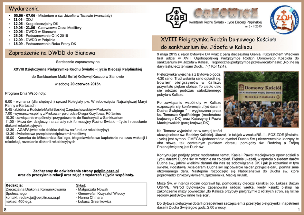 Wydarzenia 05.06 - 07.06 - Misterium o św. Józefie w Tczewie (warsztaty) ? 11.06 - DDJ ? ? 12.06 - Krąg diecezjalny DK ? 19.06 - 21.06 - Czerwcowa Oaza Modlitwy ? 20.06 - DWDD w Sianowie ? 25.08 - Podsumowanie OŻK 2015 ? 12.09 - DWDD w Pelplinie ? 18.09 - Podsumowanie Roku Pracy DK Zaproszenie na DWDD do Sianowa Serdecznie zapraszamy na XXVIII Dziękczynną Pielgrzymkę Ruchu Światło - Życie Diecezji Pelplińskiej do Sanktuarium Matki Bożej Królowej Kaszub w Sianowie w sobotę 20 czerwca 2015r. Program Dnia Wspólnoty: 6.00 - wymarsz (dla chętnych) sprzed Kolegiaty pw. Wniebowzięcia Najświętszej Maryi Panny w Kartuzach 6.45 - zbiórka w Kościele Matki Boskiej Częstochowskiej w Prokowie 7.00 - wymarsz wspólny z Prokowa - po drodze Droga Krzyżowa, Różaniec 10.30 - zawiązanie wspólnoty i przygotowanie do Eucharystii w Sanktuarium 11.00 - Msza św. dziękczynna za cały rok formacyjny Ruchu Światło –Życie i rozesłanie diakonii rekolekcyjnych 12.30 - AGAPA (w trakcie zbiórka datków na fundusz rekolekcyjny) 13.30 - świadectwa przeplatane śpiewem i modlitwą 15.00 - Koronka do Miłosierdzia Bożego, błogosławieństwo kapłańskie na czas wakacji i rekolekcji, rozesłanie diakonii rekolekcyjnych Zachęcamy do odwiedzenia strony pelplin.oaza.pl oraz do przesyłania relacji oraz zdjęć z wydarzeń z życia wspólnoty. Redakcja: Diecezjalna Diakonia Komunikowania Społecznego kontakt: [email protected] nakład: 400 egz. 8 Skład: - Małgorzata Nowak - Genowefa i Krzysztof Wieccy - Hanna Chmara - Łukasz Grzenkowicz kwartalnik Ruchu Światło - Życie Diecezji Pelplińskiej nr 5 - II 2015 XVIII Pielgrzymka Rodzin Domowego Kościoła do sanktuarium św. Józefa w Kaliszu 9 maja 2015 r. rejon bytowski DK wraz z parą diecezjalną Gienią i Krzysztofem Wieckimi brał udział w XVIII Ogólnopolskiej Pielgrzymce Rodzin Domowego Kościoła do sanktuarium św. Józefa w Kaliszu. Tegorocznej pielgrzymce przyświecało hasło: „Różne są dary łaski, lecz ten sam Duch…” (1 Kor 12,4). Pielgrzymka wyjechała z Bytowa o godz. 4:30 rano. Trud wstania rano opłacił się, bowiem pielgrzymów w Kaliszu przywitało piękne słońce. To ciepło dało się odczuć podczas całodziennego pobytu w Kaliszu. Po zawiązaniu wspólnoty w Kaliszu rozpoczęła się konferencja „Żyć darami Ducha Świętego ” – wygłoszona przez ks. Tomasza Opalińskiego (moderatora krajowego DK) oraz Katarzynę i Pawła Maciejewskich (parę krajową DK). Ks. Tomasz wyjaśniał, co w swojej treści ukazuje obraz św. Rodziny Kaliskiej. Ukazał, że tak jak w znaku RŚ-Ż – FOZ-ZOE (ŚwiatłoŻycie) jest symbol OMEGA (jednocześnie symbol Ducha Św.) nierozerwalnie łączący te oba słowa, tak centralnym punktem obrazu, pomiędzy św. Rodziną a Trójcą Przenajświętszą jest Duch św. Kontynuując podjęty przez moderatora temat, Kasia i Paweł Maciejewscy opowiedzieli o życiu darami Ducha św. w rodzinie na co dzień. Pięknie ukazali, w oparciu o siedem darów Ducha św., jakimi wielkimi darami dla nas są zobowiązania DK i jak je rozumieć w tym świetle. Podstawą życia darami Ducha św. są: otwarcie na dar, przyjęcie daru, pomnażanie otrzymanego daru. Następnie rozpoczęło się Nabożeństwa do Ducha św. które poprowadził z niezwykłym entuzjazmem ks. Maciej Krulak. Mszę Św. w intencji rodzin odprawił bp. pomocniczy diecezji kaliskiej bp. Łukasz Buzun OSPPE. Wśród bytowiaków zapanowała radość wielka, kiedy ksiądz biskup na zakończenie mszy powiedział „do Kalisza przybyły pielgrzymki z różnych stron, są różne regiony, jest Bytów i inne miejsca”. Do Bytowa pielgrzymi dotarli przepełnieni szczęściem z przeżytej pielgrzymki i napełnieni darami Ducha Świętego o godz. 2.00 w nocy. 1 Ruch Światło – Życie po raz pierwszy spotkał się w Sejmie RP W Sejmie Rzeczpospolitej Polskiej 18 kwietnia 2015 r. miało miejsce historyczne wydarzenie, a mianowicie odbyło się sympozjum poświęcone „Działalności społecznej sługi Bożego ks. dr. hab. Franciszka Blachnickiego”. Konferencja ta odbyła się w Sali Kolumnowej. Już na wstępie ks. bp Adam Wodarczyk – moderator generalny Ruchu Światło-Życie zauważył, iż myśl społeczna ks. Blachnickiego może być jeszcze raz przypomniana i uznana w tak uroczystym miejscu, gdy Jego proces beatyfikacyjny dobiega końca i już niedługo będziemy mogli cieszyć się z faktu, iż Nasz założyciel został zaliczony w poczet błogosławionych Kościoła katolickiego. Ten fakt, napełniwszy całą wspólnotę ruchu Światło-Życie ogromną radością, z całą pewnością potwierdzi i rozpropaguje dorobek duchowo-intelektualny Naszego Założyciela. Wśród uczestników sympozjum była 9-osobowa grupa członków Wspólnoty Domowego Kościoła, gałęzi rodzinnej Ruchu Światło-Życie naszej pelplińskiej diecezji: Mariola i Zdzisław Lejkowie z Sierakowic, ze swymi córkami: Ewą, Jolą i Martyną, Kazik i Joasia Muzolfowie z Lubiewa oraz Basia i Henio Urbańscy z Chojnic. Konferencję o działalności społecznej ks. Blachnickiego zorganizowali Instytut im. ks. Franciszka Blachnickiego oraz Parlamentarny Zespół Sympatyków Ruchu ŚwiatłoŻycie, Akcji Katolickiej i Katolickiego Stowarzyszenia Młodzieży. 2 Oazy letnie 2015 Termin Typ oazy Szczegóły Turnus I 30 VI - 13 VII ODB Opłata: 400zł (przedpłata 100zł) 27 VI - 13 VII OND Io, OND IIo Miejsce: Pelplin Moderator: ks. Marek Chmist Opłata: 480zł (przedpłata 100zł) OND IIIo Opłata: 450zł (przedpłata 100zł) o ON, ONŻ I ON, ONŻ IIo ON, ONŻ IIIo, OR Turnus II 14-30 VII ODB OND Miejsce: Zamek Bierzgłowski Moderator: ks. Wacław Dokurno Opłata: 800zł (przedpłata 400zł) Miejsce: Goręczyno Moderator: ks. Artur Tybusz Opłata: 480zł (przedpłata 100zł) Miejsce: Kasparus Moderator: ks. Karol Gierszewski Opłata: 480zł (przedpłata 100zł) Miejsce: Kartuzy Moderator: ks. Mateusz Szulc Opłata: 480zł (przedpłata 100zł) Miejsce: P
