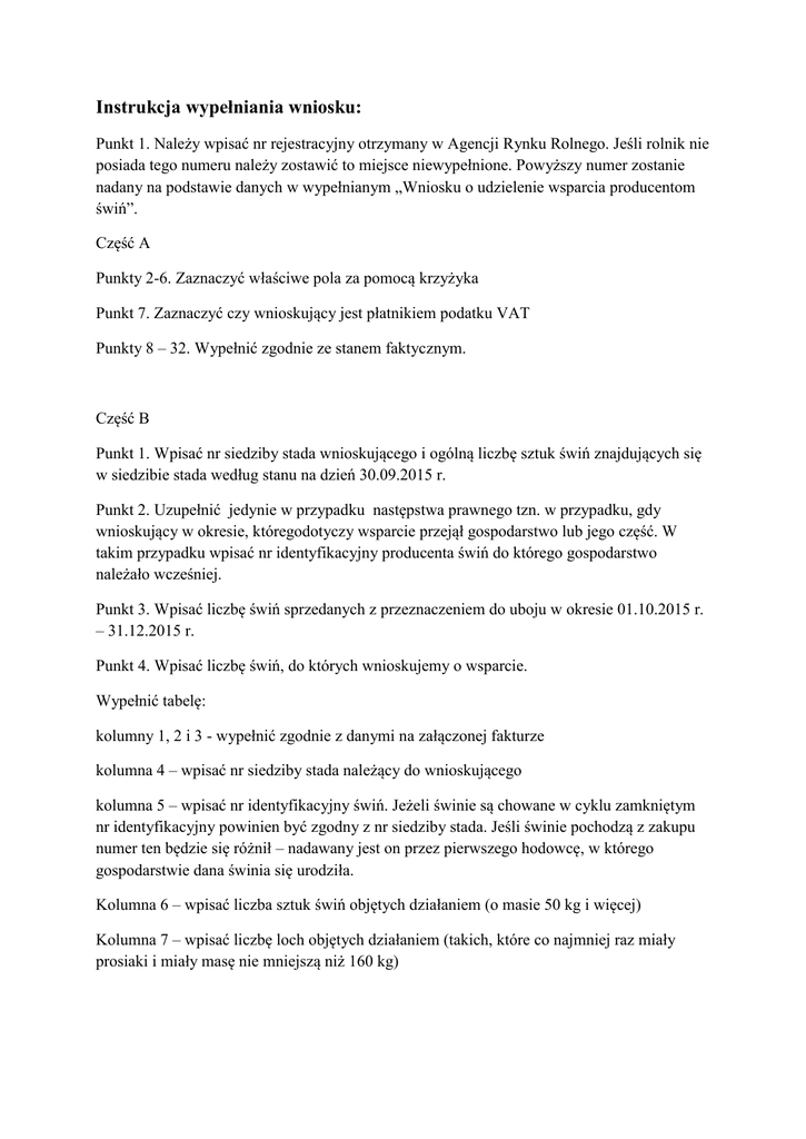 Instrukcja wypełniania wniosku: Punkt 1. Należy wpisać nr rejestracyjny otrzymany w Agencji Rynku Rolnego. Jeśli rolnik nie posiada tego numeru należy zostawić to miejsce niewypełnione. Powyższy numer zostanie nadany na podstawie danych w wypełnianym „Wniosku o udzielenie wsparcia producentom świń”. Część A Punkty 2-6. Zaznaczyć właściwe pola za pomocą krzyżyka Punkt 7. Zaznaczyć czy wnioskujący jest płatnikiem podatku VAT Punkty 8 – 32. Wypełnić zgodnie ze stanem faktycznym. Część B Punkt 1. Wpisać nr siedziby stada wnioskującego i ogólną liczbę sztuk świń znajdujących się w siedzibie stada według stanu na dzień 30.09.2015 r. Punkt 2. Uzupełnić jedynie w przypadku następstwa prawnego tzn. w przypadku, gdy wnioskujący w okresie, któregodotyczy wsparcie przejął gospodarstwo lub jego część. W takim przypadku wpisać nr identyfikacyjny producenta świń do którego gospodarstwo należało wcześniej. Punkt 3. Wpisać liczbę świń sprzedanych z przeznaczeniem do uboju w okresie 01.10.2015 r. – 31.12.2015 r. Punkt 4. Wpisać liczbę świń, do których wnioskujemy o wsparcie. Wypełnić tabelę: kolumny 1, 2 i 3 - wypełnić zgodnie z danymi na załączonej fakturze kolumna 4 – wpisać nr siedziby stada należący do wnioskującego kolumna 5 – wpisać nr identyfikacyjny świń. Jeżeli świnie są chowane w cyklu zamkniętym nr identyfikacyjny powinien być zgodny z nr siedziby stada. Jeśli świnie pochodzą z zakupu numer ten będzie się różnił – nadawany jest on przez pierwszego hodowcę, w którego gospodarstwie dana świnia się urodziła. Kolumna 6 – wpisać liczba sztuk świń objętych działaniem (o masie 50 kg i więcej) Kolumna 7 – wpisać liczbę loch objętych działaniem (takich, które co najmniej raz miały prosiaki i miały masę nie mniejszą niż 160 kg) Na stronie 5 wpisujemy dalszą część faktur, które nie zmieściły się na stronie 4. Punkt 5 (strona 6) – zaznaczyć informację o załącznikach Na dole strony 6 miejscowość, data i czytelny podpis wnioskującego. Załącznik „Zgoda współposiadaczy gospodarstwa rolnego” dołączamy do wniosku jedynie w przypadku, gdy tacy współposiadacze są. Nie dotyczy to współwłasności wynikającej z ustawowej wspólności majątkowej małżonków. Załącznik „Oświadczenie małżonków o wspólności majątkowej gospodarstwa rolnego” dołączyć do wniosku jedynie w przypadku, gdy w załączonych dokumentach (fakturach) pojawiają się dane drugiego ze współmałżonków (innego niż widnieje na wniosku)