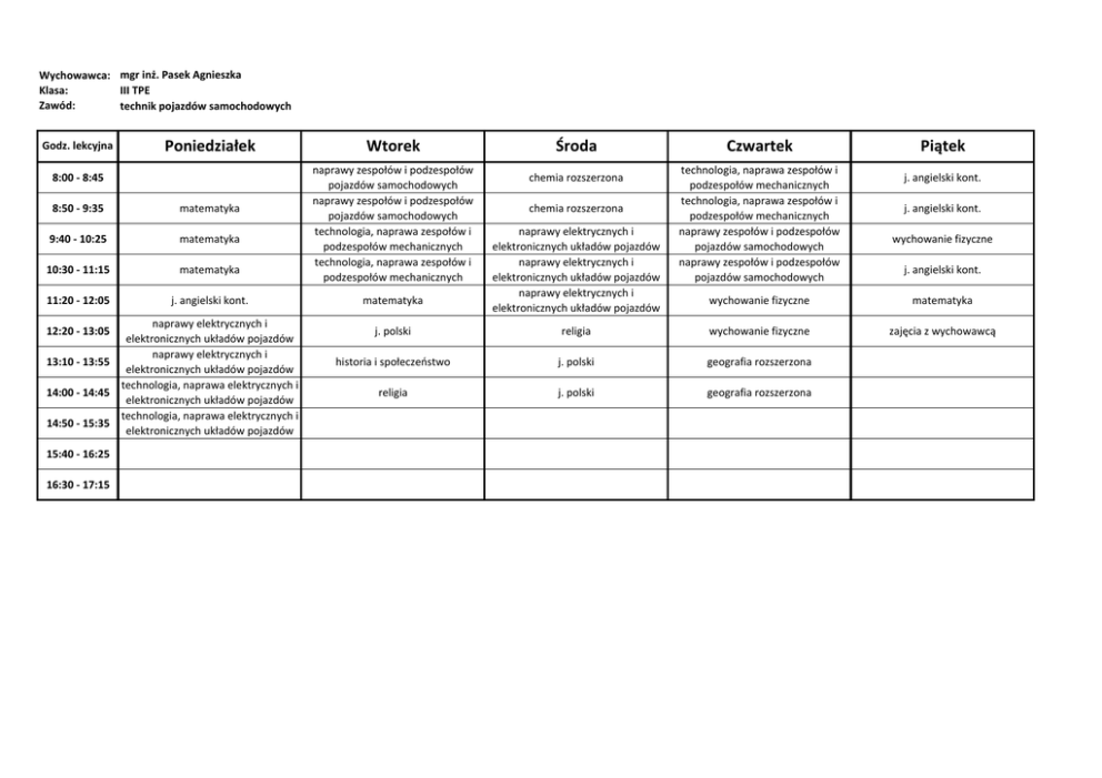 Wychowawca: mgr inż. Pasek Agnieszka III TPE Klasa: Zawód: technik pojazdów samochodowych Godz. lekcyjna Poniedziałek 8:00 ‐ 8:45 8:50 ‐ 9:35 matematyka 9:40 ‐ 10:25 matematyka 10:30 ‐ 11:15 matematyka 11:20 ‐ 12:05 j. angielski kont. naprawy elektrycznych i elektronicznych układów pojazdów naprawy elektrycznych i 13:10 ‐ 13:55 elektronicznych układów pojazdów technologia, naprawa elektrycznych i 14:00 ‐ 14:45 elektronicznych układów pojazdów technologia, naprawa elektrycznych i 14:50 ‐ 15:35 elektronicznych układów pojazdów 12:20 ‐ 13:05 15:40 ‐ 16:25 16:30 ‐ 17:15 Wtorek naprawy zespołów i podzespołów pojazdów samochodowych naprawy zespołów i podzespołów pojazdów samochodowych technologia, naprawa zespołów i podzespołów mechanicznych technologia, naprawa zespołów i podzespołów mechanicznych matematyka Środa chemia rozszerzona chemia rozszerzona naprawy elektrycznych i elektronicznych układów pojazdów naprawy elektrycznych i elektronicznych układów pojazdów naprawy elektrycznych i elektronicznych układów pojazdów Czwartek technologia, naprawa zespołów i podzespołów mechanicznych technologia, naprawa zespołów i podzespołów mechanicznych naprawy zespołów i podzespołów pojazdów samochodowych naprawy zespołów i podzespołów pojazdów samochodowych Piątek j. angielski kont. j. angielski kont. wychowanie fizyczne j. angielski kont. wychowanie fizyczne matematyka zajęcia z wychowawcą j. polski religia wychowanie fizyczne historia i społeczeństwo j. polski geografia rozszerzona religia j. polski geografia rozszerzona