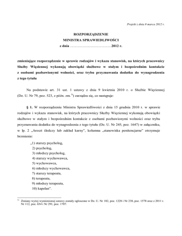 Projekt z dnia 8 marca 2012 r. ROZPORZĄDZENIE MINISTRA SPRAWIEDLIWOŚCI z dnia …………….………………2012 r. zmieniające rozporządzenie w sprawie rodzajów i wykazu stanowisk, na których pracownicy Służby Więziennej wykonują obowiązki służbowe w stałym i bezpośrednim kontakcie z osobami pozbawionymi wolności, oraz trybu przyznawania dodatku do wynagrodzenia z tego tytułu Na podstawie art. 31 ust. 1 ustawy z dnia 9 kwietnia 2010 r. o Służbie Więziennej (Dz. U. Nr 79, poz. 523, z późn. zm. 1)) zarządza się, co następuje: § 1. W rozporządzeniu Ministra Sprawiedliwości z dnia 15 grudnia 2010 r. w sprawie rodzajów i wykazu stanowisk, na których pracownicy Służby Więziennej wykonują obowiązki służbowe w stałym i bezpośrednim kontakcie z osobami pozbawionymi wolności oraz trybu przyznawania dodatku do wynagrodzenia z tego tytułu (Dz. U. Nr 245, poz. 1647) w załączniku, w lp. 2 „Areszt śledczy lub zakład karny”, kolumna „stanowiska penitencjarne” otrzymuje brzmienie: „1) starszy psycholog, 2) psycholog, 3) młodszy psycholog, 4) starszy wychowawca, 5) wychowawca, 6) młodszy wychowawca, 7) starszy terapeuta, 8) terapeuta, 9) młodszy terapeuta, 10) kapelan”. 1) Zmiany wyżej wymienionej ustawy zostały ogłoszone w Dz. U. Nr 182, poz. 1228 i Nr 238, poz. 1578 oraz z 2011 r. Nr 112, poz. 654 i Nr 291, poz. 1707. § 2. Rozporządzenie ma zastosowanie do ustalania wysokości dodatku do wynagrodzenia z tytułu wykonywania obowiązków służbowych w stałym i bezpośrednim kontakcie z osobami pozbawionymi wolności od dnia 1 stycznia 2012 r. § 3. Rozporządzenie wchodzi w życie po upływie 14 dni od dnia ogłoszenia. MINISTER SPRAWIEDLIWOŚCI W porozumieniu: MINISTER PRACY I POLITYKI SPOŁECZNEJ 2 UZASADNIENIE Potrzeba wydania rozporządzenia Ministra Sprawiedliwości zmieniającego rozporządzenie z dnia 15 grudnia 2010 r. w sprawie rodzajów i wykazu stanowisk, na których pracownicy Służby Więziennej wykonują obowiązki służbowe w stałym i bezpośrednim kontakcie z osobami pozbawionymi wolności oraz trybu przyznawania dodatku do wynagrodzenia z tego tytułu (Dz. U. Nr 245, poz. 1647), jest konsekwencją wejścia w życie z dniem 1 stycznia 2012 r. nowego wykazu stanowisk stanowiącego załącznik do rozporządzenia Rady Ministrów z dnia 22 lipca 2010 r. w sprawie rodzajów i wykazu stanowisk, na których pracownicy jednostek organizacyjnych Służby Więziennej są zatrudniani na zasadach określonych w przepisach o pracownikach urzędów państwowych (Dz. U. Nr 143, poz. 964), wydanego na podstawie upoważnienia ustawowego zawartego w art. 31 ust. 2 ustawy z dnia 9 kwietnia 2010 r. o Służbie Więziennej (Dz. U. Nr 79, poz.523, z późn. zm.). Na mocy rozporządzenia Rady Ministrów z dnia 6 września 2011 r. zmieniającego rozporządzenie w sprawie rodzajów i wykazu stanowisk, na których pracownicy jednostek organizacyjnych Służby Więziennej są zatrudniani na zasadach określonych w przepisach o pracownikach urzędów państwowych (Dz. U. Nr 206, poz. 1215), zostały dodane nowe stanowiska: młodszego psychologa, młodszego terapeuty, terapeuty i starszego terapeuty do grupy stanowisk penitencjarnych w areszcie śledczym lub zakładzie karnym. Pracownicy zatrudnieni na wyżej wskazanych stanowiskach są uprawnieni do otrzymywania dodatku do wynagrodzenia z tytuły wykonywania obowiązków służbowych w stałym i bezpośrednim kontakcie z osobami pozbawionymi wolności. Wysokość dodatku nie może przekroczyć 50% wynagrodzenia zasadniczego pracownika zatrudnionego na stanowisku penitencjarnym. Stanowisko młodszego psychologa uzupełnia grupę dotychczasowych stanowisk penitencjarnych: psychologa i starszego psychologa. Aktualnie pracownicy są przyjmowani na stanowisko psychologa, dopiero po spełnieniu wymogu 3 lat pracy, w grupie zaszeregowania VIII – XII. W związku z koniecznością zabezpieczenia opieki psychologicznej, uzasadnione było wprowadzenie stanowiska „młodszego psychologa”, bez wymogu stażu pracy, w grupie zaszeregowania VI – VIII, podobnie jak na stanowisku młodszego wychowawcy. Powyższe rozwiązanie pozwoli na uzyskanie oszczędności w tym zakresie z uwagi na możliwość zatrudnienia pracowników w niższej niż dotychczas grupie zaszeregowania oraz wydłuży ścieżkę awansu zawodowego w tej grupie pracowników. Natomiast dodanie stanowisk młodszego terapeuty, terapeuty i starszego terapeuty było niezbędne dla prawidłowego funkcjonowania terapii na oddziałach terapeutycznych. Aktualnie pracownicy wykonują obowiązki z zakresu terapii uzależnień w oddziałach terapeutycznych dla uzależnionych od środków odurzających, psychotropowych lub alkoholu na stanowiskach w grupie wychowawców lub inspektorów. Stworzenie równorzędnej grupy stanowisk terapeutów dla stanowisk wychowawców w oddziałach terapeutycznych pozwoliło na wykonywanie zadań służbowych przez tych pracowników zgodnie z posiadanymi kwalifikacjami. Charakter pracy terapeuty jest porównywalny z pracą wychowawcy na oddziale penitencjarnym, 3 a profesjonalne wykonywanie zadań wymaga od terapeutów ukończenia szeregu dodatkowych kursów z zakresu terapii uzależnień. Konsekwencją wprowadzenia zmian w rozporządzeniu Rady Ministrów w sprawie rodzajów i wykazu stanowisk, na których pracownicy jednostek organizacyjnych Służby Więziennej są zatrudniani na zasadach określonych w przepisach o pracownikach urzędów państwowych jest równoczesne dodanie wyżej wymienionych stanowisk realizujących obowiązki na stanowiskach penitencjarnych do wykazu stanowisk w rozporządzeniu Ministra Sprawiedliwości z dnia 15 grudnia 2010 r. w sprawie rodzajów i wykazu stanowisk, na których pracownicy Służby Więziennej wykonują obowiązki służbowe w stałym i bezpośrednim kontakcie z osobami pozbawionymi wolności oraz trybu przyznawania dodatku do wynagrodzenia z tego tytułu. Przepisy rozporządz
