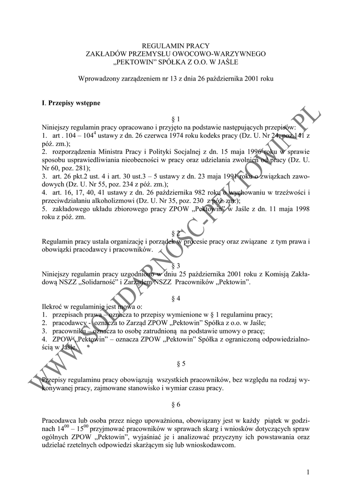 REGULAMIN PRACY ZAKŁADÓW PRZEMYSŁU OWOCOWO-WARZYWNEGO „PEKTOWIN” SPÓŁKA Z O.O. W JAŚLE Wprowadzony zarządzeniem nr 13 z dnia 26 października 2001 roku I. Przepisy wstępne §1 Niniejszy regulamin pracy opracowano i przyjęto na podstawie następujących przepisów: 1. art . 104 – 1044 ustawy z dn. 26 czerwca 1974 roku kodeks pracy (Dz. U. Nr 24, poz.141 z póź. zm.); 2. rozporządzenia Ministra Pracy i Polityki Socjalnej z dn. 15 maja 1996 roku w sprawie sposobu usprawiedliwiania nieobecności w pracy oraz udzielania zwolnień od pracy (Dz. U. Nr 60, poz. 281); 3. art. 26 pkt.2 ust. 4 i art. 30 ust.3 – 5 ustawy z dn. 23 maja 1991 roku o związkach zawodowych (Dz. U. Nr 55, poz. 234 z póź. zm.); 4. art. 16, 17, 40, 41 ustawy z dn. 26 października 982 roku o wychowaniu w trzeźwości i przeciwdziałaniu alkoholizmowi (Dz. U. Nr 35, poz. 230 z póź. zm.); 5. zakładowego układu zbiorowego pracy ZPOW „Pektowin” w Jaśle z dn. 11 maja 1998 roku z póź. zm. §2 Regulamin pracy ustala organizację i porządek w procesie pracy oraz związane z tym prawa i obowiązki pracodawcy i pracowników. §3 Niniejszy regulamin pracy uzgodniono w dniu 25 października 2001 roku z Komisją Zakładową NSZZ „Solidarność” i Zarządem NSZZ Pracowników „Pektowin”. §4 Ilekroć w regulaminie jest mowa o: 1. przepisach prawa – oznacza to przepisy wymienione w § 1 regulaminu pracy; 2. pracodawcy - oznacza to Zarząd ZPOW „Pektowin” Spółka z o.o. w Jaśle; 3. pracowniku – oznacza to osobę zatrudnioną na podstawie umowy o pracę; 4. ZPOW „Pektowin” – oznacza ZPOW „Pektowin” Spółka z ograniczoną odpowiedzialnością w Jaśle. §5 Przepisy regulaminu pracy obowiązują wszystkich pracowników, bez względu na rodzaj wykonywanej pracy, zajmowane stanowisko i wymiar czasu pracy. §6 Pracodawca lub osoba przez niego upoważniona, obowiązany jest w każdy piątek w godzinach 1400 – 1500 przyjmować pracowników w sprawach skarg i wniosków dotyczących spraw ogólnych ZPOW „Pektowin”, wyjaśniać je i analizować przyczyny ich powstawania oraz udzielać rzetelnych odpowiedzi skarżącym się lub wnioskodawcom. 1 §7 1. Wszelkich informacji wychodzących na zewnątrz ZPOW „Pektowin” udziela pracodawca lub osoby przez niego upoważnione. 2. Bez zgody pracodawcy lub osoby przez niego upoważnionej nie można wydawać na zewnątrz, ani udostępniać nieupoważnionym osobom dokumentów i ich kserokopii zawierających tajemnice służbowe lub państwowe, w tym związane z ochroną dóbr osobistych i ochroną danych osobowych. 3. Osoby uprawnione na podstawie odrębnych przepisów do przeprowadzania kontroli działalności ZPOW „Pektowin” wykonują swoje kompetencje po uprzednim sprawdzeniu dokumentów uprawniających do kontroli i zawiadomieniu o niej pracodawcy lub osoby upoważnionej oraz po dokonaniu stosownego wpisu do „Księgi kontroli”. Udostępnieniu i kopiowaniu podlegają tylko te dokumenty, które są niezbędne do wykonywania kontroli. §8 Regulamin pracy podaje się do wiadomości każdego przyjmowanego do pracy pracownika, a zapoznanie się z jego treścią pracownik potwierdza własnoręcznym podpisem w oświadczeniu. Oświadczenie zostaje dołączone do akt osobowych pracownika. II. Organizacja pracy §9 Pracodawca jest obowiązany w szczególności: 1. zaznajamiać pracownika podejmującego pracę z zakresem obowiązków, sposobem wykonywania pracy w podstawowymi jego uprawnieniami; 2. organizować pracę w sposób zapewniający pełne wykorzystanie czasu pracy oraz osiąganie przez pracownika wysokiej wydajności i należytej jakości pracy; 3. wydawać pracownikom potrzebne materiały i narzędzia pracy, a także niezbędne z punktu widzenie przepisów bhp odzież i obuwie robocze, ochronne i sprzęt ochrony osobistej; 4. zapewniać bezpieczne i higieniczne warunki pracy, w tym wyposażenie pomieszczeń pracy w zbiorowe środki ochrony zdrowia oraz ich sprawność i właściwe stosowanie; 5. zapewniać pracownikom napoje w ilości zaspokajającej potrzeby pracowników, odpowiednio zimne lub gorące w zależności od warunków wykonywania pracy: a. w warunkach gorącego mikroklimatu, gdy wartość wskaźnika obciążenia termicznego (WBGT) wynosi powyżej 25oC; b. przy pracach na otwartej przestrzeni, przy temperaturze otoczenia poniżej 10oC lub powyżej 25oC; c. na stanowiskach pracy, na których temperatura spowodowana warunkami atmosferycznymi przekracza 25o C. 6. zapewnić pracownikom odpowiednie urządzenia higieniczno- sanitarne oraz niezbędne środki higieny osobistej, a także środki udzielania pierwszej pomocy w razie wypadku; 7. prowadzić w czasie pracy szkolenie pracowników w zakresie bhp; 8. poddawać pracowników, na swój koszt, okresowym i kontrolnym badaniom lekarskim; 9. informować pracowników o występujących w zakładzie pracy zagrożeniach zdrowia lub życia, ryzyku zawodowym, a także o wynikach badań czynników szkodliwych dla zdrowia występujących w środowisku pracy; 2 10. zapewniać, aby prace, przy których istnieje możliwość wystąpienia szczególnego zagrożenia dla zdrowia lub życia ludzi, były wykonywane przez co najmniej 2 osoby w celu zapewnienia asekuracji- wykaz takich rodzajów prac stanowi załącznik nr 1 regulaminu pracy. § 10 1. Pracownik jest obowiązany wykonywać pracę sumiennie i starannie oraz stosować się do poleceń przełożonych, które dotyczą pracy, jeżeli nie są one sprzeczne z przepisami prawa pracy lub umową o pracę. 2. Przestrzeganie przepisów i zasad bhp jest podstawowym obowiązkiem pracownika. W szczególności pracownik jest obowiązany: a. znać przepisy i zasady bhp, brać udział w szkoleniach oraz poddawać się wymaganym egzaminom sprawdzającym b. wykonywać pracę zgodnie z przepisami i zasadami bhp oraz stosować się do wydawanych w tym zakresie poleceń przełożonych; c. dbać o należyty stan maszyn urządzeń narzędzi i sprzętu oraz 