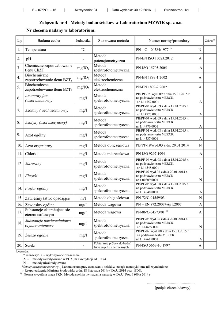 F – 07/POL - 15 Nr wydania: 04 Data wydania: 30.12.2016 Strona/stron: 1/1 Załącznik nr 4– Metody badań ścieków w Laboratorium MZWIK sp. z o.o. Nr zlecenia nadany w laboratorium: Badana cecha L.p 1. Temperatura 2. pH 3. 4. 5. Chemiczne zapotrzebowanie tlenu ChZT Biochemiczne zapotrzebowanie tlenu BZT5 Biochemiczne zapotrzebowanie tlenu BZT5 Stosowana metoda Jednostka °C mg/lO2 mg/lO2 mg/lO2 Metoda potencjometryczna Metoda spektrofotometryczna Metoda elektrochemiczna Metoda elektrochemiczna Numer normy/procedury Zakres* PN – C – 04584:1977 1) N PN-EN ISO 10523:2012 A PN-ISO 15705:2005 A PN-EN 1899-1:2002 A PN-EN 1899-2:2002 A Azot ogólny mg/l Metoda spektrofotometryczna PB/ PF-02 wyd. 09 z dnia 15.01.2015 r. na podstawie testu MERCK nr 1.14752.0001 PB/PF-03 wyd. 09 z dnia 15.01.2015 r. na podstawie testu MERCK nr 1.14773.0001 PB/PF-04 wyd. 09 z dnia 15.01.2015 r. na podstawie testu MERCK nr 1.14776.0001 PB/PF-01 wyd. 08 z dnia 15.01.2015 r. na podstawie testu MERCK nr 1.14537.0001 10. Azot organiczny mg/l Metoda obliczeniowa PB/PF-19/wyd.03 z dn. 20.01.2014 N 11. Chlorki mg/l Metoda miareczkowa PN-ISO 9297:1994 A 12. Siarczany mg/l Metoda spektrofotometryczna Metoda spektrofotometryczna PB/PF-06 wyd. 08 z dnia 15.01.2015 r. na podstawie testu MERCK nr 1.14548.0001 PB/PF-07 wyd.06 z dnia 20.01.2014 r. na podstawie testu MERCK nr 1.00809.0001 PB/PF-05 wyd. 08 z dnia 15.01.2015 r. na podstawie testu MERCK nr 1.14848.0001 Metoda objętościowa PN-72/C-04559/03 N mg/ l Metoda wagowa PN – EN 872:2007+Ap1:2007 A mg/ l Metoda wagowa PN-86/C-04573/01 1) A mg/ l Metoda spektrofotometryczna mg/l Metoda spektrofotometryczna PB/PF-08 wyd.06 z dnia 20.01.2014 r. na podstawie testu MERCK nr 1.14697.0001 PB/PF-09 wyd. 08 z dnia 15.01.2015 r. na podstawie testu MERCK nr 1.14761.0001 - Pobieranie próbek do badań fizycznych i chemicznych 6. 7. 8. 9. Amonowy jon ( azot amonowy) mg/l Azotany ( azot azotanowy) mg/l Azotyny (azot azotynowy) 13. Fluorki 14. Fosfor ogólny 15. Zawiesiny łatwo opadające 16. Zawiesiny ogólne Substancje ekstrahujące się 17. eterem naftowym Substancje powierzchniowo 18. czynne-anionowe 19. Żelazo ogólne 20. Ścieki mg/l mg/l mg/l m/l Metoda spektrofotometryczna Metoda spektrofotometryczna Metoda spektrofotometryczna Metoda spektrofotometryczna PN-ISO 5667-10:1997 Legenda: * zaznaczyć X – wykonywane oznaczenie A – metody akredytowane w PCA, nr akredytacji AB 1174 N – metody nieakredytowane Metody oznaczone kursywą - Laboratorium przy oznaczaniu ścieków stosuje metodyki inne niż wymienione w Rozporządzeniu Ministra Środowiska z dn. 18 listopada 2014r ( Dz.U.2014 poz. 1800). 1) Norma wycofana przez PKN. Metoda spełnia wymagania zawarte w Dz.U. Poz. 1800 z 2014 r .................................................... (podpis zleceniodawcy) A A A A A N A N A A