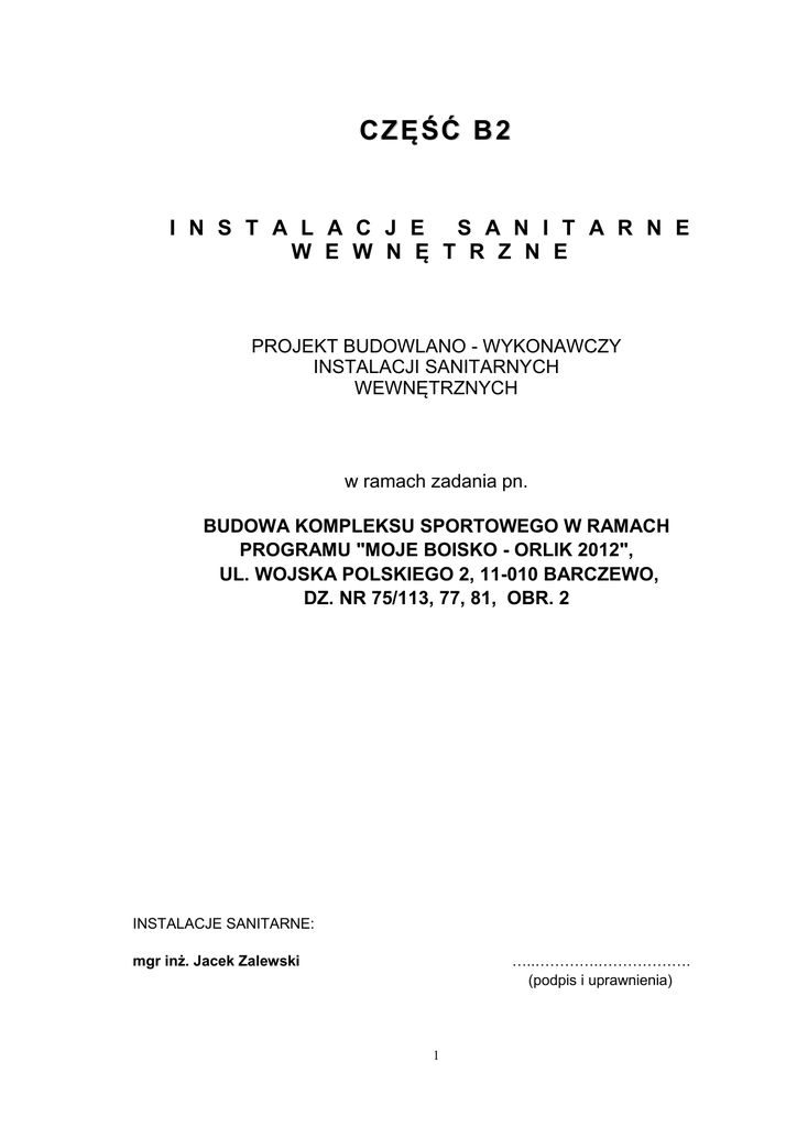 CZĘŚĆ B2 I N S T A L A C J E S A N I T A R N E W E W N Ę T R Z N E PROJEKT BUDOWLANO - WYKONAWCZY INSTALACJI SANITARNYCH WEWNĘTRZNYCH w ramach zadania pn. BUDOWA KOMPLEKSU SPORTOWEGO W RAMACH PROGRAMU "MOJE BOISKO - ORLIK 2012", UL. WOJSKA POLSKIEGO 2, 11-010 BARCZEWO, DZ. NR 75/113, 77, 81, OBR. 2 INSTALACJE SANITARNE: mgr inż. Jacek Zalewski …..………….………………. (podpis i uprawnienia) 1 Zawartość opracowania: I. Część opisowa: 1. Podstawa opracowania 2. Przedmiot opracowania i zakres prac projektowych 3. Opis techniczny 3.1 Woda zimna, ciepła 3.1.2. Mocowanie przewodów 3.1.3. Kompensacja przewodów 3.1.4. Odbiór instalacji i przekazanie do eksploatacji 3.1.5. Obliczenia 4. Kanalizacja sanitarna 5. Instalacje wentylacyjne i grzewcze 5.1 Wentylacja i ogrzewanie pomieszczeń socjalnych 6. Instalacja elektryczna i automatyka 7. Wytyczne dla branży budowlanej 8. Bezpieczeństwo użytkowania II. Część rysunkowa 1. RYS. NR 01/IS - RZUT PARTERU – INSTALACJE OGRZEWANIA I WENTYLACJI 2. RYS. NR 02/IS - RZUT PARTERU – INSTALACJE KANALIZACJI 3. RYS. NR 03/IS - RZUT PARTERU – INSTALACJE C.W.U i W.Z OPIS TECHNICZNY Instalacje sanitarne wewnętrzne BUDOWA KOMPLEKSU SPORTOWEGO W RAMACH PROGRAMU "MOJE BOISKO - ORLIK 2012", UL. WOJSKA POLSKIEGO 2, 11-010 BARCZEWO, DZ. NR 75/113, 77, 81, OBR. 2 1.Podstawa opracowania - zlecenie inwestora, - projekt architektoniczny, - wytyczne techniczne projektowania instalacji z polipropylenu, - mapa sytuacyjno-wysokościowa w skali 1:500, - wytyczne i DTR producentów urządzeń. 2. Przedmiot opracowania i zakres prac projektowych Przedmiotem opracowania jest projekt budowlany branży instalacyjnej (woda zimna, ciepła, kanalizacja, ogrzewanie i wentylacja) stanowiącej element budowy zaplecza sanitarno – szatniowego kompleksu boisk sportowych „ORLIK 2012” w Barczewie przy ul. Wojska Polskiego 2. Niniejsza część projektu zawiera: instalacje wodociągowe instalacje kanalizacji instalację ogrzewania grzejnikami zasilanymi elektrycznie (dobór mocy cieplnych dla jednostek elektrycznych) instalację urządzeń wentylacyjnych obsługujących pomieszczenia socjalne wytyczne dla branży budowlanej związane z przedmiotem tej części projektu, elementy branży elektrycznej i AKP w zakresie j.w. 3. OPIS TECHNICZNY 3.1. WODA ZIMNA, CIEPŁA Przewody wody zimnej , ciepłej projektuje się z rur z polipropylenu w systemie BOR. Do podgrzewu wody ciepłej zastosowano elektryczne pojemnościowe podgrzewacze wody, firmy GALMET o pojemności odpowiednio 3x 120 l. Do łączenia rur z PP ze sobą lub z przewodami i urządzeniami z innych materiałów należy stosować kształtki systemowe łączone przez zgrzewanie. 3 3.1.2. Mocowanie przewodów Do mocowania przewodów należy stosować uchwyty ze stali lub tworzyw sztucznych. Można również stosować uchwyty z blachy stalowej lub płaskownika lecz wtedy na całym obwodzie obejmy powinna być podkładka ochronna z gumy. Rozstaw uchwytów mocujących (przesuwnych) dla przewodów powinny wynosić odpowiednio: - dla średnicy 16 mm - 0,65 m - dla średnicy 20 mm - 0,70 m - dla średnicy 25 mm - 0,80 m - dla średnicy 32 mm - 0,90 m - dla średnicy 40 mm - 1,00 m - dla średnicy 50 mm - 1,10 m. - dla średnicy 63 mm - 1,25 m - dla średnicy 75 mm - 1,35 m 3.1.3. Kompensacja przewodów Instalacje wykonane z PP należy wyposażyć w kompensatory. Podstawową zasadą przy wbudowywaniu kompensatorów jest to, aby: a/ był umieszczony pomiędzy punktami stałymi lub dwoma odgałęzieniami, b/ w osi kompensator był mocowany punktem stałym. 3.1.4. Odbiór instalacji i przekazanie do eksploatacji Próbę szczelności instalacji należy przeprowadzić tak jak przy odbiorze instalacji z materiałów tradycyjnych, tj. zgodnie z normą PN-81/B-10700. Próbę szczelności należy poprzedzić napełnieniem instalacji wodą poprzez zainstalowany filtr siatkowy zatrzymujący cząstki stałe , co zapobiega niszczeniu ochronnej warstwy tlenowej. Po przeprowadzeniu próby ciśnieniowej instalacja musi być wypłukana w celu usunięcia zanieczyszczeń montażowych. Instalację należy płukać wodą przepuszczaną przez filtr siatkowy. Na wejściu do budynku za wodomierzem należy zabudować zawór antyskażeniowy typu BA2760 firmy DANFOSS SOCLA. 3.1.5. Obliczenia Obliczenie przepływu miarodajnego Przepływ obliczeniowy w budynku obliczono zgodnie z wytycznymi normy PN92/01706 *Instalacje wodociągowe *.Wymagania w projektowaniu. Przepływ obliczeniowy dla budynku obliczono wg wzoru: q = 0,4 x ( qn )0,54 +0,48 dm3/s w którym : qn - normatywny wypływ z punktów czerpalnych , dm3/s ZESTAWIENIE NORMATYWNYCH WYPŁYWÓW Z PKT. CZERP. BUDYNEK SOCJALNY WC - 4 x 0,13 = 0,52 umywalka - 4 x 0,07 = 0,28 zaw. czerp. - 3 x 0,30 = 0,90 pisuar - 1 x 0,13 = 0,13 natrysk - 3 x 0,15 = 0,45 ........................................ 2,28 Ogółem qn =2,28 dm3/s Przepływ obliczeniowy dla obiektu wynosi, przy założeniu 0,7 współczynnika nierównomierności poboru wody: q = 1,60 dm3/s Dobór wodomierza Umowny przepływ obliczeniowy dla wodomierza wynosi: Qw = 2 x q = 2 x 1,60 dm3/s = 3,20 dm3/s = 11,50 m3/h Porównanie otrzymanej wartości umownego przepływu obliczeniowego z wartościami Qn dla wodomierzy wskazuje na konieczność doboru wodomierza o średnicy nominalnej dn =32 mm , dla którego Qn = 6,0 m3/h. Qmax = 12,0 m3/h Dobrano wodomierz firmy PoWoGaz typ JS DN32 Qs=6,0 m3/h 4. Kanalizacja sanitarna Wewnętrzna instalacja kanalizacyjna charakteryzująca się grawitacyjnym spływem ścieków wymaga wymuszonej lokalizacji przewodów fragmentów instalacji w budynku, stwarzając dla poszczególnych odmienne warunki eksploatacji. Przewody kanalizacji wewnętrznej projektuje się z tworzywa sztucznego. Prowadzone są one pod posadzką podłogi zgodnie z wymaganiami normy. Zagadnienie wydłużeń liniowych przewodów kanalizacyjnych z PVC nie może być pominięte w montażu. Zagadnienie to dla przewodów kanalizacyjnych